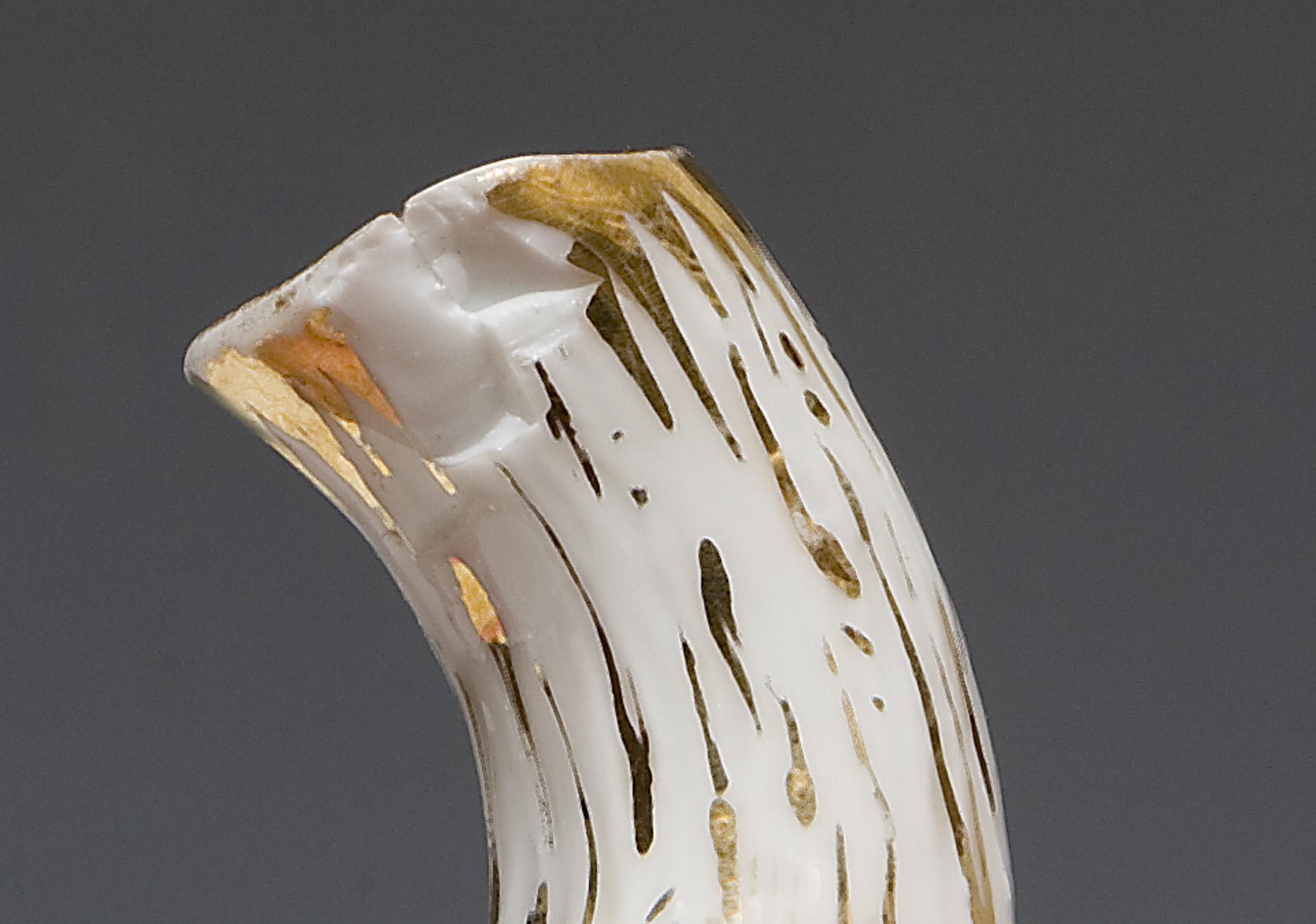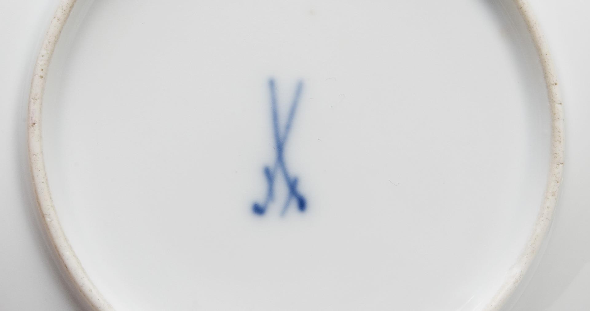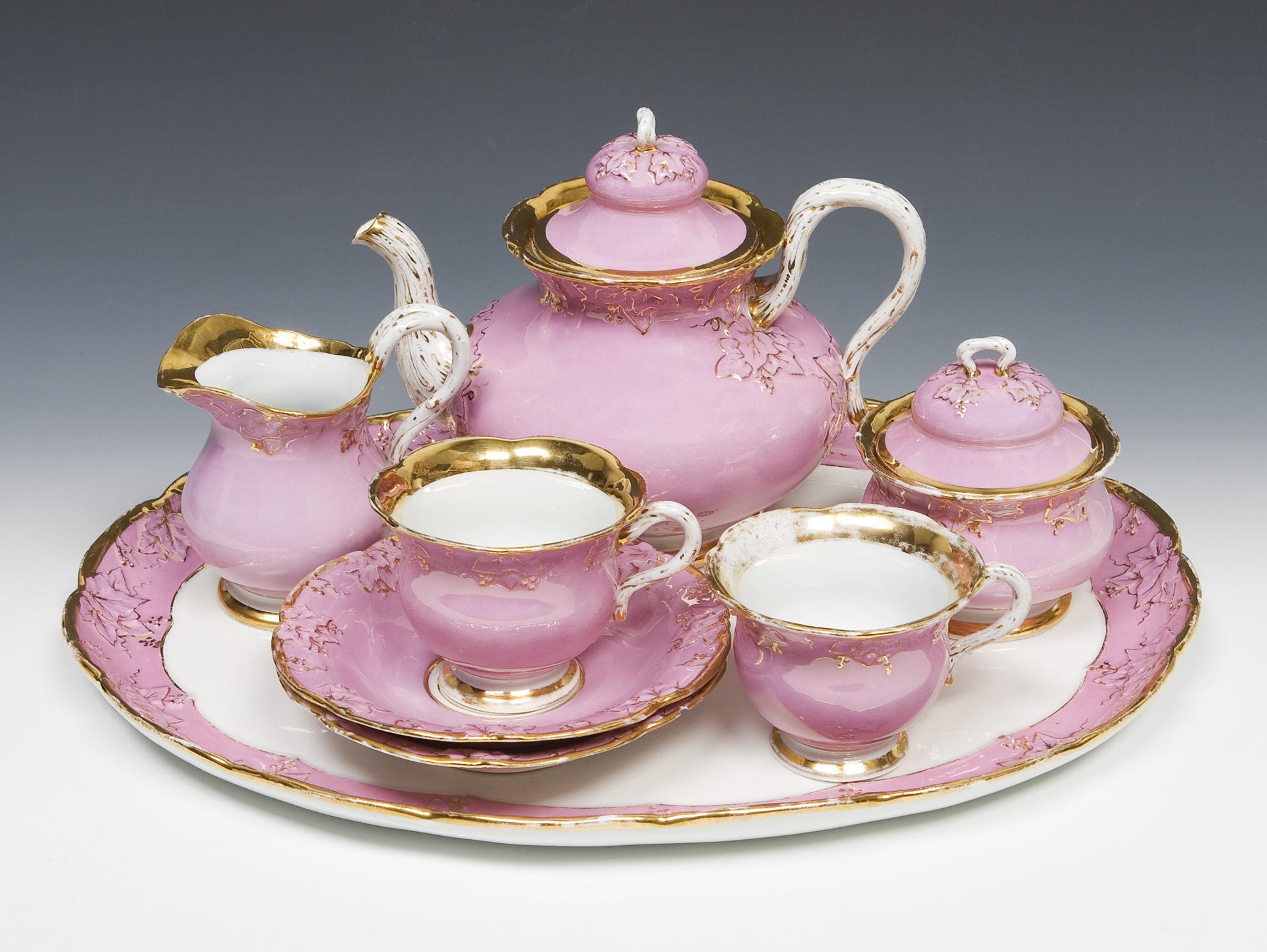 Model by Ernst August Leuteritz and coworkers 1855-1860. 8 parts: Tray, coffee pot, milk jug, sugar bowl, 2 coffee cups, 2 saucers. Gold painted ivy relief, gold staffage. Press marks, incised marks, painter's mark, sword marks. Gold in places, one lip heavily rubbed, tray rim, tubular spout, one saucer rim bumped from below.