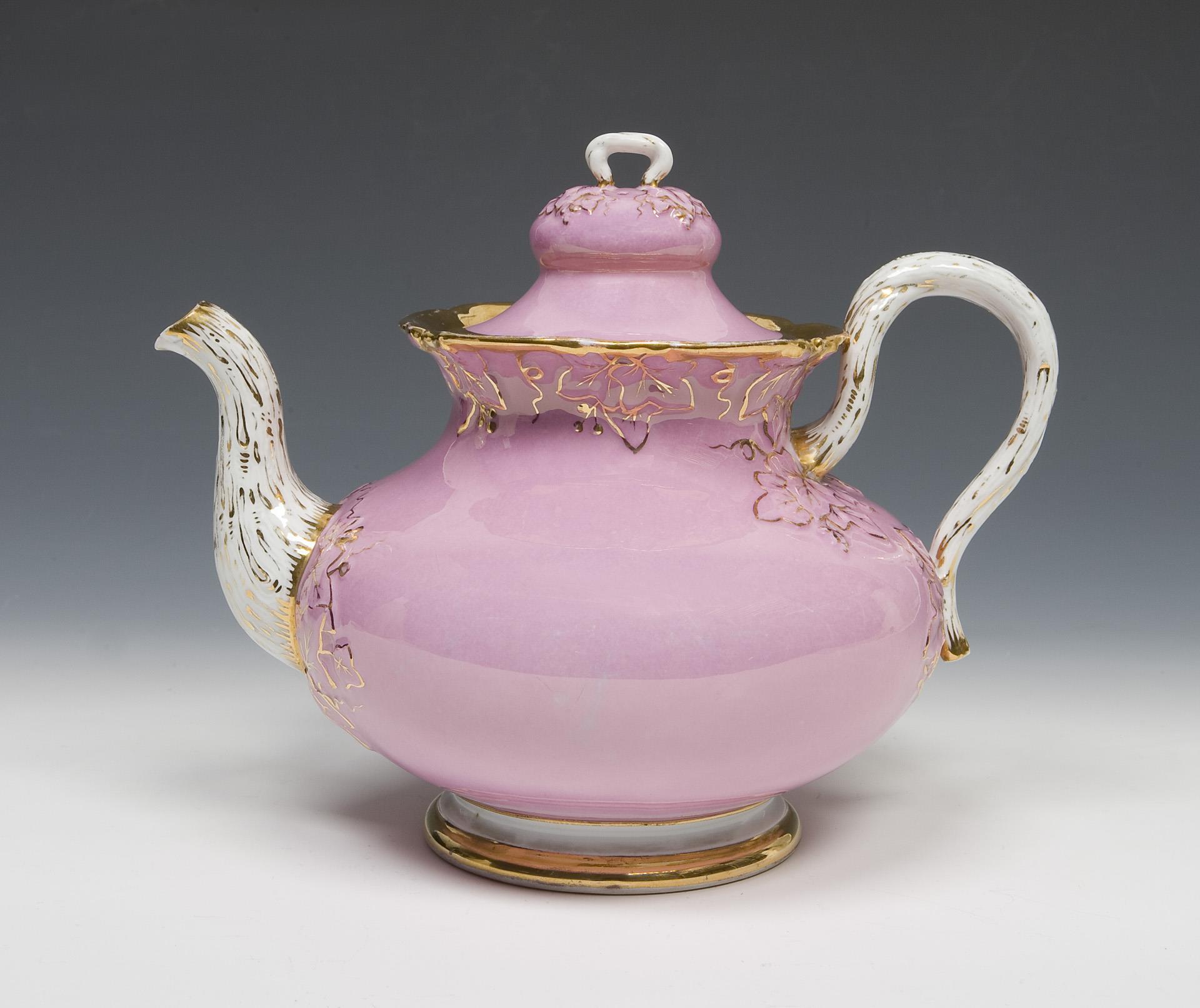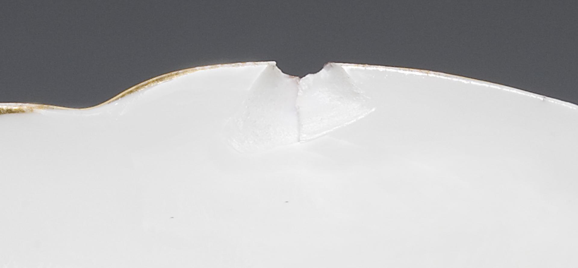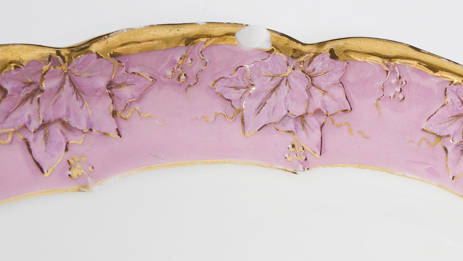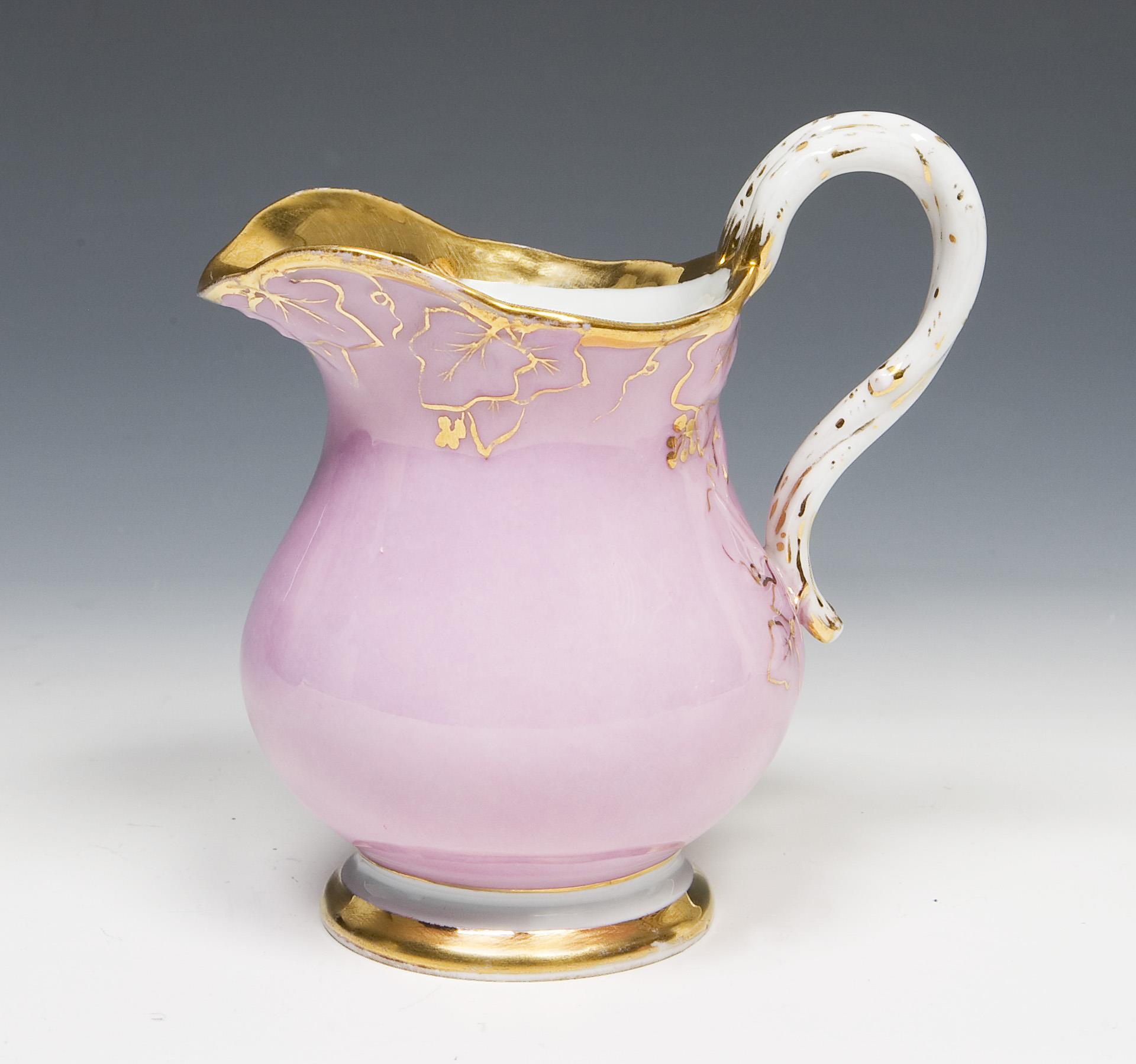 Model by Ernst August Leuteritz and coworkers 1855-1860. 8 parts: Tray, coffee pot, milk jug, sugar bowl, 2 coffee cups, 2 saucers. Gold painted ivy relief, gold staffage. Press marks, incised marks, painter's mark, sword marks. Gold in places, one lip heavily rubbed, tray rim, tubular spout, one saucer rim bumped from below.