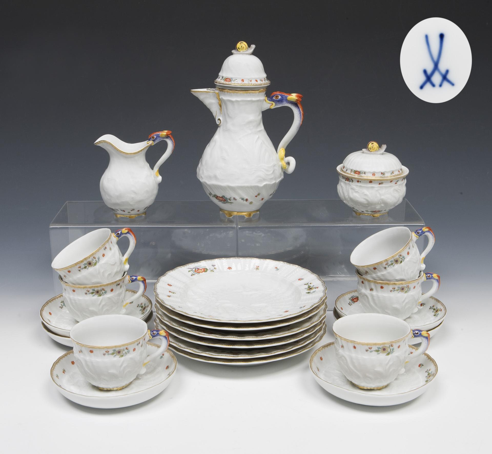 Model by Johann Joachim Kaendler and Johann Friedrich Eberlein 1737-1741. The entire surface in relief, swans and herons on wavy shell ribs, reeds, shells and vine leaves in the water. Decor no. 397152, colored painting with Indian flowers, colored and gold painted. Jugs and cups with dolphin handles, lids with sculpted scroll pommel. 21 pieces: Mocha pot, milk jug, sugar bowl, 6 mocha cups, 6 saucers, 6 dessert plates. Press marks, painter's marks, sword marks.