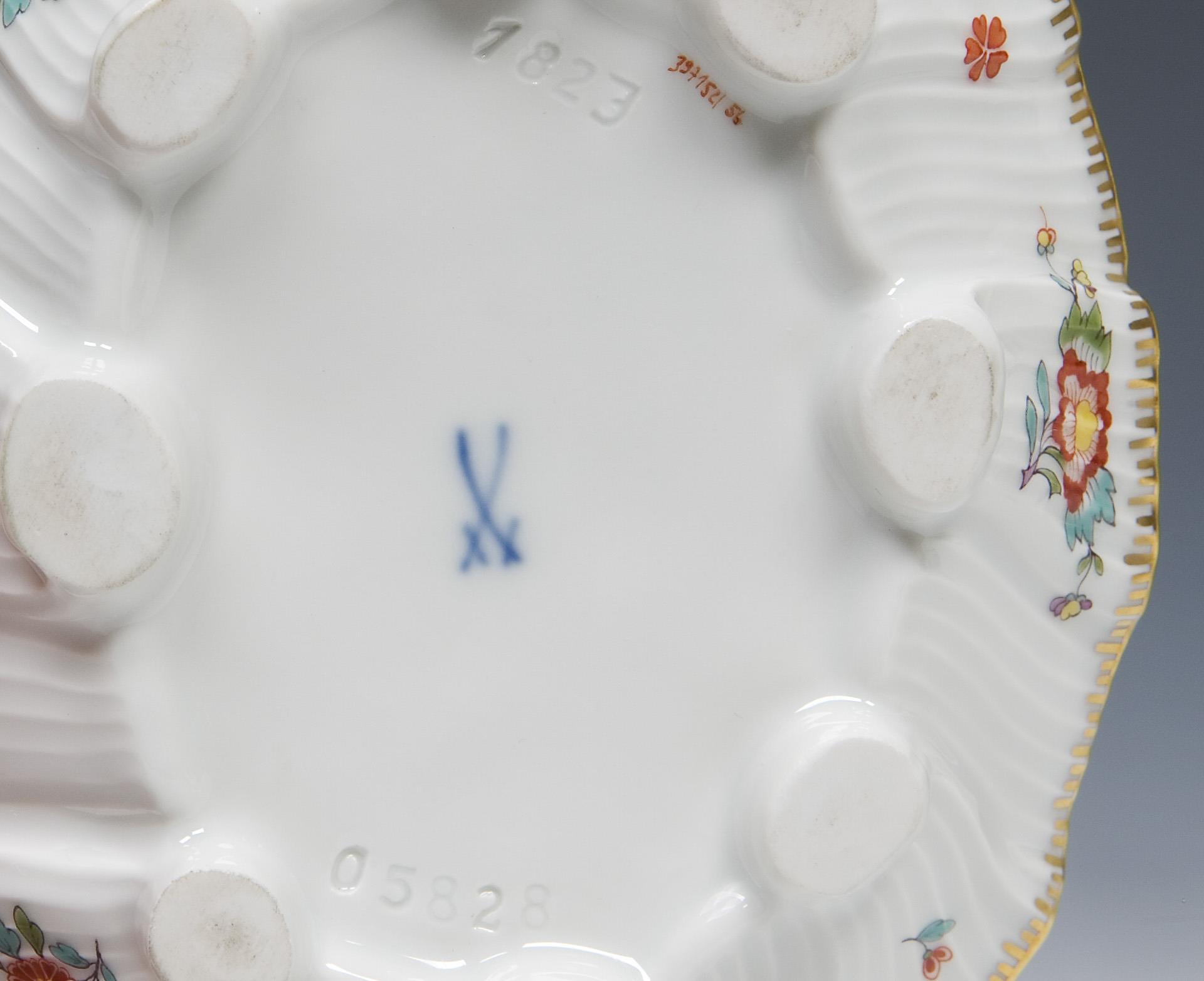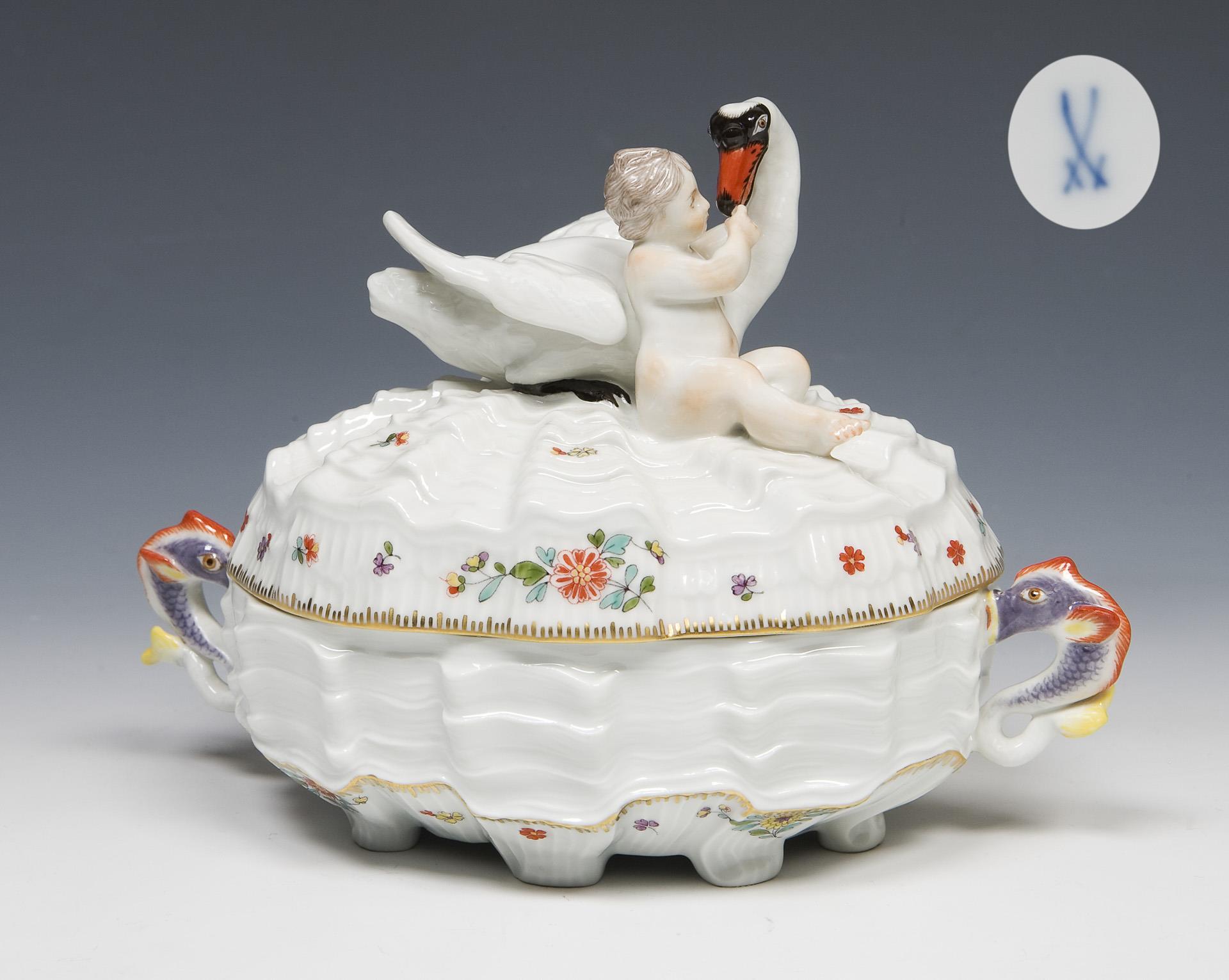 Model by Johann Joachim Kaendler and Johann Friedrich Eberlein 1737-1741. The entire surface in relief with wavy shell ribs. Decor no. 397152, colored painting with Indian flowers, colored and gold painted. Two dolphin handles on the side. Press marks, painter's mark, sword mark.