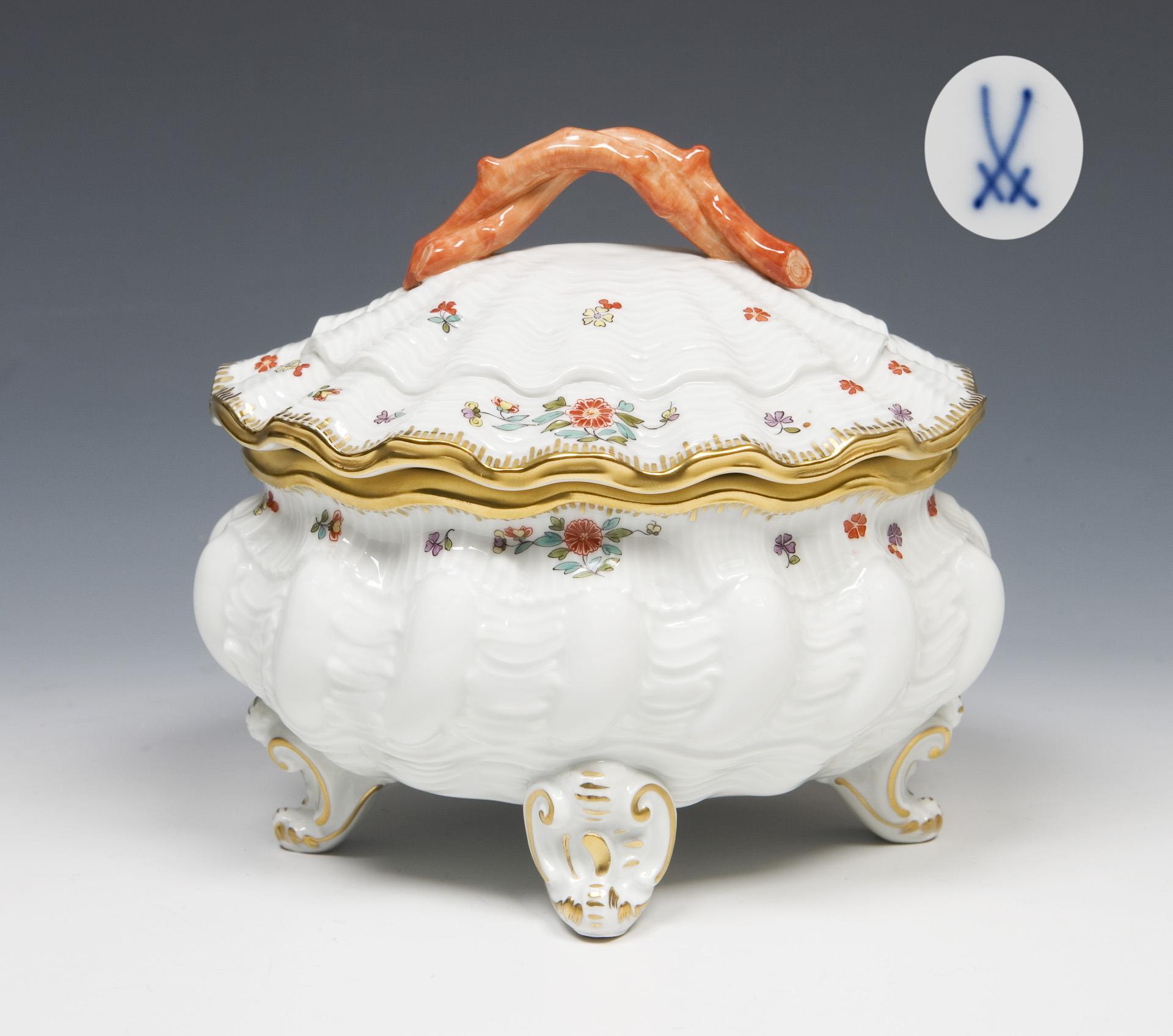 Model by Johann Joachim Kaendler and Johann Friedrich Eberlein 1737-1741. The entire surface in relief with wavy shell ribs. Decor no. 397152, colored painting with Indian flowers, painted coral red and gold. Press marks, painter's mark, sword mark.