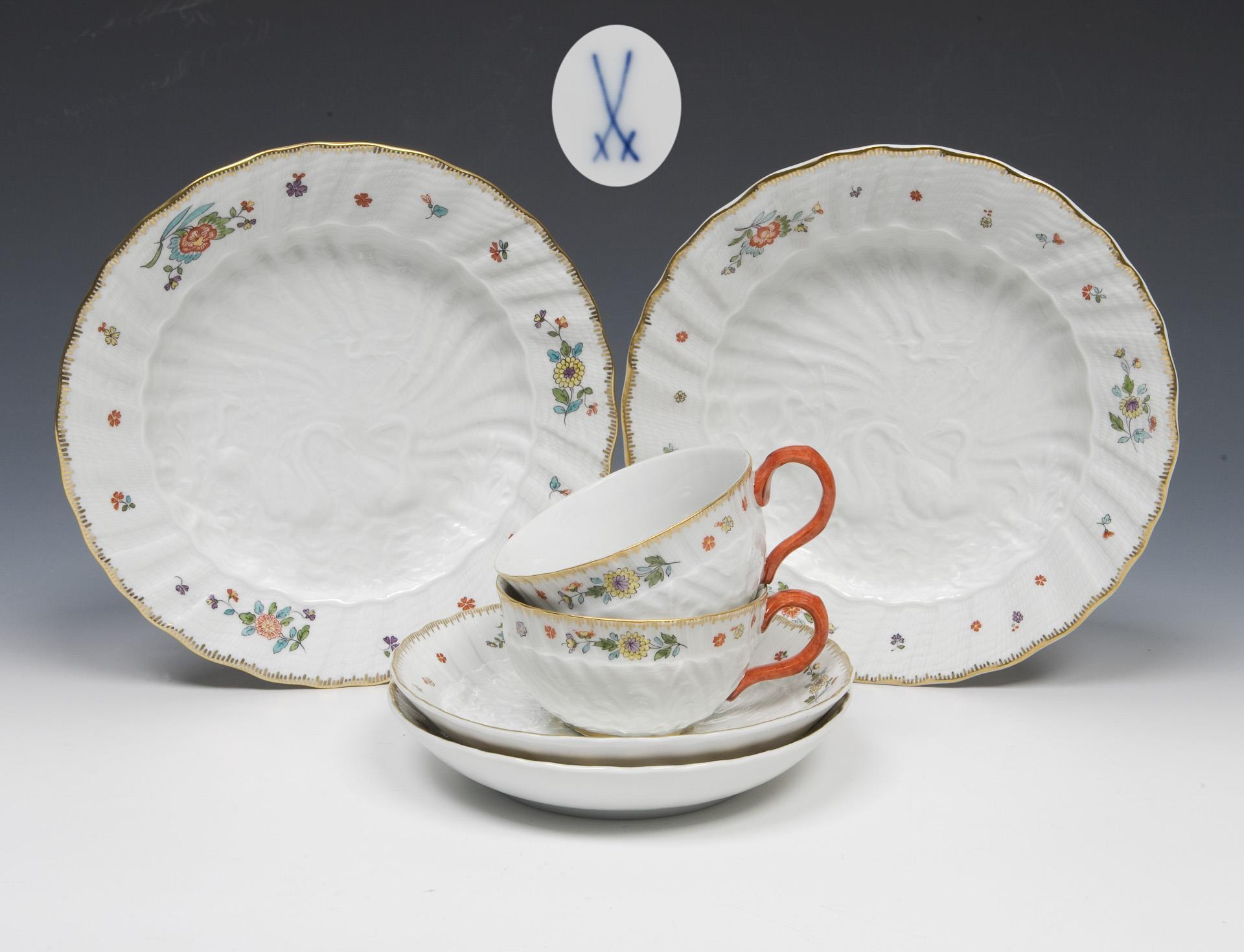 Model by Johann Joachim Kaendler and Johann Friedrich Eberlein 1737-1741. The entire surface in relief, swans and herons on wavy shell ribs, reeds, shells and vine leaves in the water. Decor no. 397152, colorful painting with Indian flowers, coral red and gold painted. Cups with branch handles from 1963 (rare, no longer in the assortment). Painter's marks, press marks, sword marks.