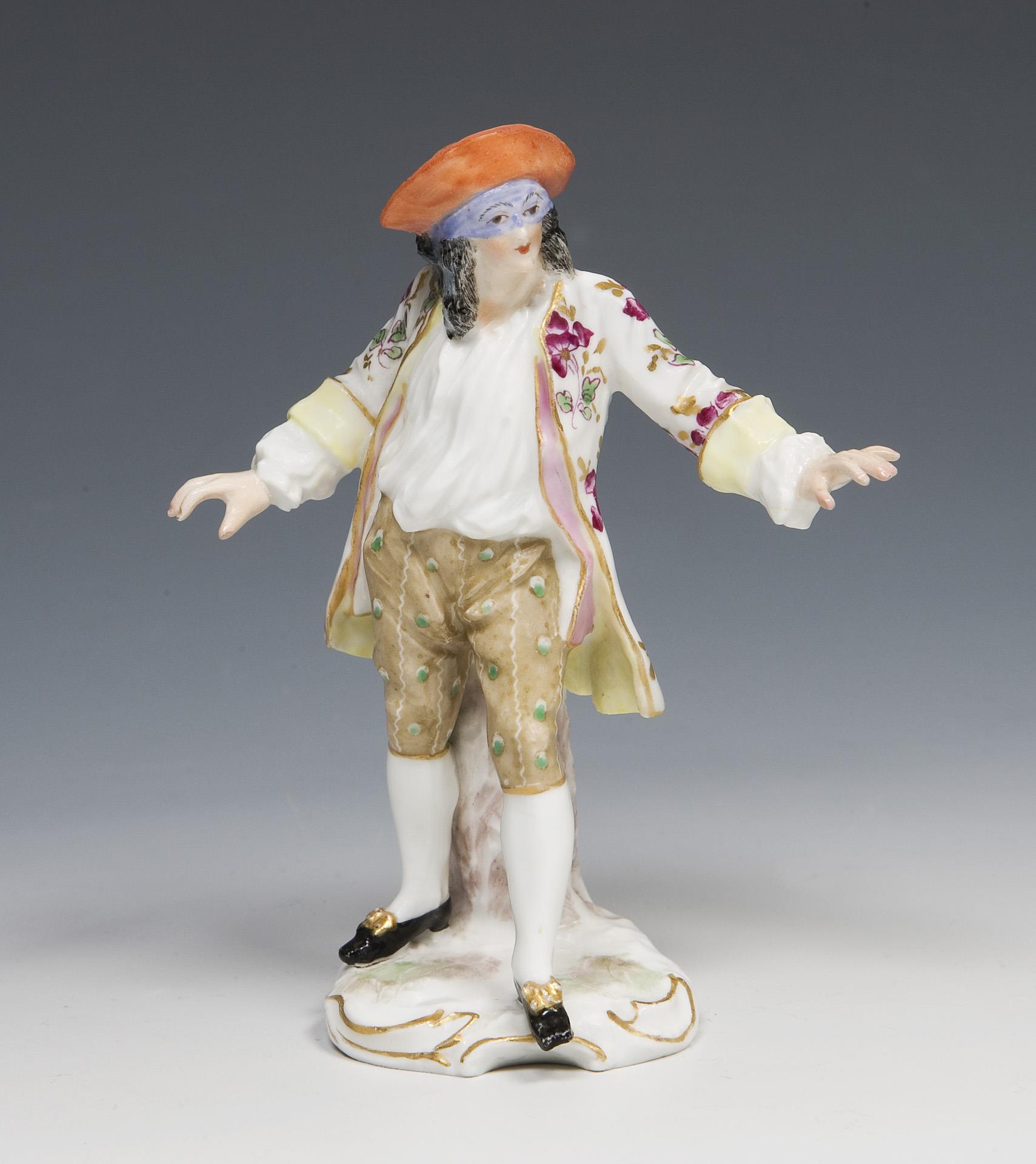 Delicate standing figure with eye mask, painted in color, painted gold. Unglazed base, impressed mark, indistinct blue mark on the base. Hat, hands restored, one finger bumped.