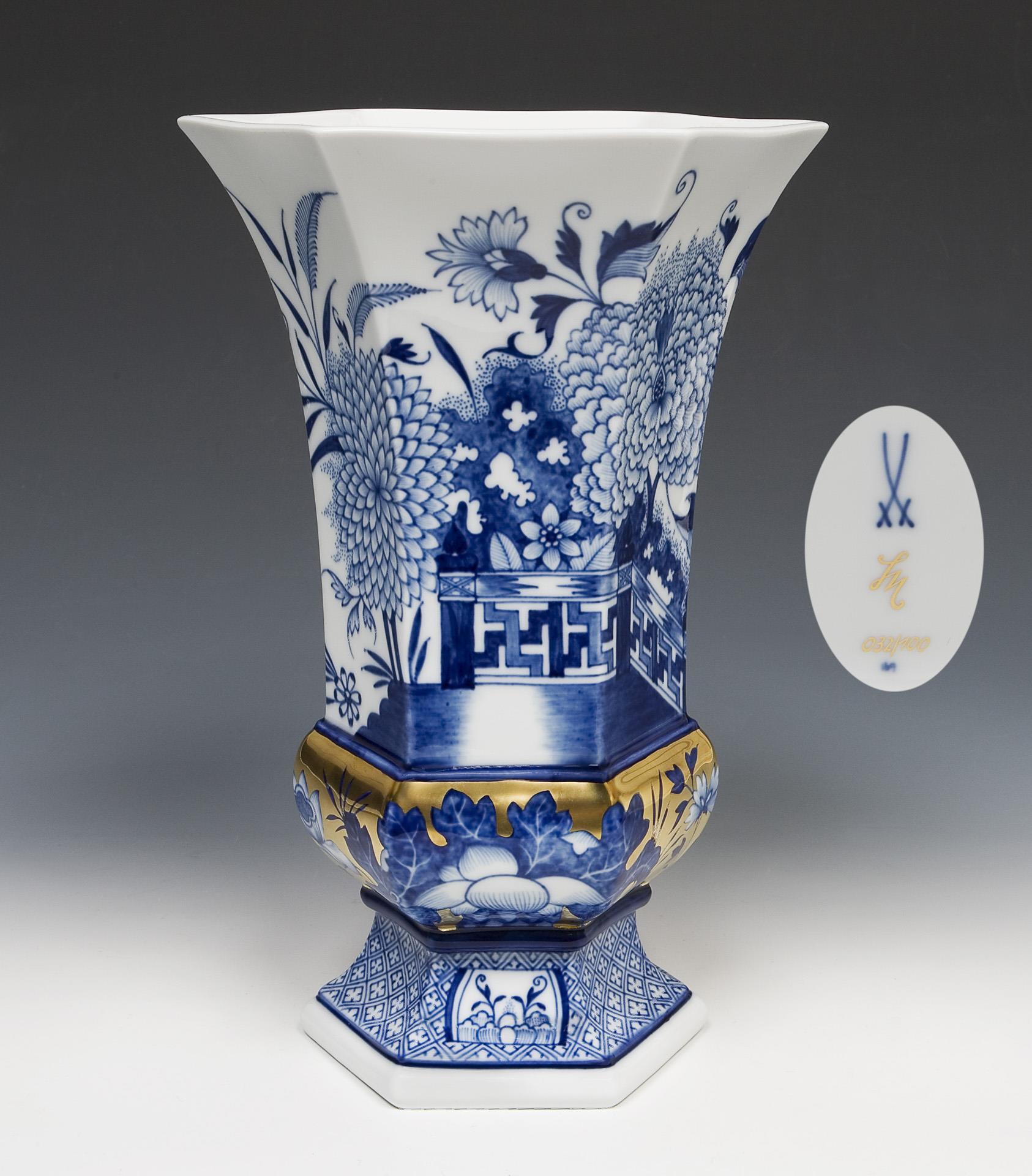 Limited edition, numbered 32/100, decor no. 204990, cobalt blue underglaze painting all around, decor "fence with Indian flowers" and diamond border, partial gold fond, hexagonal body. Press mark, painter's mark, sword mark, gold special signet.