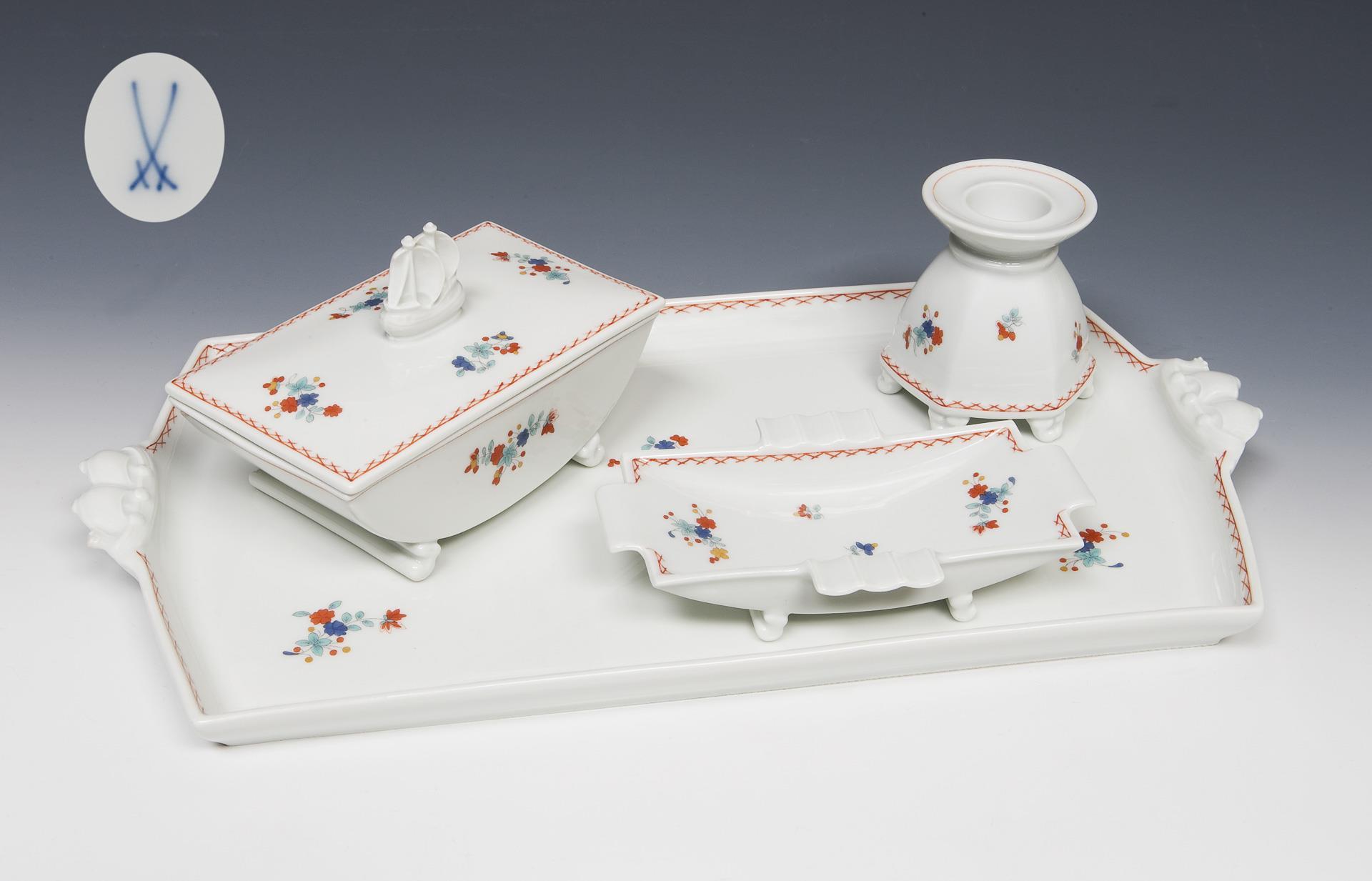 Model year: 1940. 4 parts: Tray, cigarette box, ashtray, candlestick. Colored painting with Indian flowers and ornamental borders. Tray with unglazed base, impressed marks, painter's marks, sword marks. One minimal corner of the tray handle restored.
