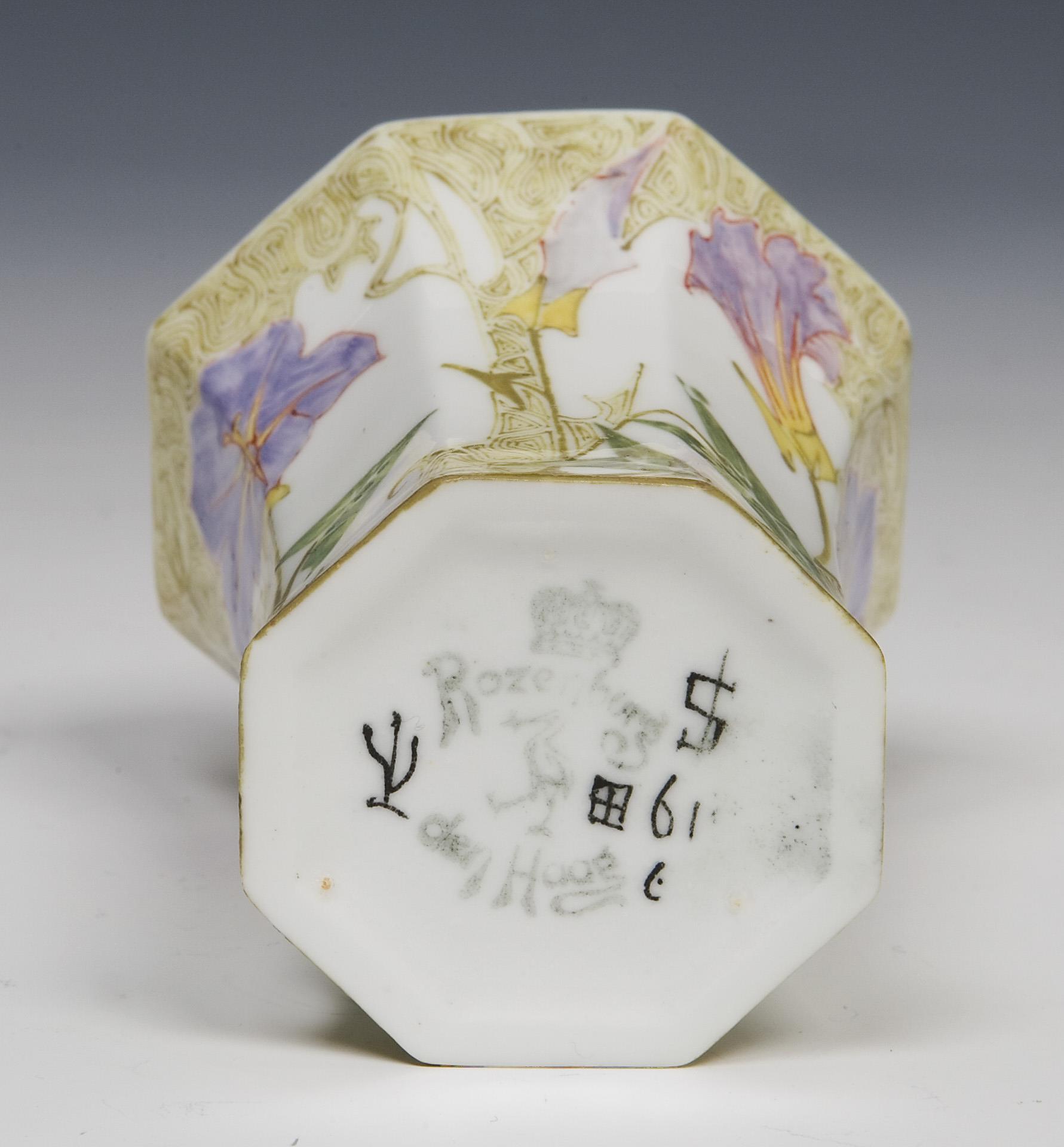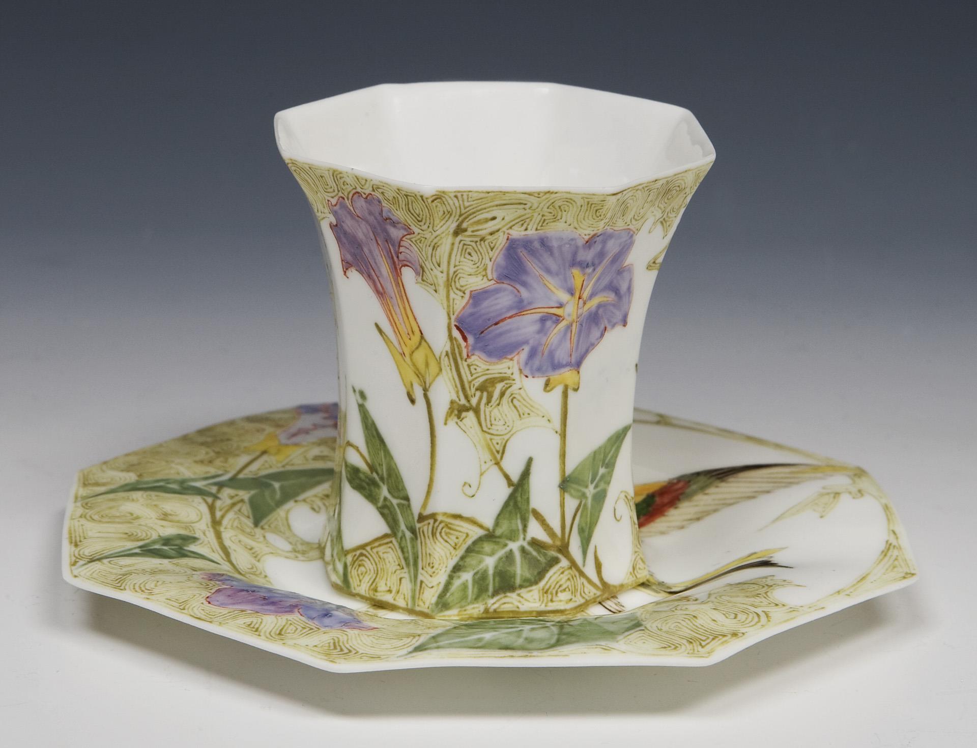 Wafer-thin, so-called eggshell porcelain. Colorful painting by Samuel Schellinck "flower and bird decoration", octagonal shape. Green bottom mark with stork, painter's signature and order number 615, year mark in black.