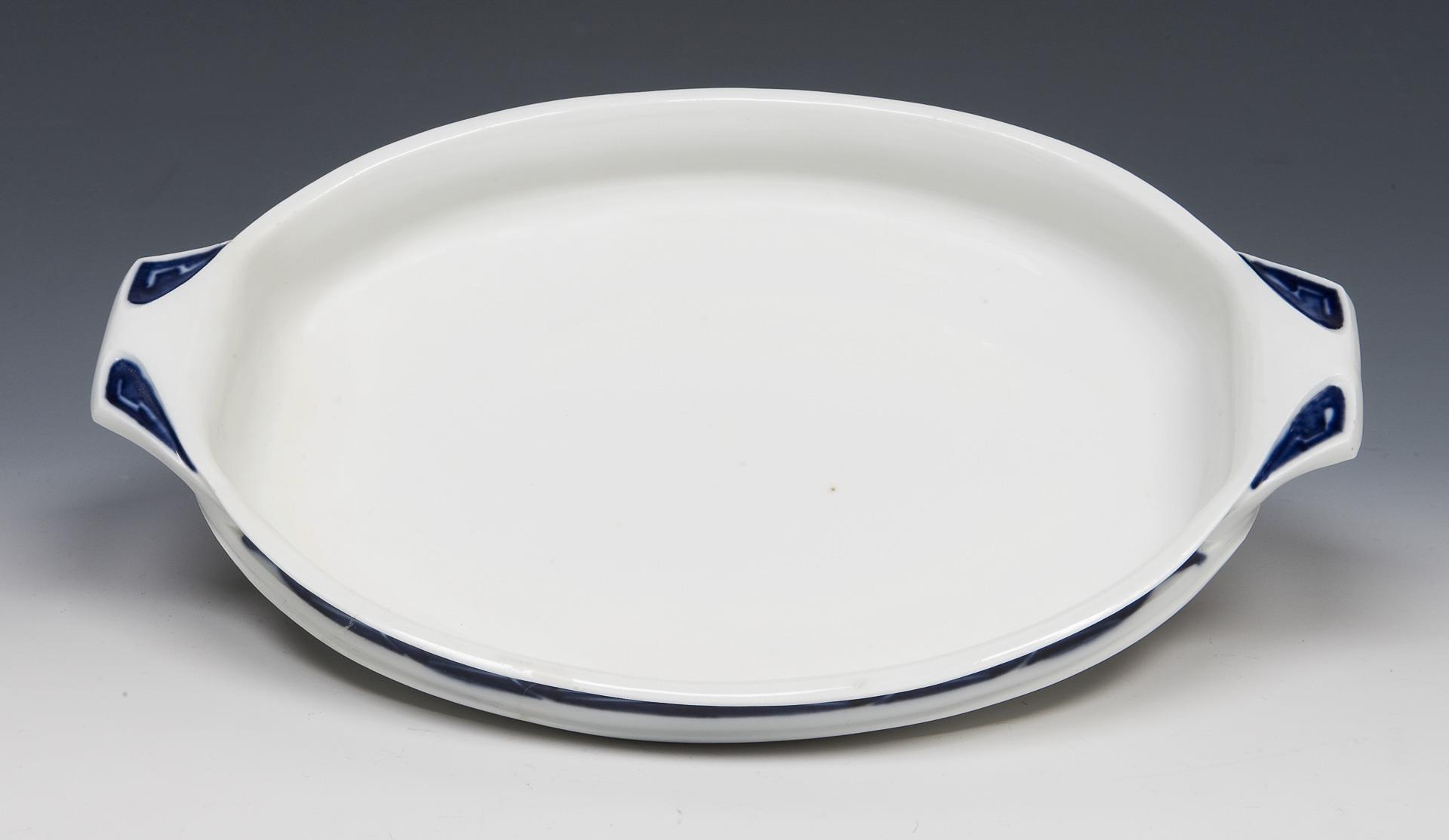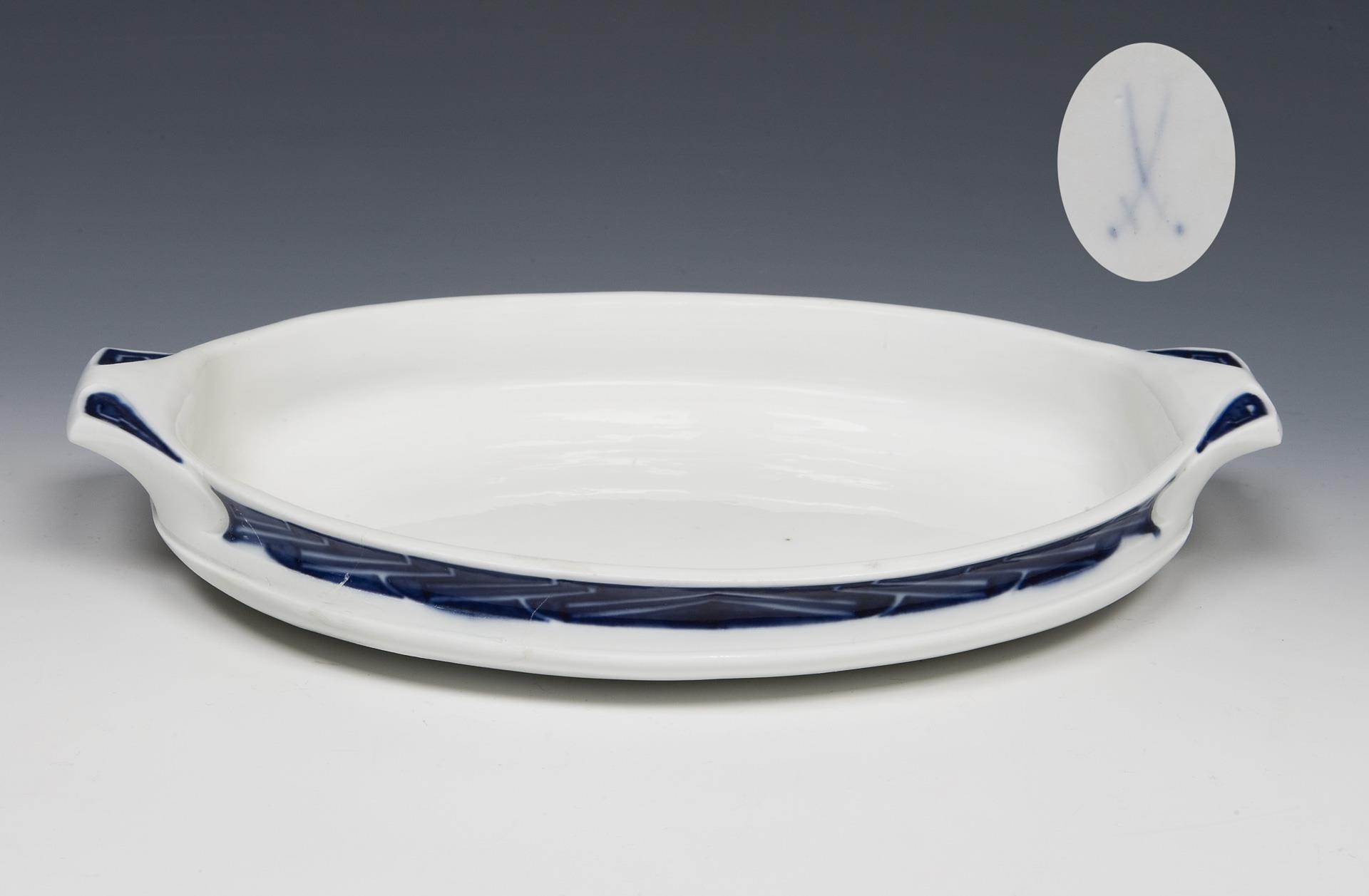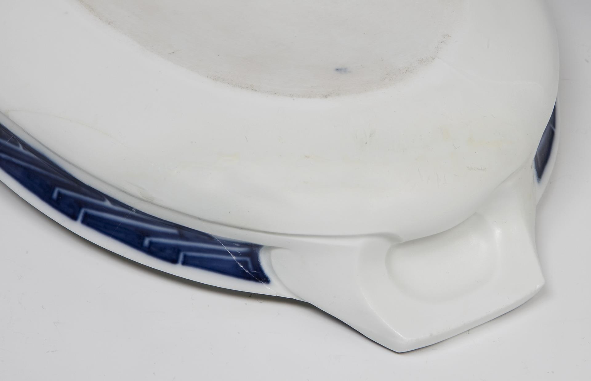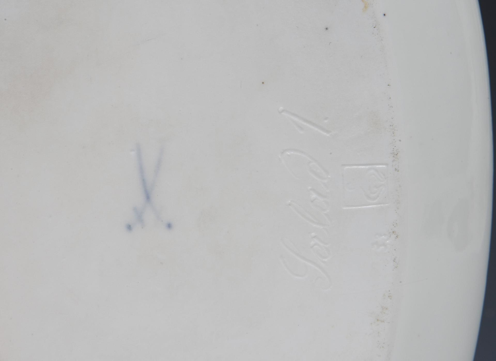 Model year: 1903, cobalt blue underglaze painting, unglazed base, impressed mark, painter's mark, incised lettering "Salad 1", sword mark, artist's signet. One third of the side visibly restored.