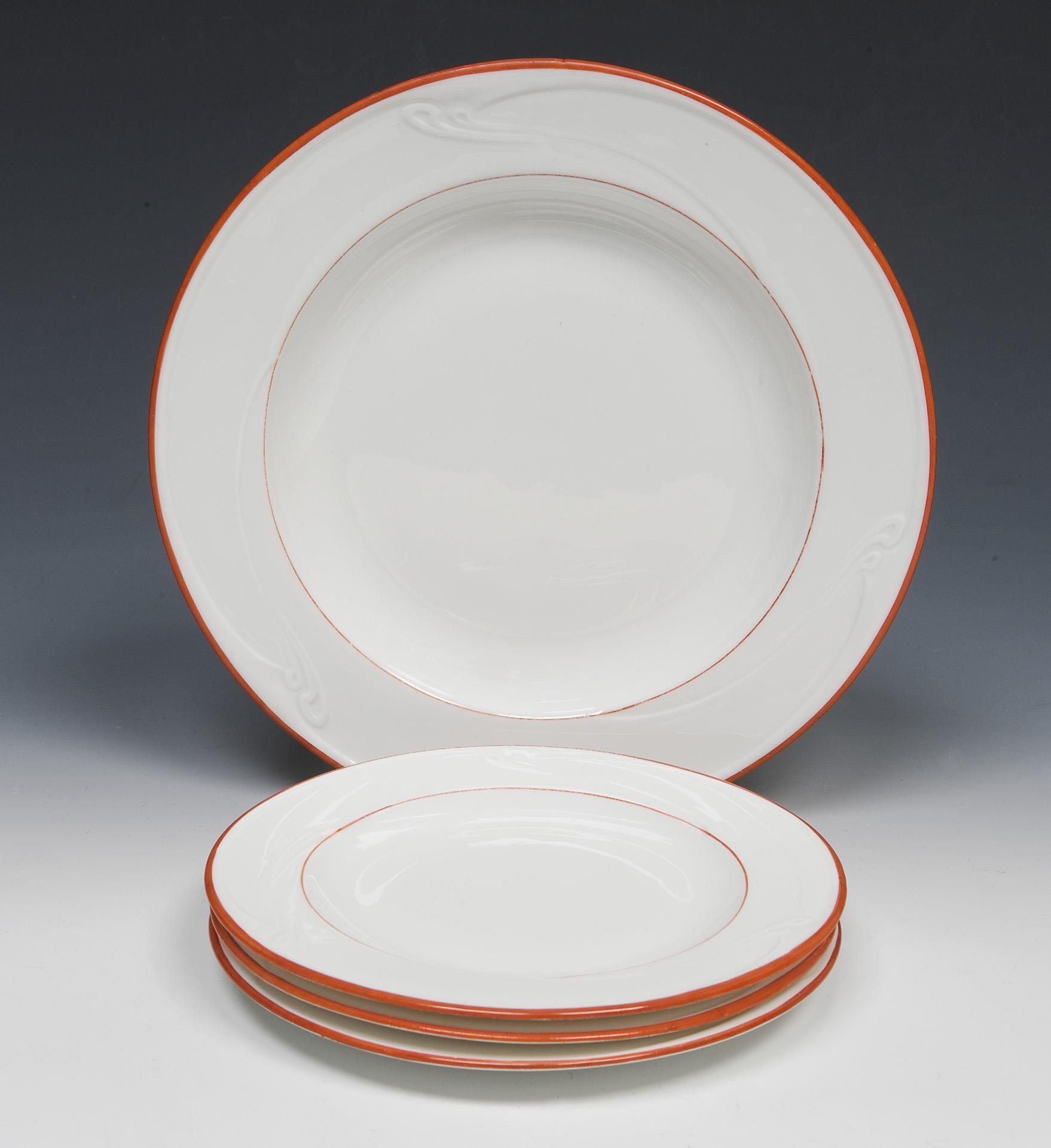 Model year: 1903, painted coral red, wavy lines in relief, so-called "whiplash", pressed marks, sword marks painted four times, each plate with artist's signet.