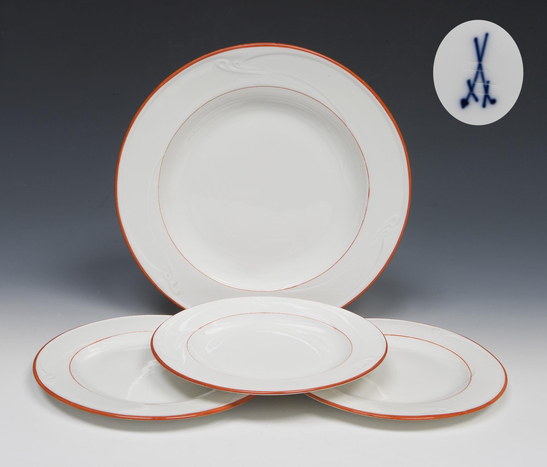 Art Nouveau menu plate, 3 dessert plates. Meissen.