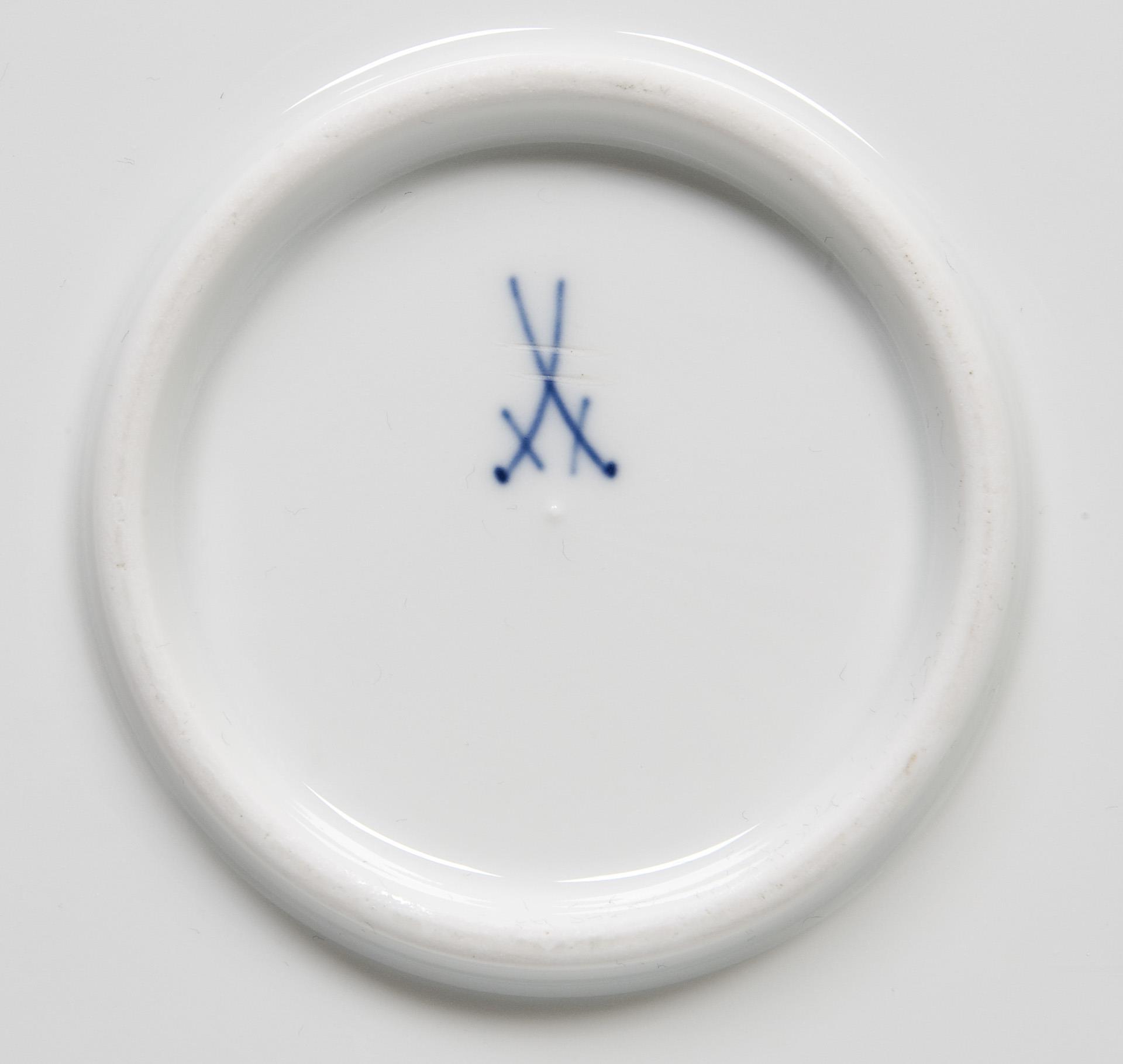 Model year: 1904, cobalt blue underglaze painting, pearl rims in relief. Incised marks, pressed mark, painter's marks, sword marks, one sword mark crossed out twice.