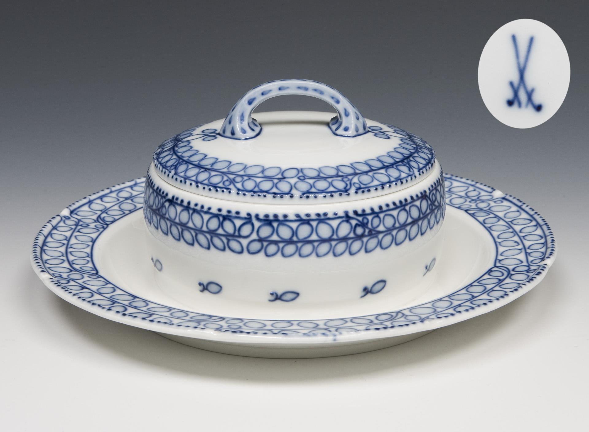 Model year: 1904, cobalt blue underglaze painting, pearl rims in relief. Press marks, painter's mark, sword mark.