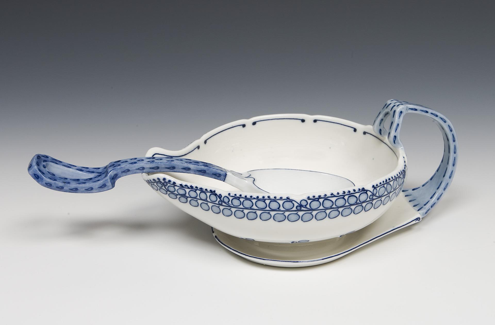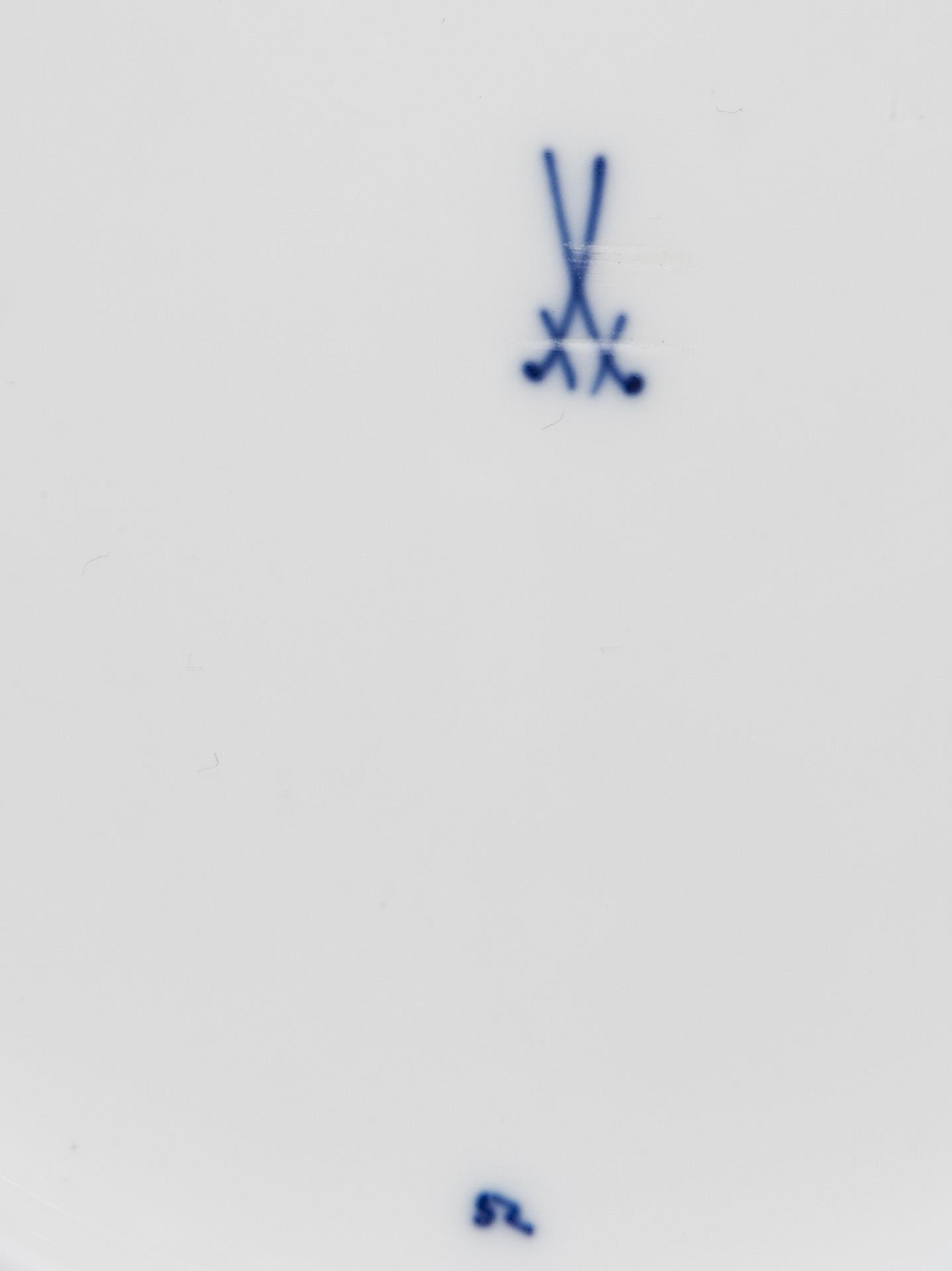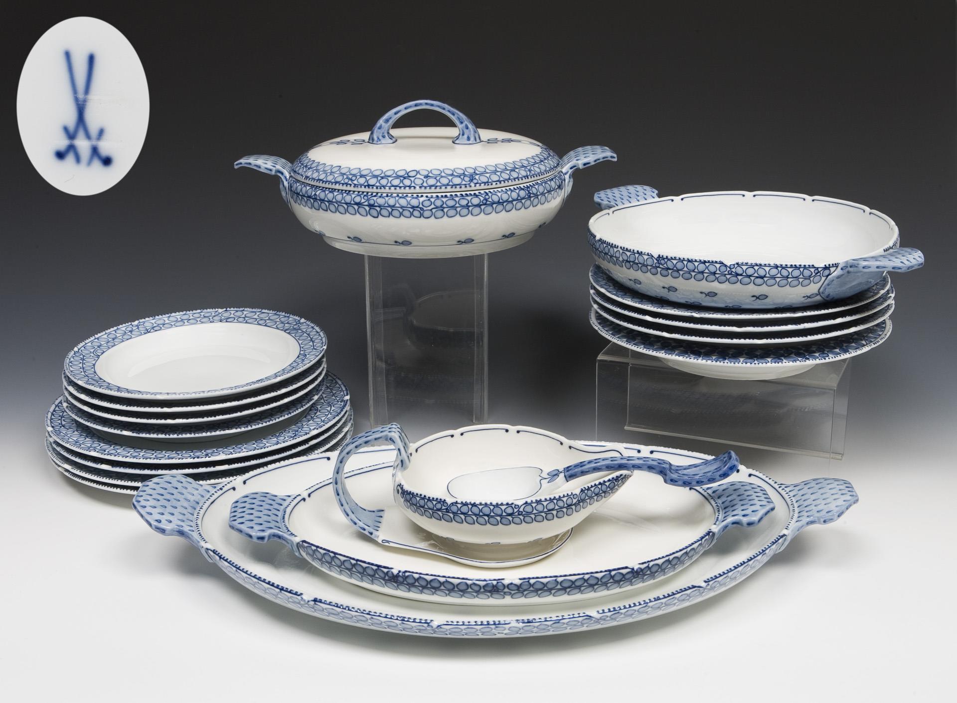 Model year: 1904, cobalt blue underglaze painting, pearl rims in relief. 18 pieces: 1 lidded bowl, 2 oval plates, 1 round bowl, 1 sauce boat, 1 ladle, 4 dinner plates, 4 soup plates, 4 dessert plates. Painter's marks, impressed marks, crossed swords marks painted twice, one soup plate painted four times. One inner rim of bowl slightly chipped, one plate stand ring chipped.