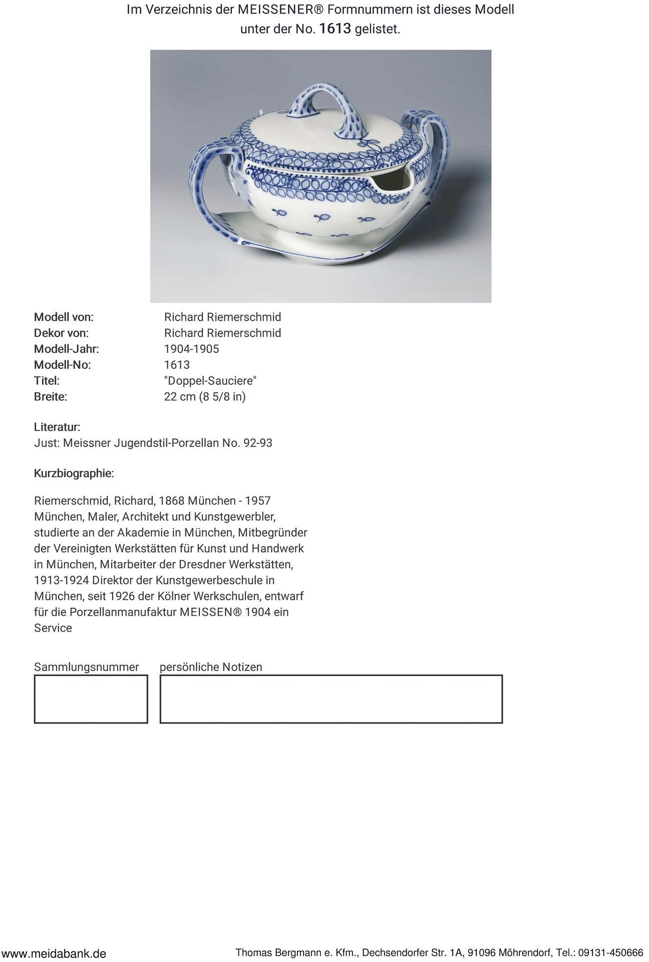 Riemerschmid, painter, architect and craftsman, studied at the academy in Munich. Co-founder of the Vereinigte Werkstätten für Kunst und Handwerk in Munich, employee of the Dresdner Werkstätten, 1913-1924 director of the Kunstgewerbeschule in Munich, since 1926 of the Kölner Werkschulen * Partner auction Bergmann.