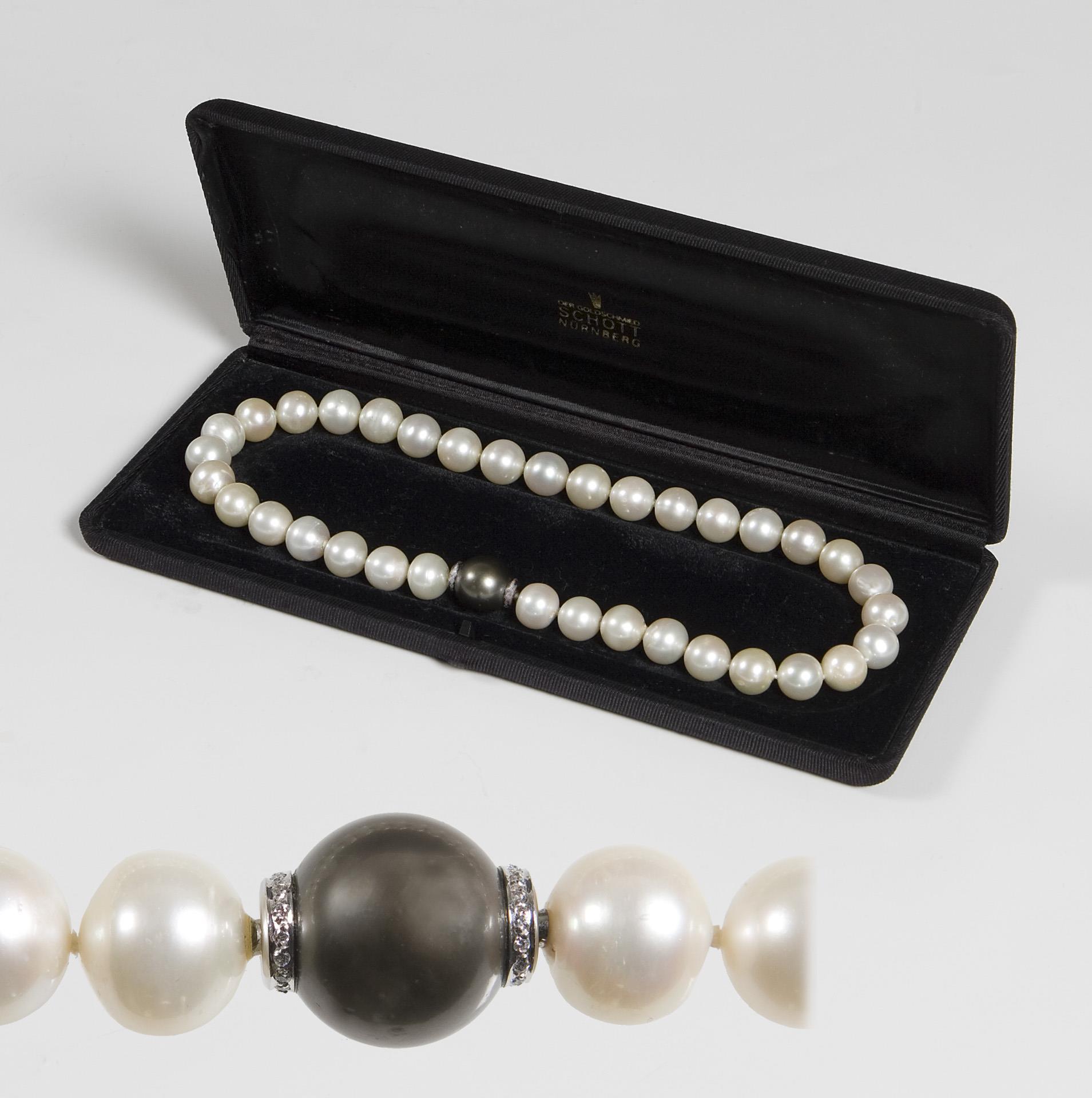 34 freshwater cultured pearls ø 12-13 mm. Bayonet clasp with Tahiti cultured pearl ø 15 mm, set in 750 white gold (18 ct) with small brilliant-cut diamonds 0.18 ct, fine white, vvsi (very very small inclusions). With expertise dated 08.06.2007, value: 2780,- Euro.