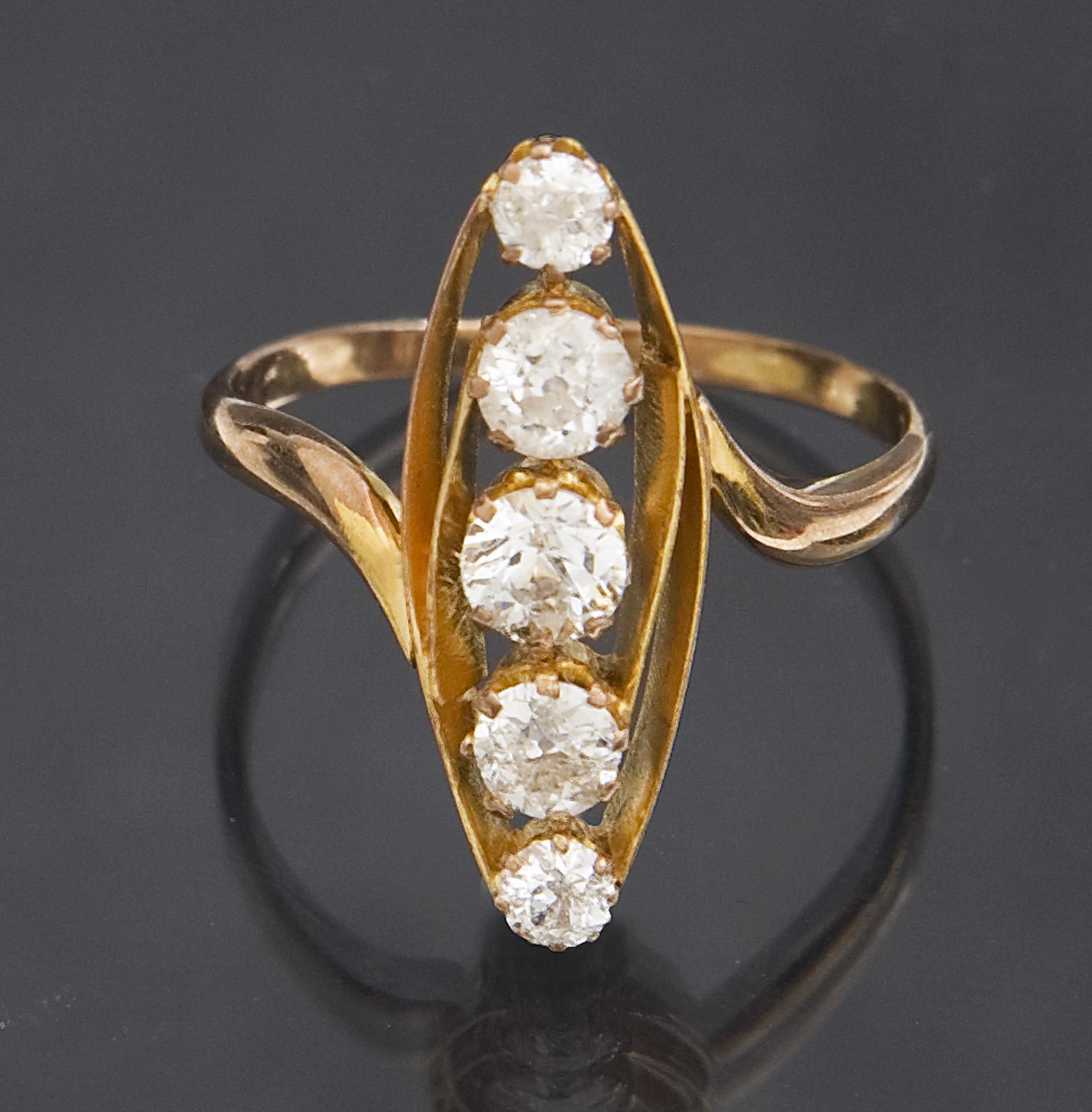 5 diamonds, approx. 0.85 ct, partly with clear inclusions, in prong settings, open-worked, stable shank. Hallmarks: Fineness.