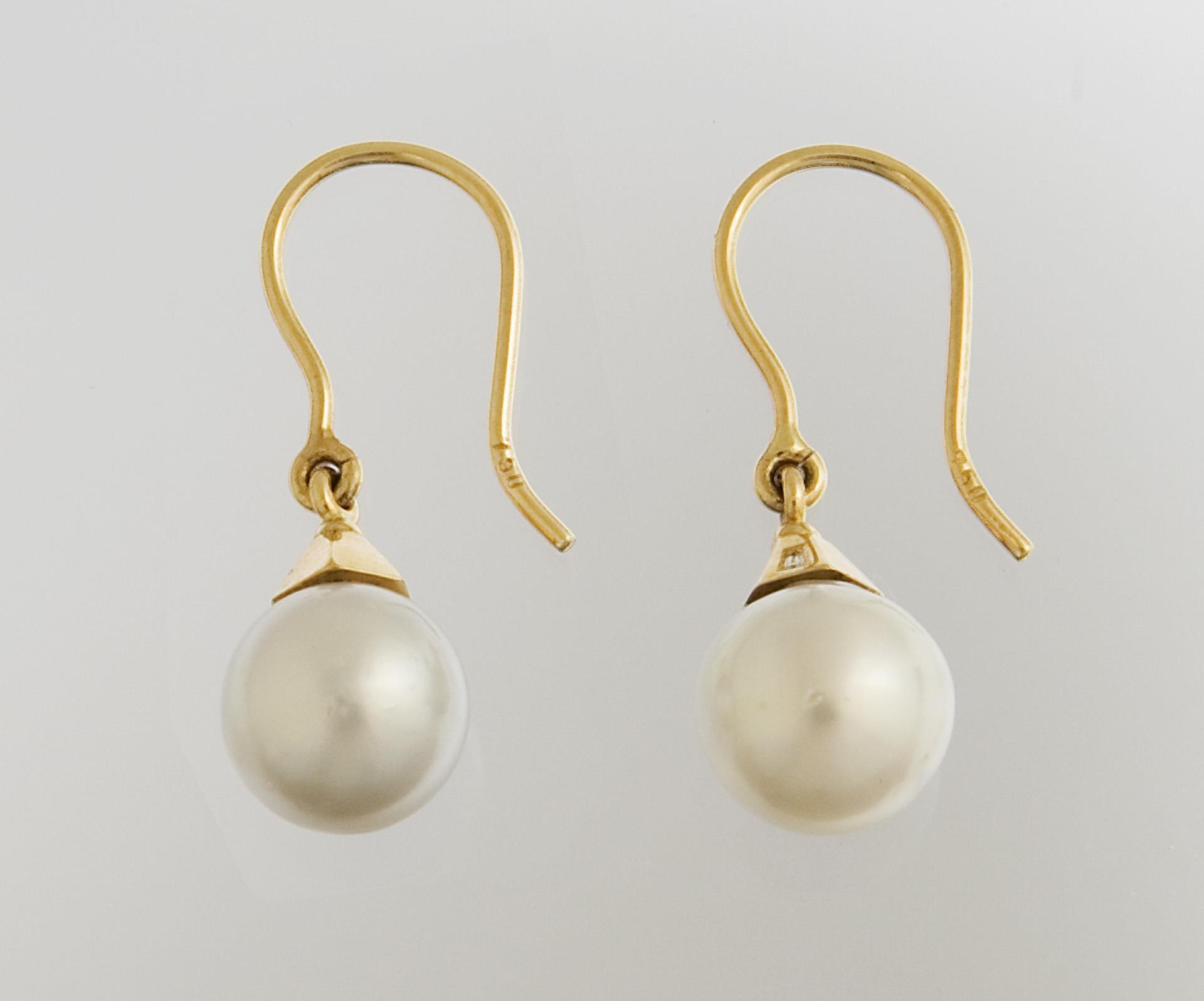 2 South Sea cultured pearls with good lustre approx. 9 mm, 6 small diamond baguettes 0.074 ct top wesselton-si. Hallmarks: Fineness.