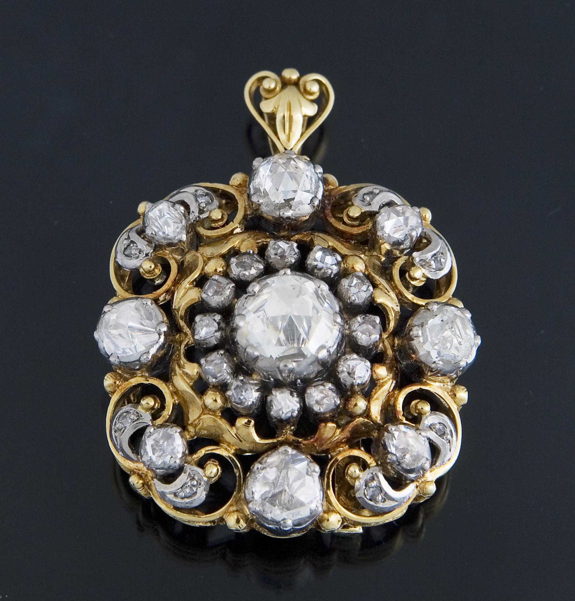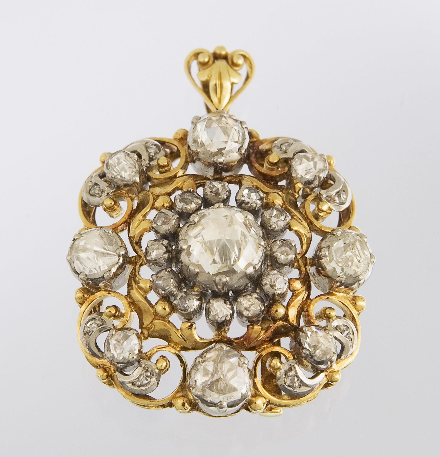 5 large diamonds, 4 medium diamonds, 20 small diamonds with good brilliance totaling 5.5 ct Wesselton to top crystal-pique. Slightly domed, open-worked shape. With movable eyelet, can also be worn as a pendant. Hallmarks: Fineness, jeweler's mark.