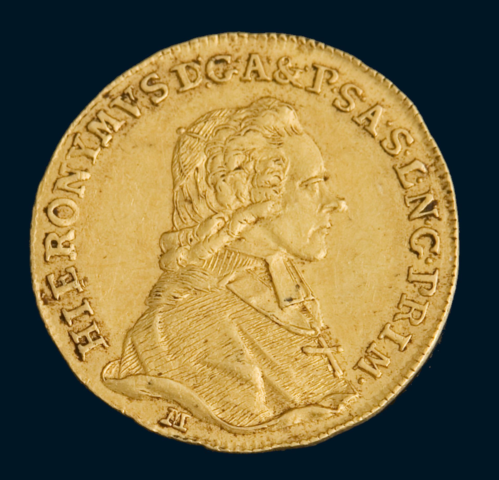 Archbishop Hieronymus von Colloredo, 1775-1803 the last reigning prince-archbishop of the archbishopric of Salzburg. Gold ducat 1788 M. With small card: Freigabe der Reichsbank mit Sammlerwert für Sammlerzwecke, Berlin 1941 von Otto Helbing Nachfolger, München. Margins out of round, partially wavy.