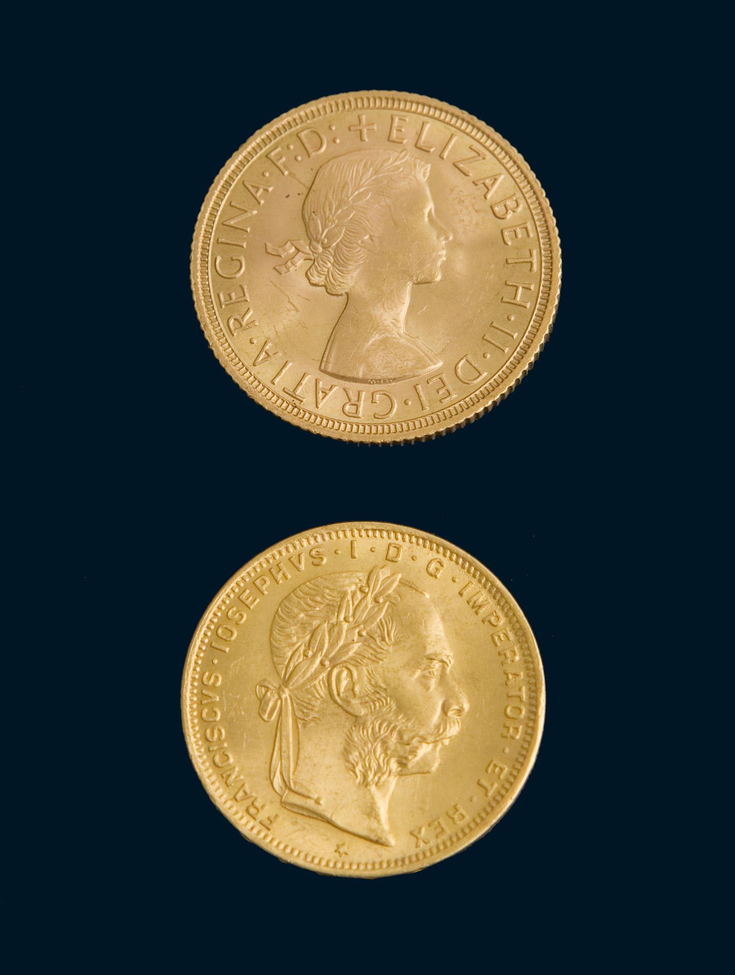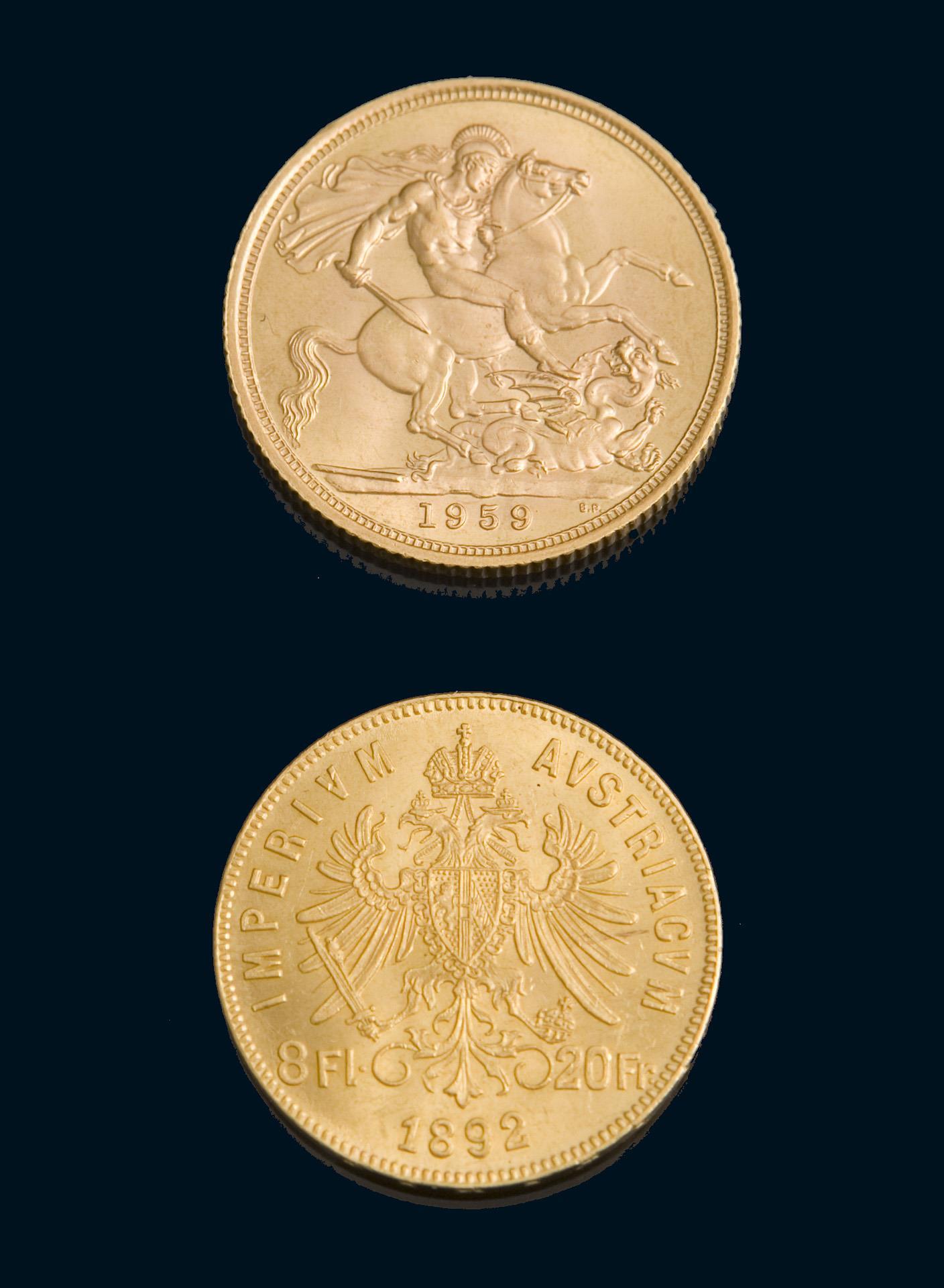 Emperor Franz Joseph I, 20 francs, 8 florins 1892. Queen Elizabeth II, 1 sovereign (1 pound sterling) 1959.