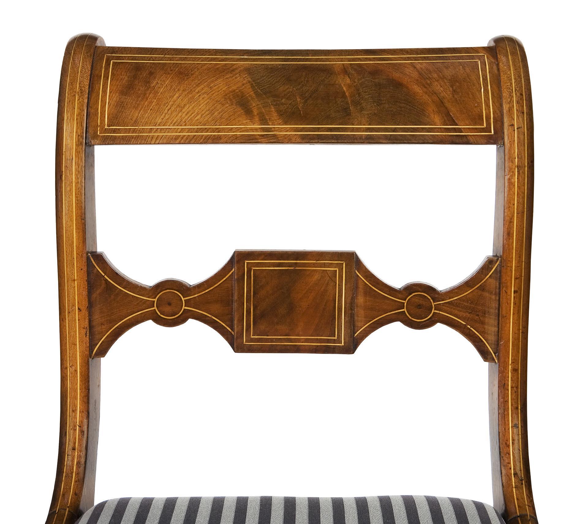 Elegant geschwungene Seitenrahmenstühle mit geschweiftem Mittelsteg auf ausgestellten Vierkantbeinen. Volutenrücken mit leicht gebogter Schulter, herausnehmbarer gepolsterter Sitz mit neuwertigem Streifenbezug. Alt restauriert, eine kleine Furnierecke fehlt.