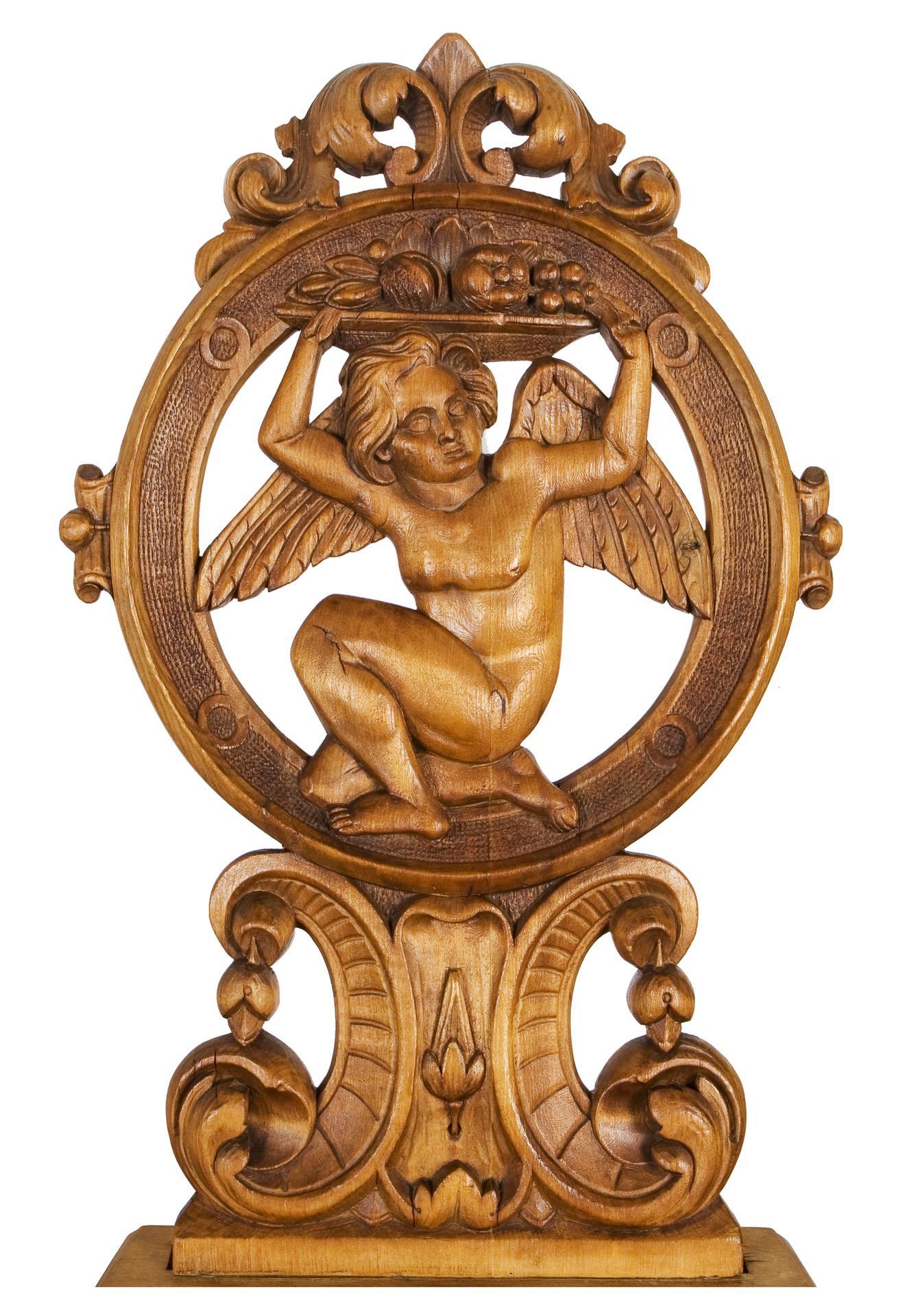 Openworked, richly carved backrest with floral, figurative and ornamental decoration. Cupids with outstretched wings and fruit basket in round cartouches. Trapezoidal seat over four flared turned legs.