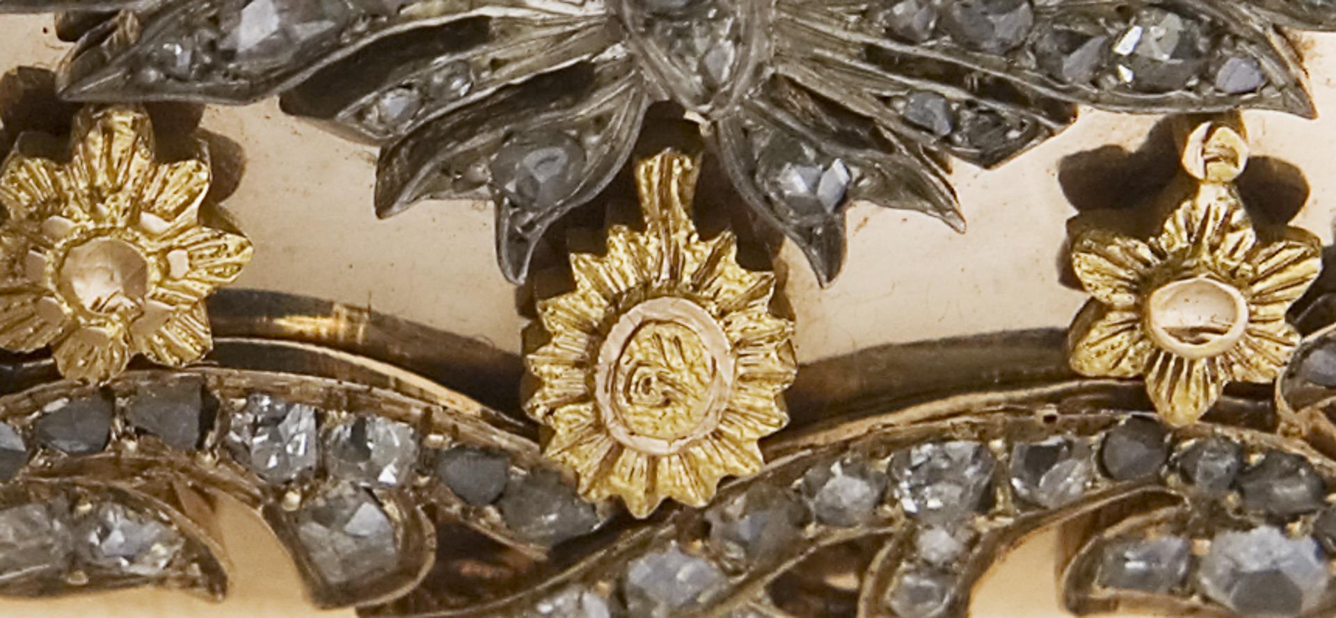 Corpus: 585 yellow gold (14 kt), applications in 750 (18 kt) and 916 (22 kt) yellow gold, some diamonds in silver setting. 3 x 6.5 x 10 cm. 154.5 grams.