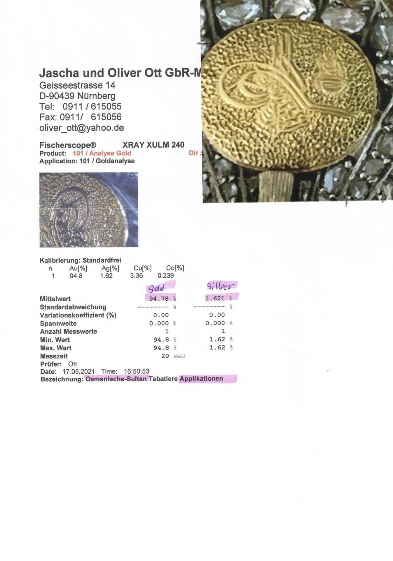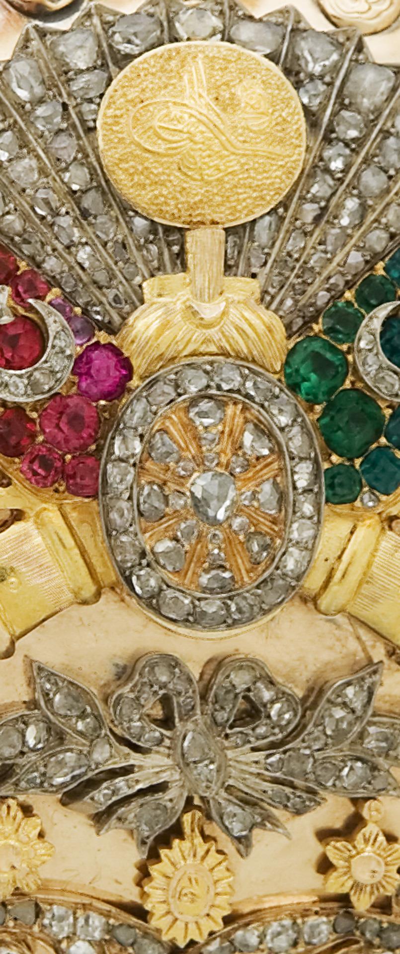 The cover with floral and ornamental elements, military trophies and the sultan's tughra (name), the flags each with an appliquéd crescent moon with a five-pointed star. Appliqués with 13 emeralds, 16 rubies and around 410 diamonds in various sizes. Rounded rectangular shape, hinged lid with drop-bolt clasp. Hallmarks: Mark for imported objects, Yugoslavia from 1933. With gold analysis by Ott in Nuremberg, 17.05.2021.