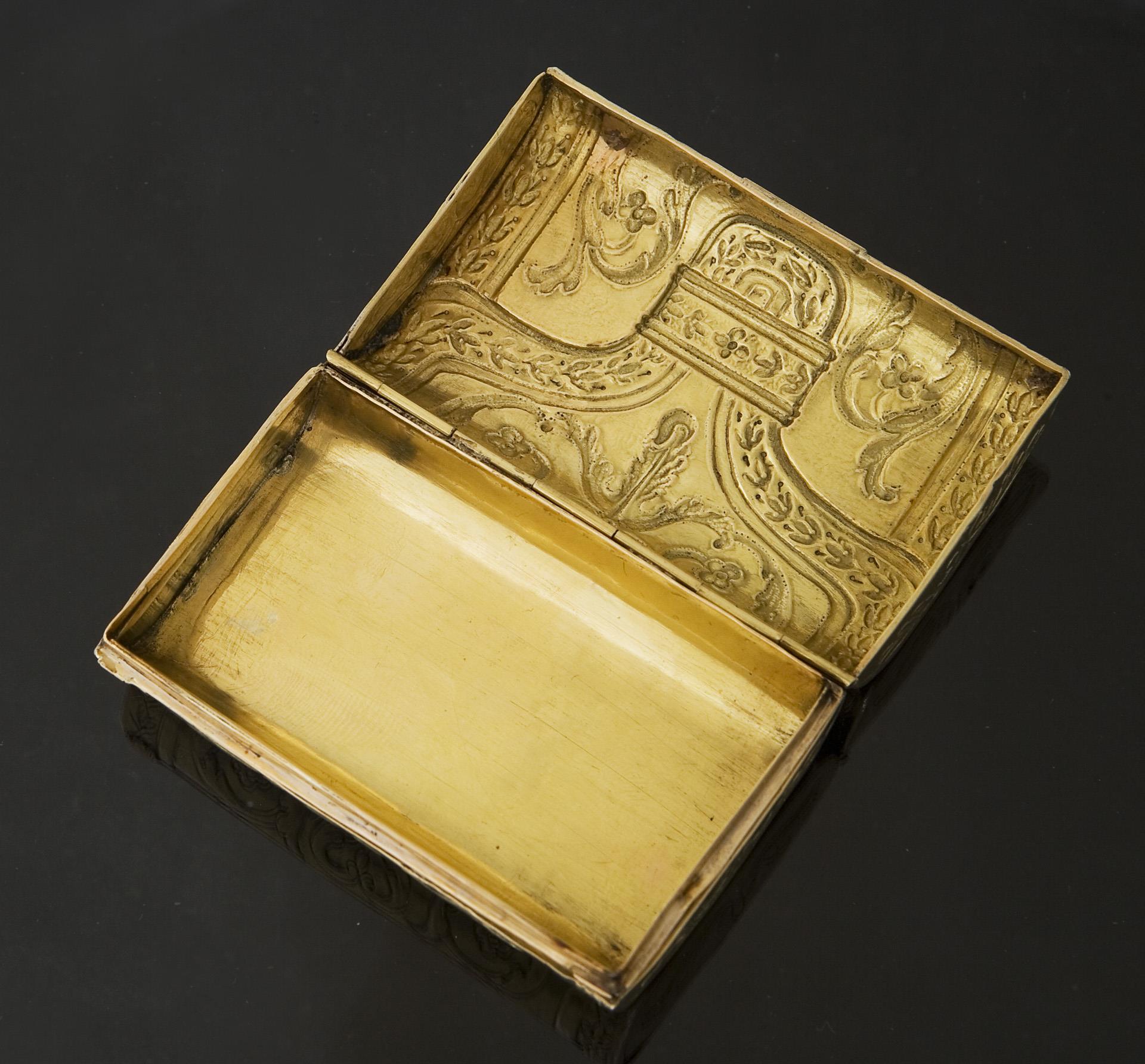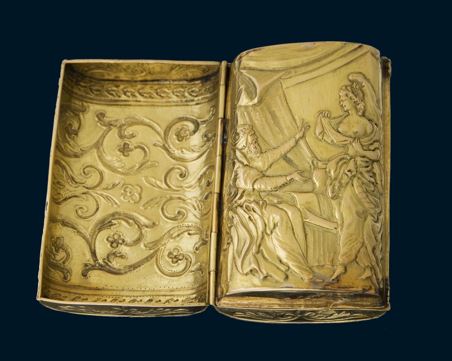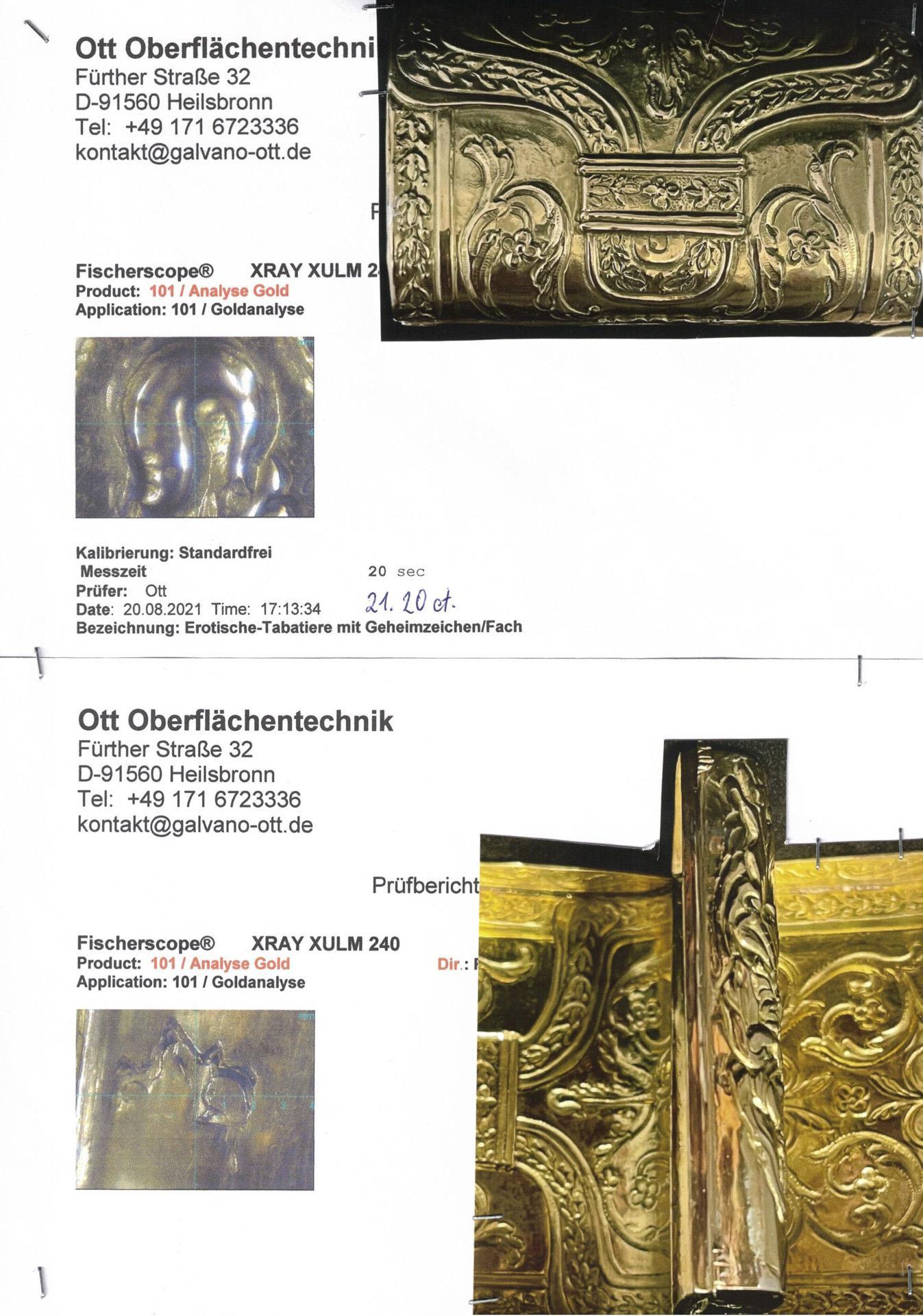 Chased on all sides, outer wall with floral elements. The clasp on the lid symbolizes access to discover hidden or mysterious things. On the inside of the secret compartment lid is an erotic depiction of "lovers in a bedchamber". The attractive and seductive femme fatale with exposed breasts is welcomed with open arms by her lover. Indistinct hallmarks on the inside. With gold analysis by the Ott company in Heilsbronn, 20.08.2021.
