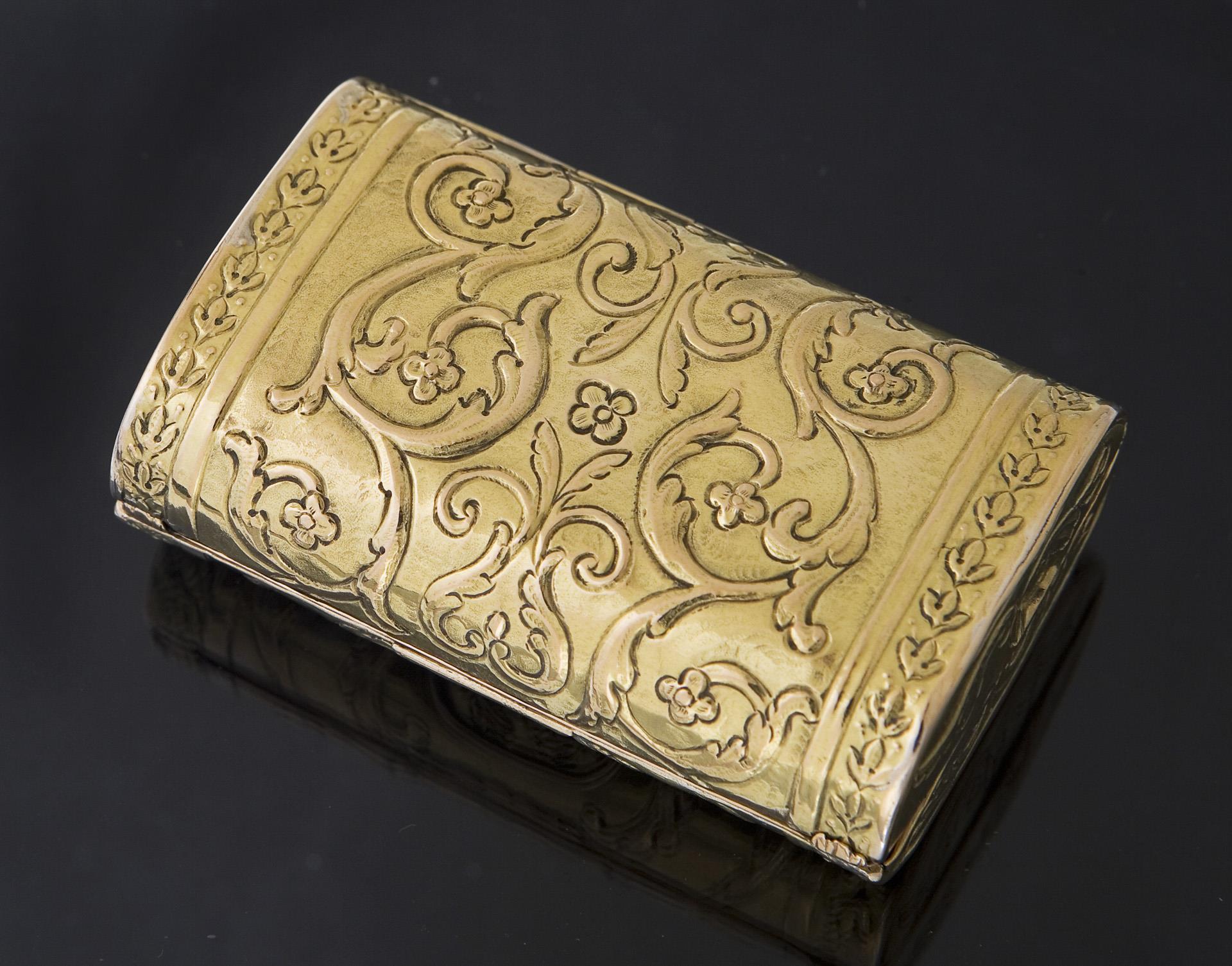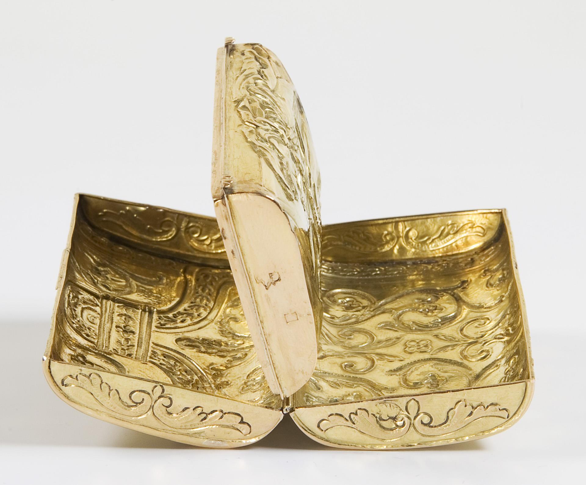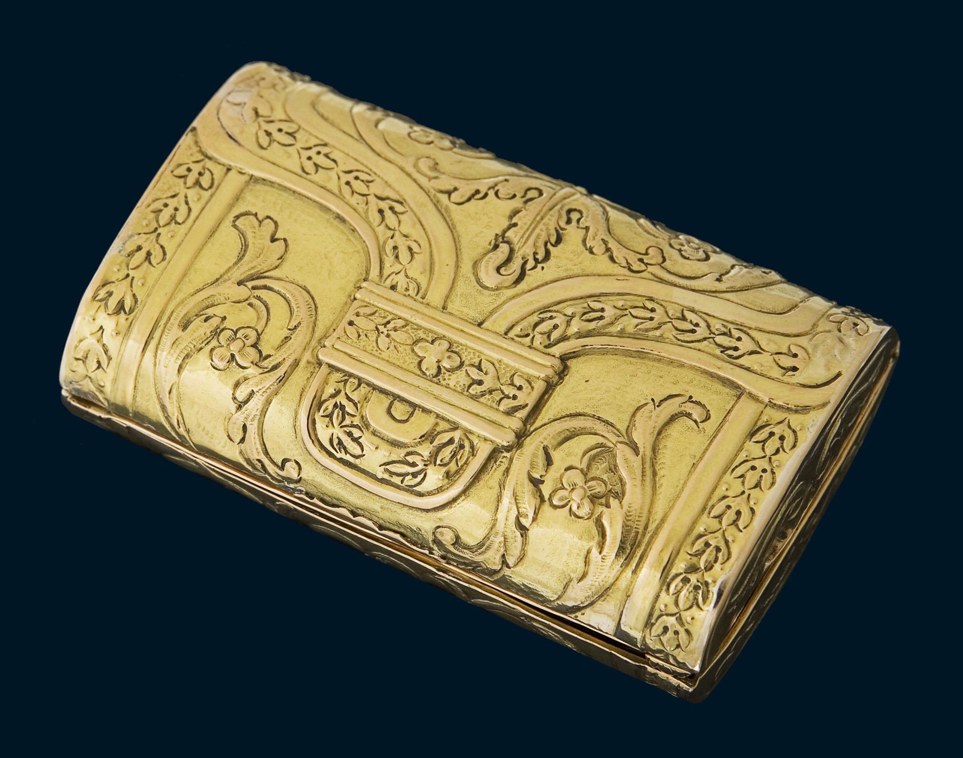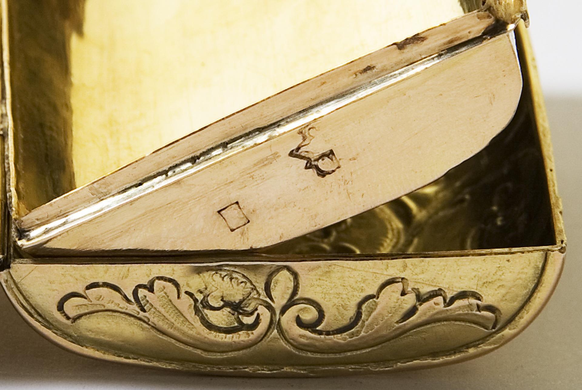 Chased on all sides, outer wall with floral elements. The clasp on the lid symbolizes access to discover hidden or mysterious things. On the inside of the secret compartment lid is an erotic depiction of "lovers in a bedchamber". The attractive and seductive femme fatale with exposed breasts is welcomed with open arms by her lover. Indistinct hallmarks on the inside. With gold analysis by the Ott company in Heilsbronn, 20.08.2021.