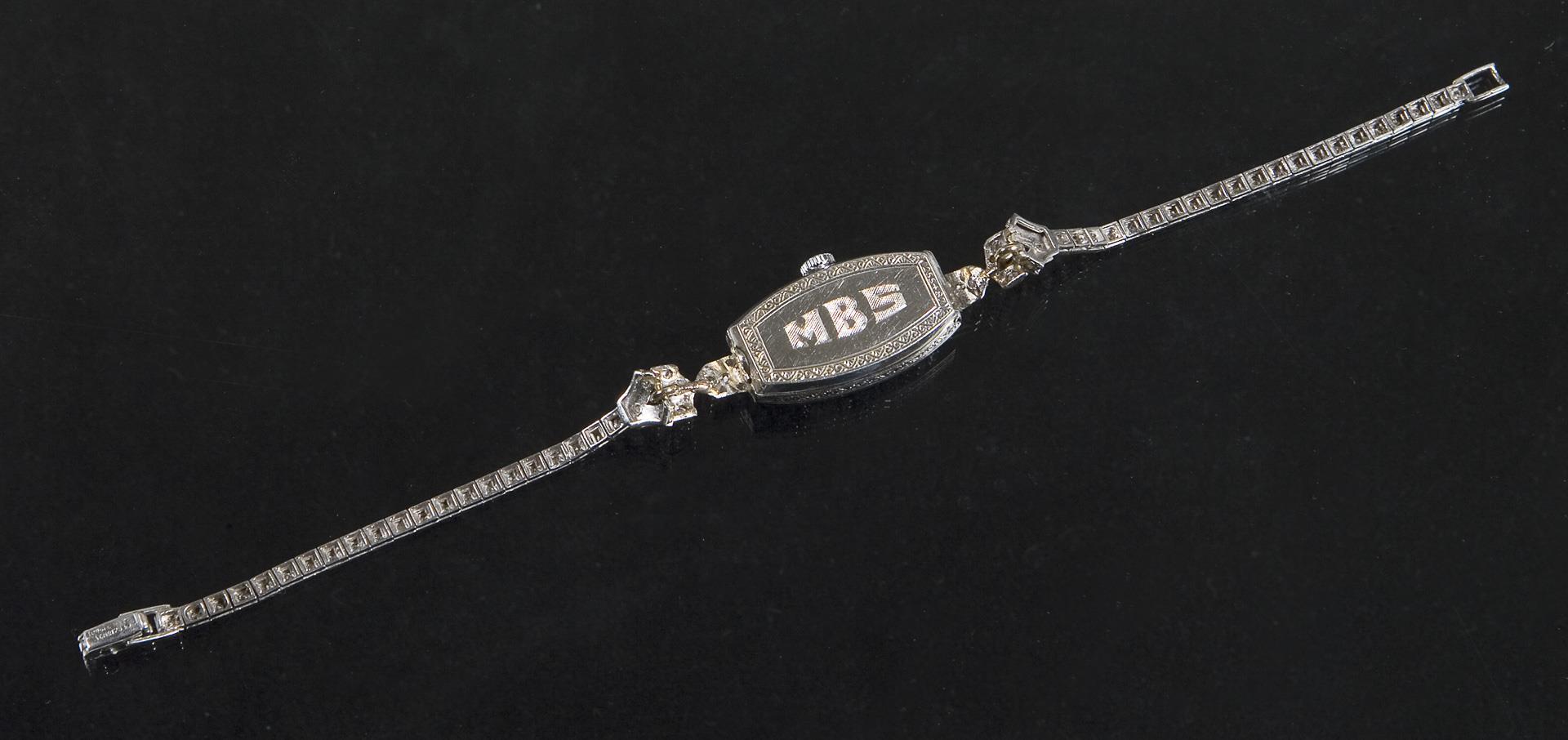 The original movement has been removed and a quartz movement installed. Case with engraved owner's monogram MBS on the back. Graceful strap with folding clasp. Battery new.