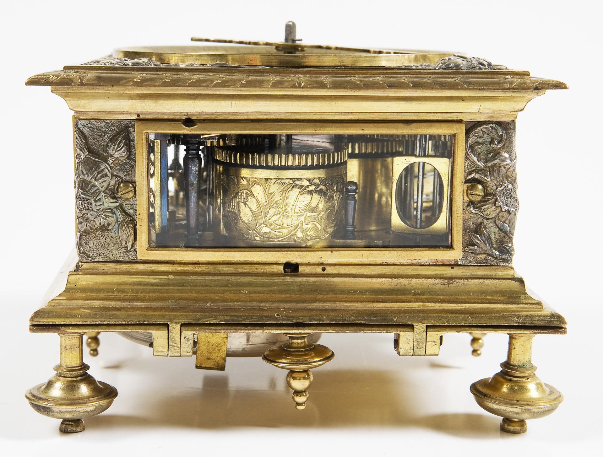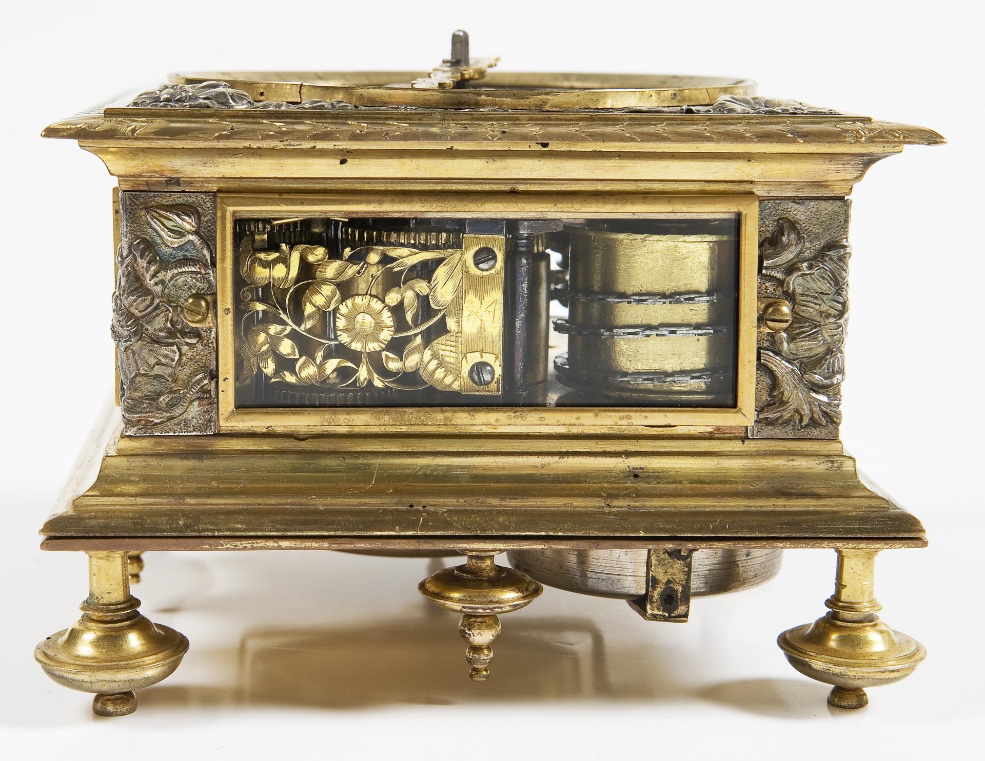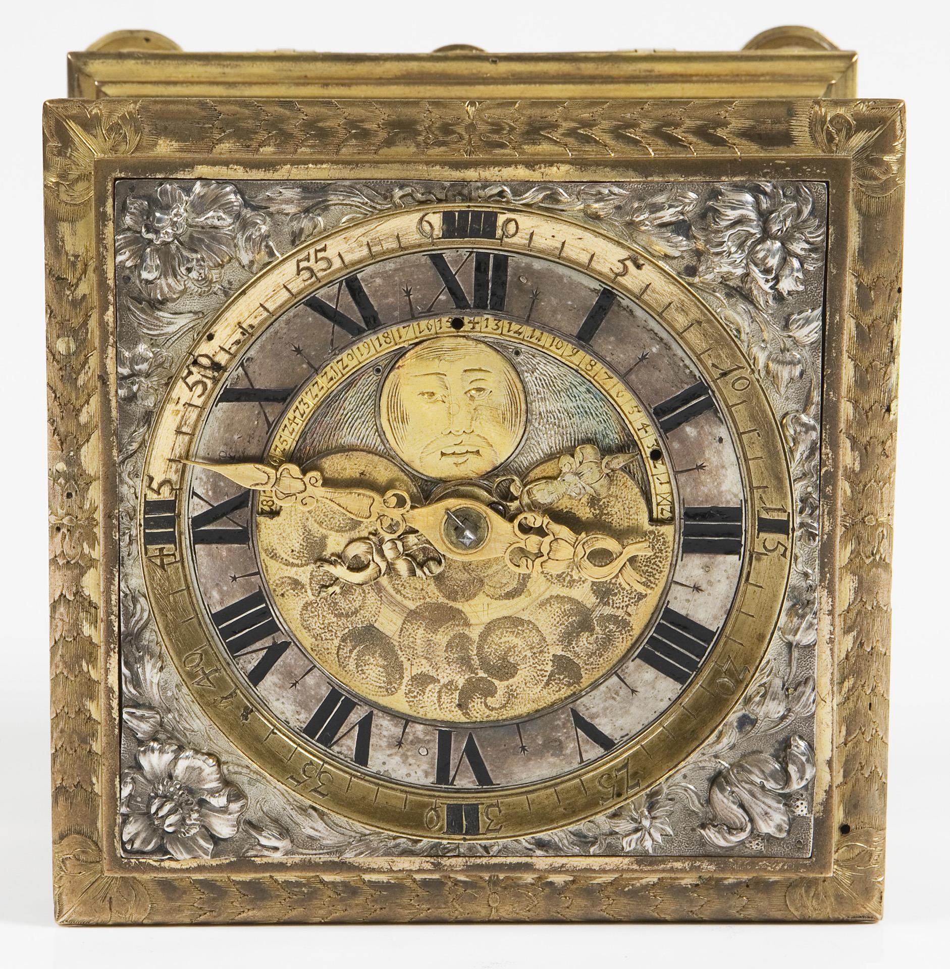Plate signed. Square body with florally chased ornaments and hinged underside on baluster feet, screwed-on viewing windows all around. Dial ring with blackened Roman numerals for the hours, outer dial ring with Arabic minute scale, open-worked hands, cloud symbols in the center and engraved moon disc in front of a gouilloched sky. Elaborately crafted plate with floral openwork applications, some parts in blued steel. Verge escapement with chain and fusee, quarter-hour striking mechanism on two bells in the base, three windings. The going and striking mechanisms function in the short-time test. Blued handle of the locking bolt in the base is loose.