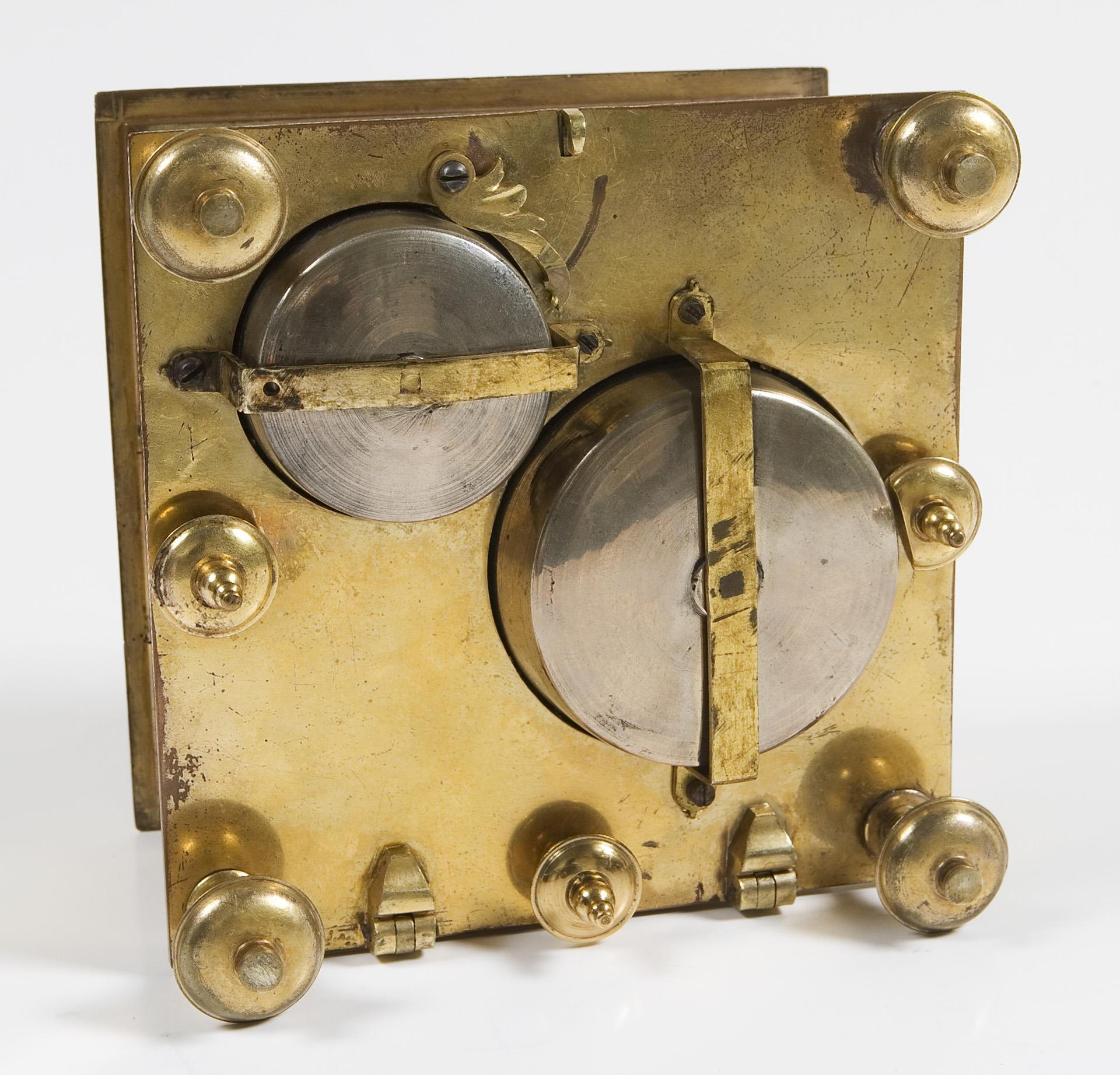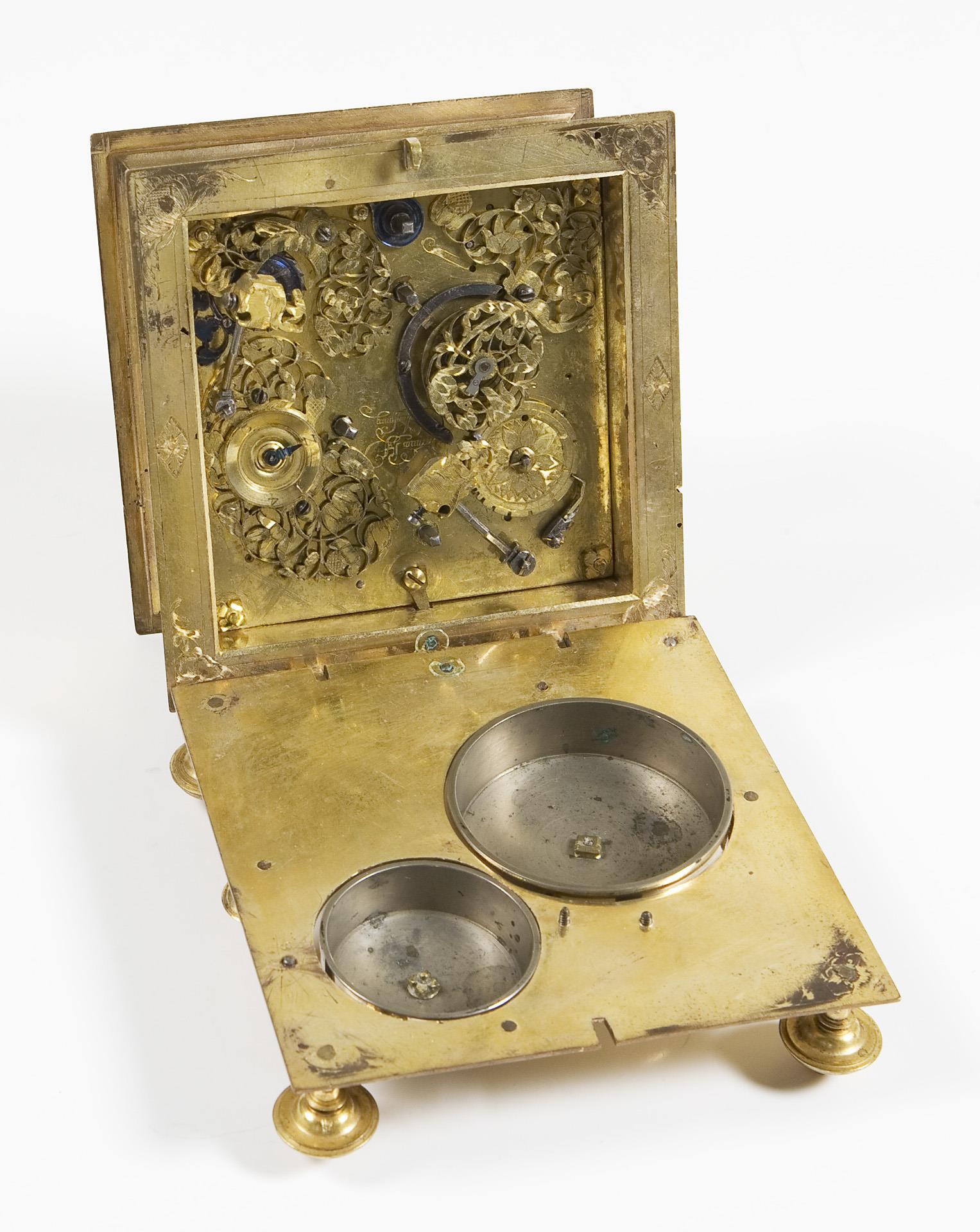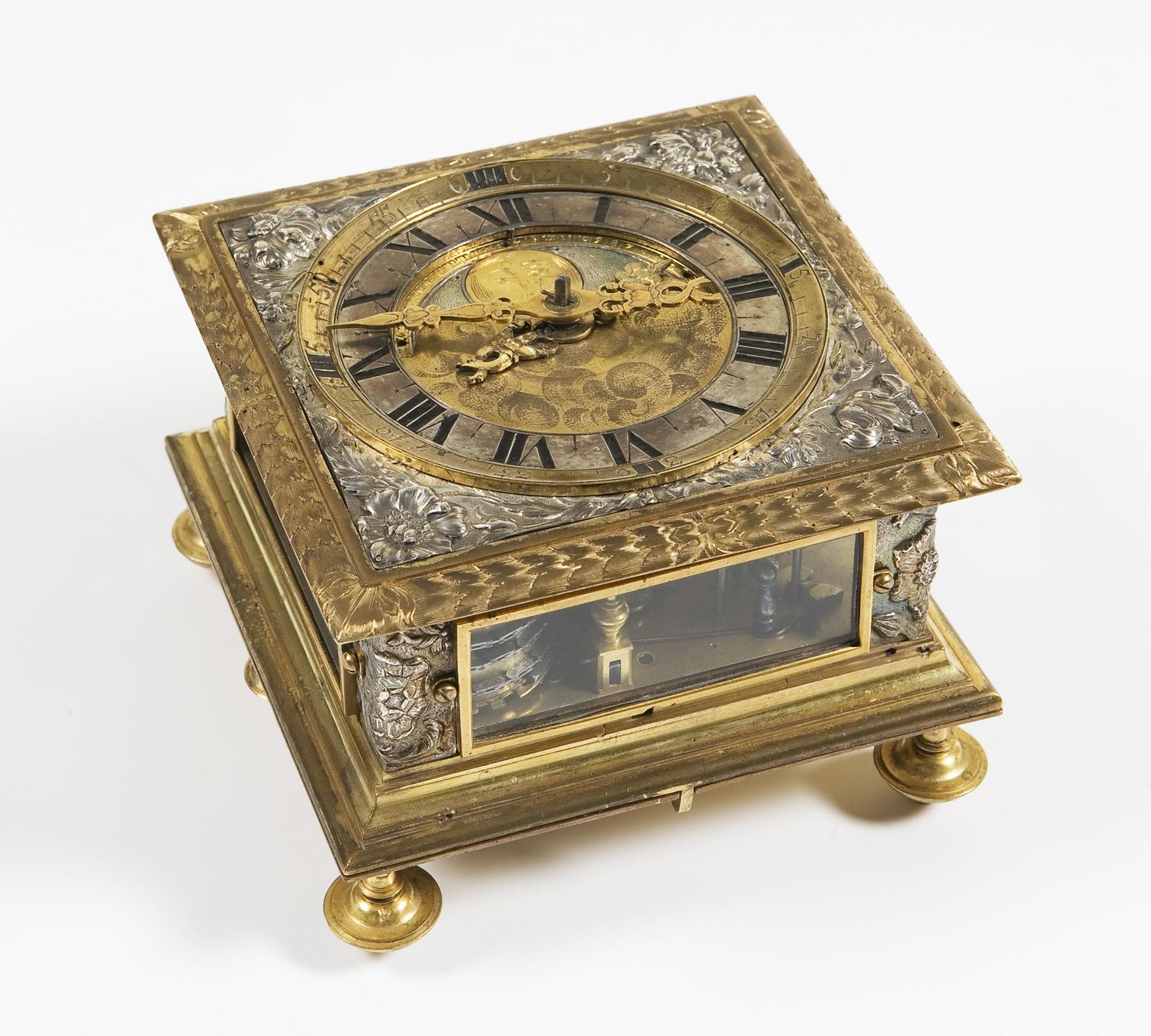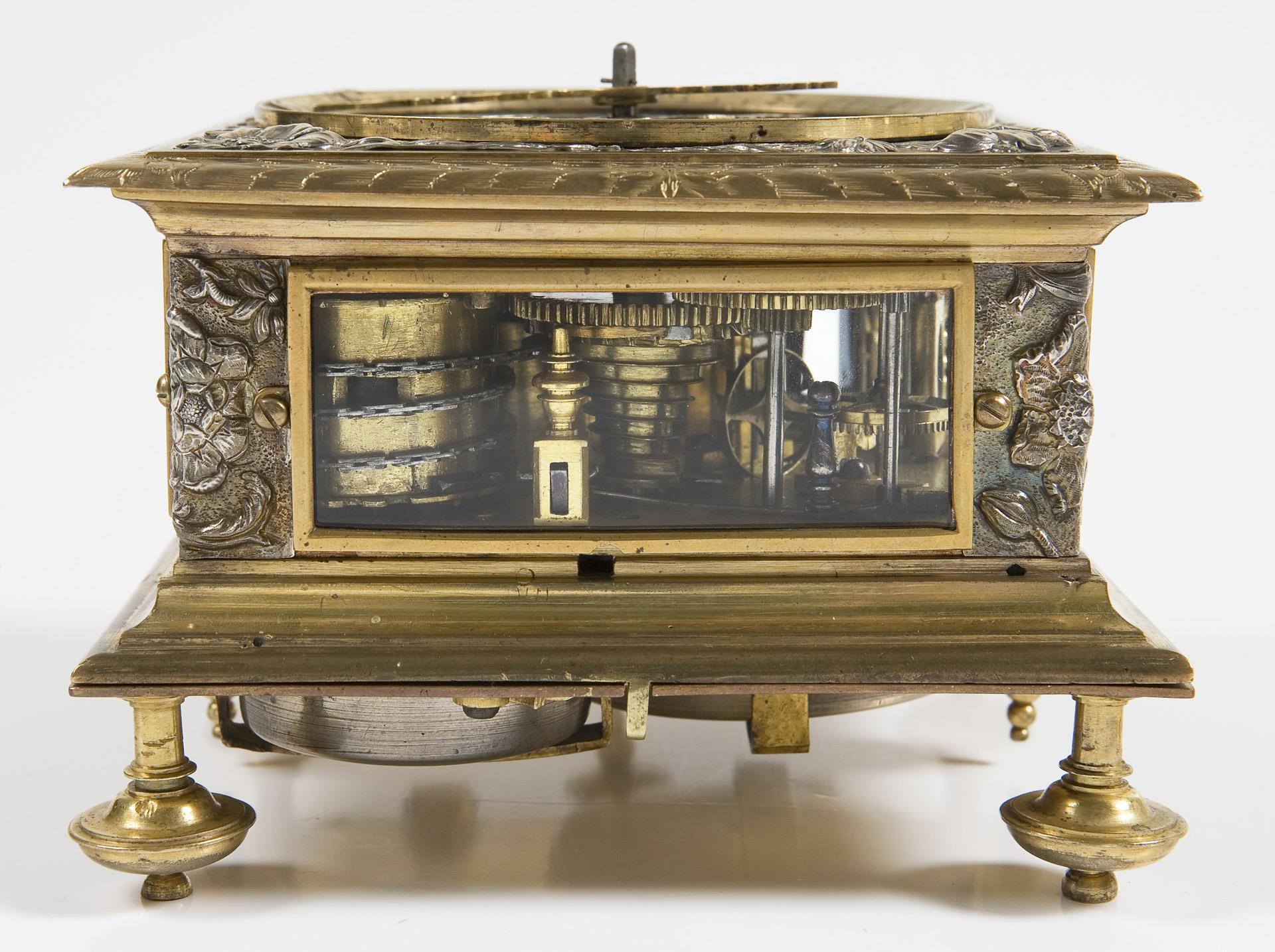 Plate signed. Square body with florally chased ornaments and hinged underside on baluster feet, screwed-on viewing windows all around. Dial ring with blackened Roman numerals for the hours, outer dial ring with Arabic minute scale, open-worked hands, cloud symbols in the center and engraved moon disc in front of a gouilloched sky. Elaborately crafted plate with floral openwork applications, some parts in blued steel. Verge escapement with chain and fusee, quarter-hour striking mechanism on two bells in the base, three windings. The going and striking mechanisms function in the short-time test. Blued handle of the locking bolt in the base is loose.