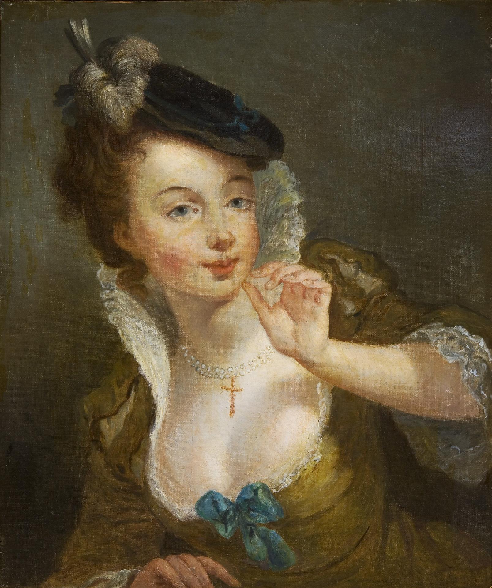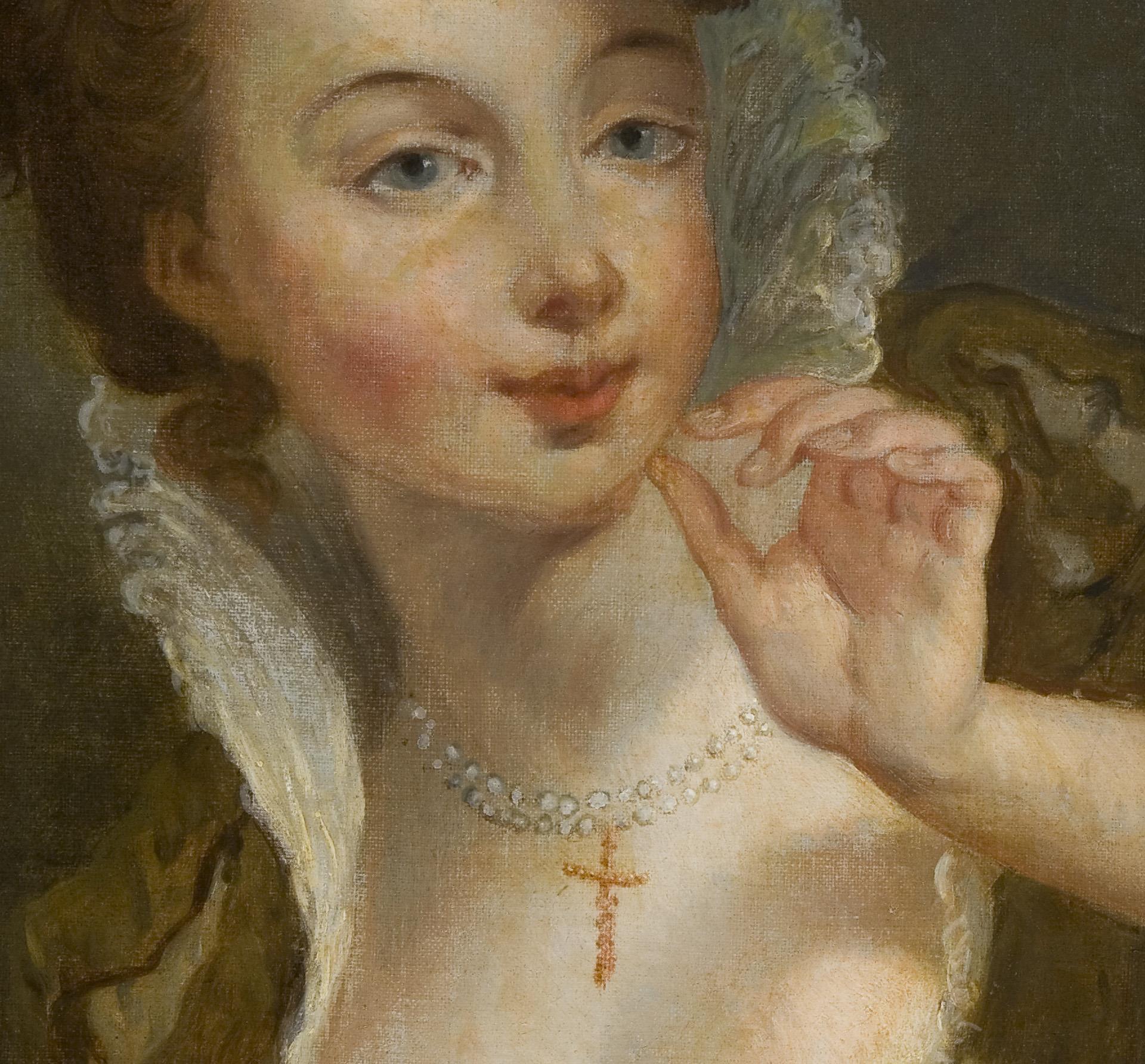The portrait epitomizes the elegant genre. The pretty young noblewoman in love with French charm radiates the lightness, grace and gracefulness that are indicative of Francois Boucher (French Rococo painter). Several of his pupils and successors are stylistically very close to him. Gilt stucco frame. Frame slightly defective, old relining.