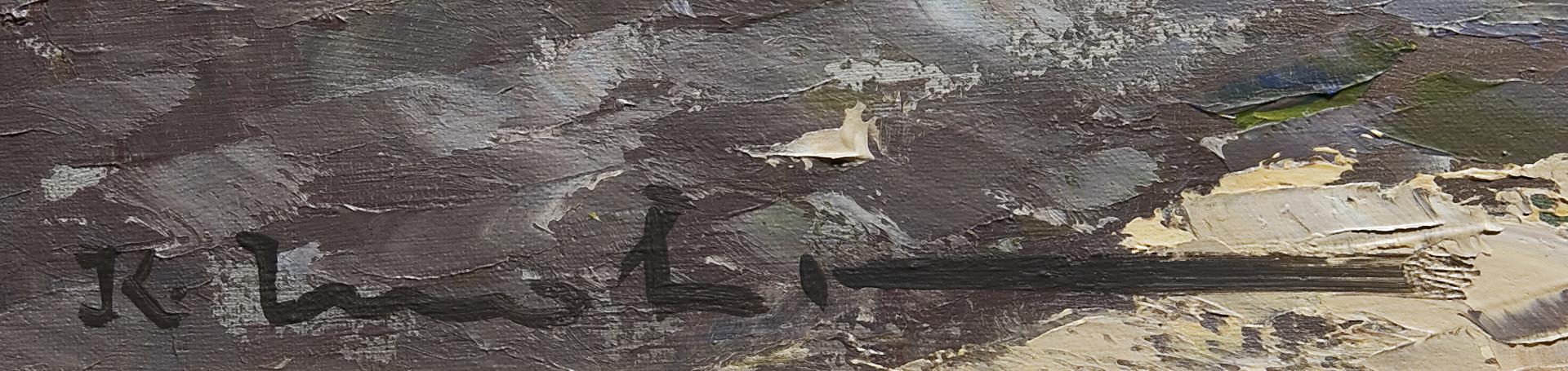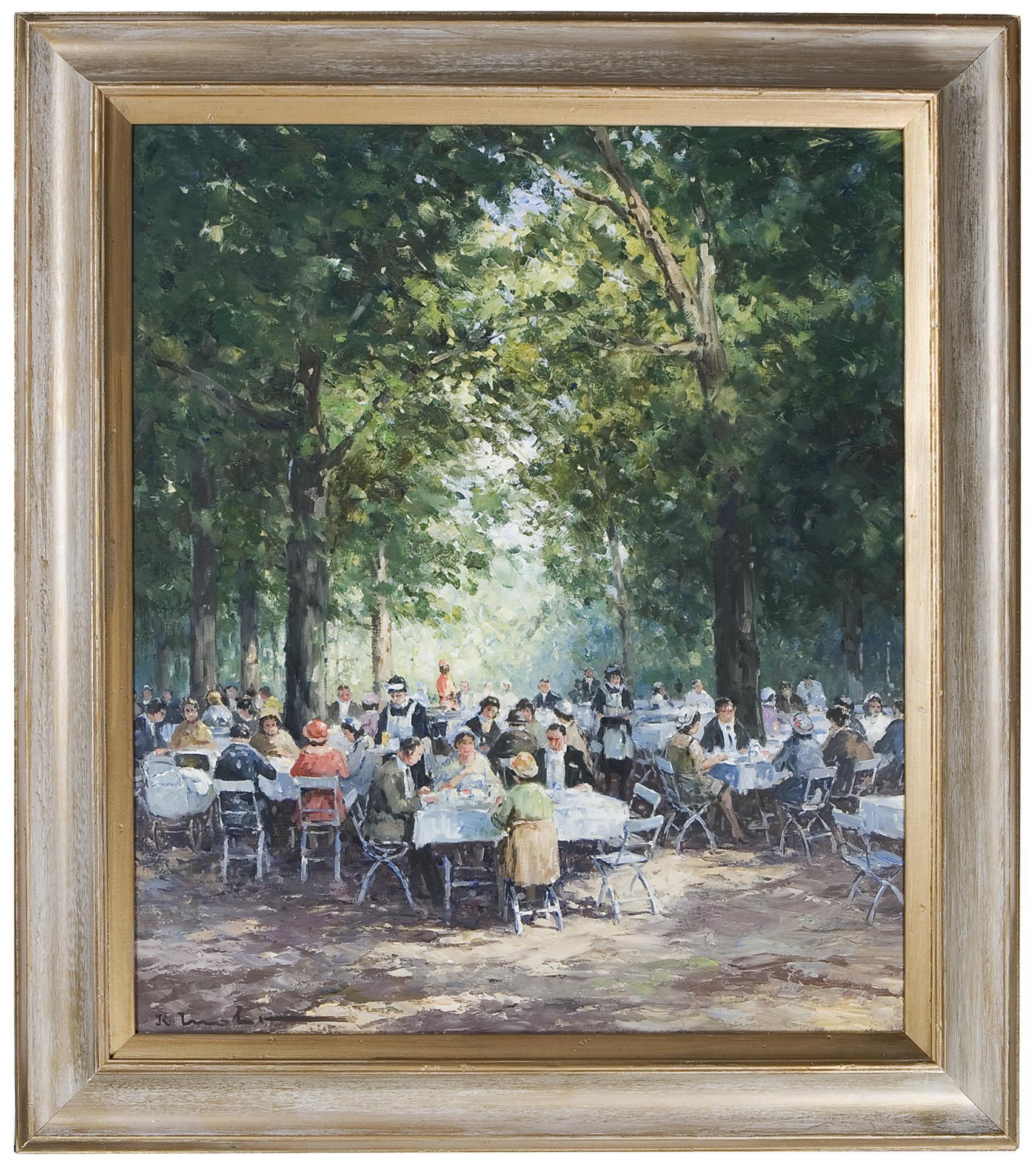 Impressionist genre scene in the manner of Max Liebermann (1847-1935). Painted in a light color scheme, which radiates calm and harmony through changes in shadow and light, and with a lively application of paint. Profiled frame with Parisian stickers.