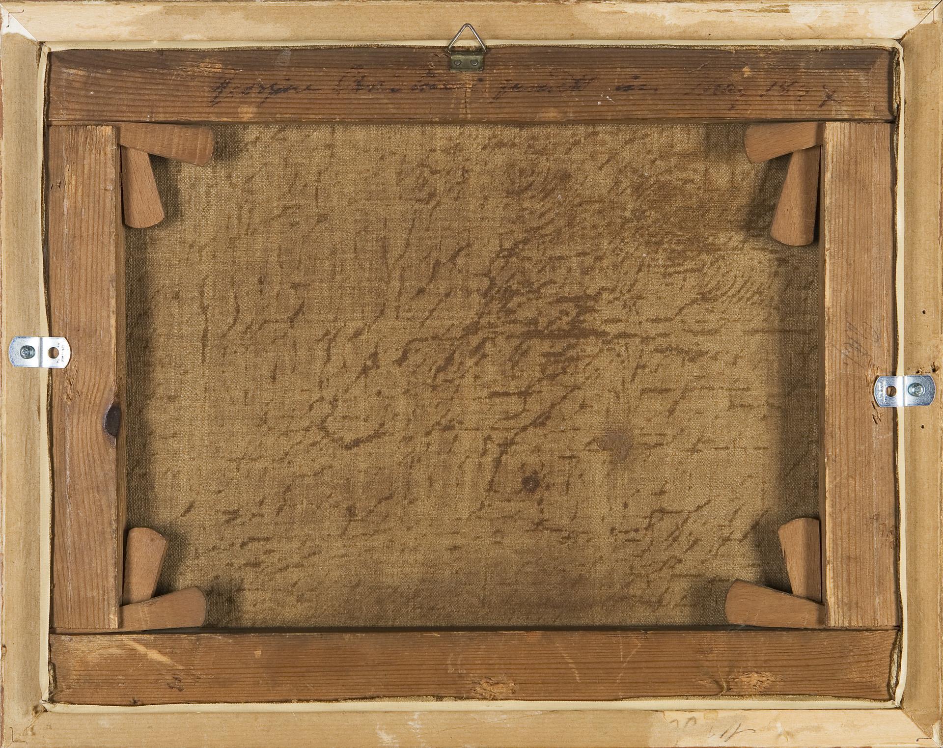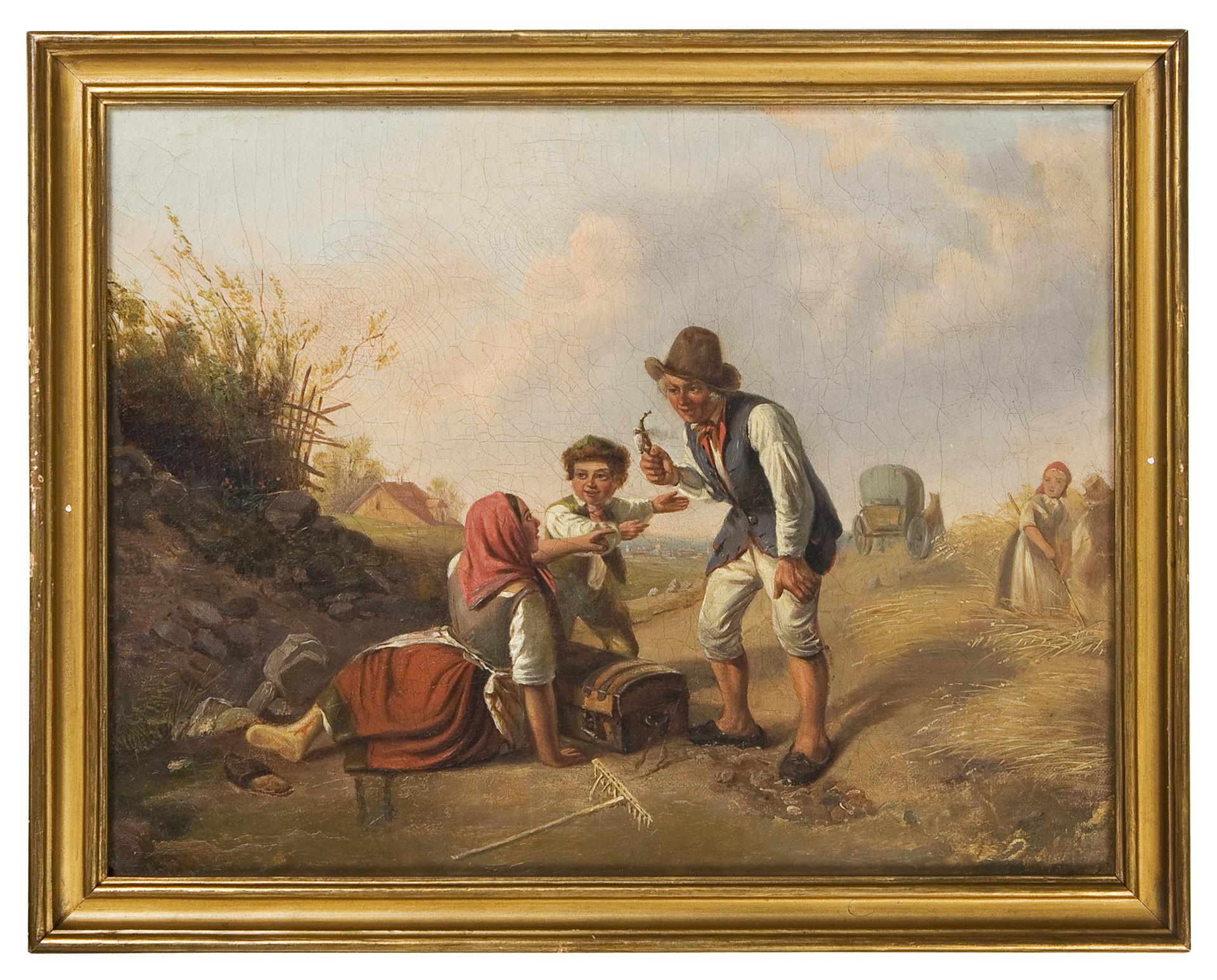 Small-format genre scene of the rural population with an unusually varied depiction. Indistinctly inscribed and dated on the reverse of the stretcher. Bronze profile frame. Doubled at the edge.