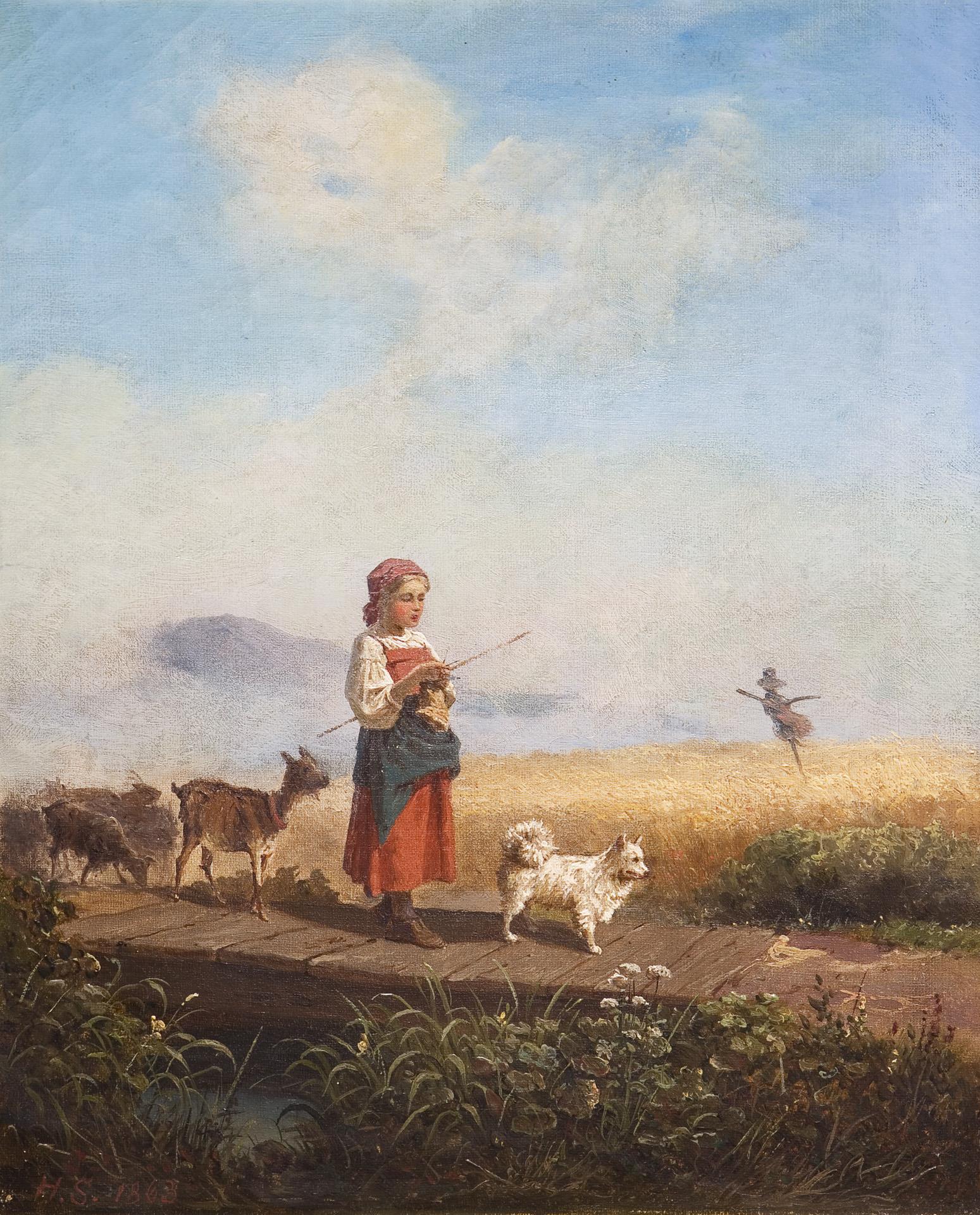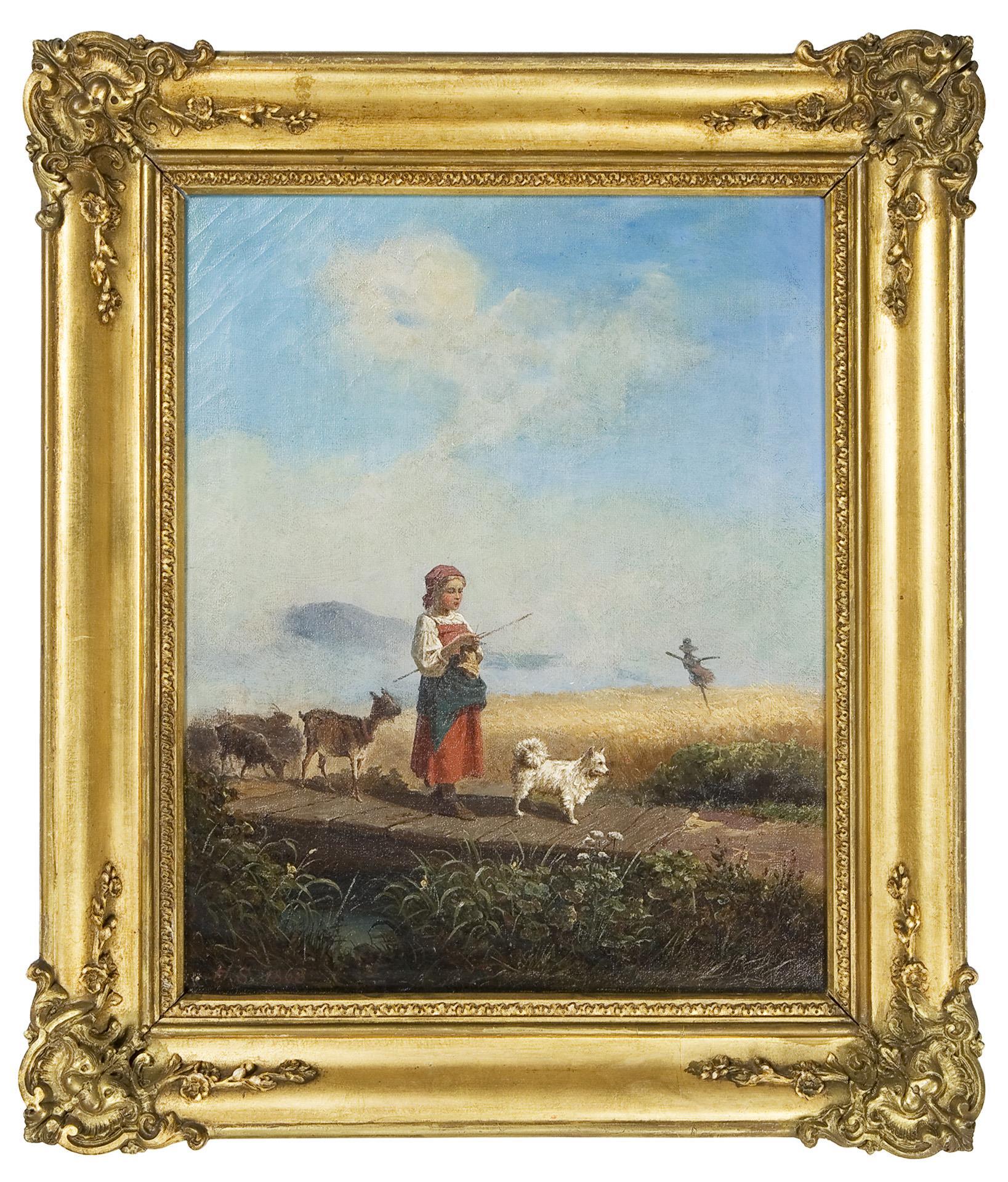 Small genre painting with a charming depiction, the world of children combined here with animals, a rural children's idyll in a midsummer landscape. Original gilt stucco frame.