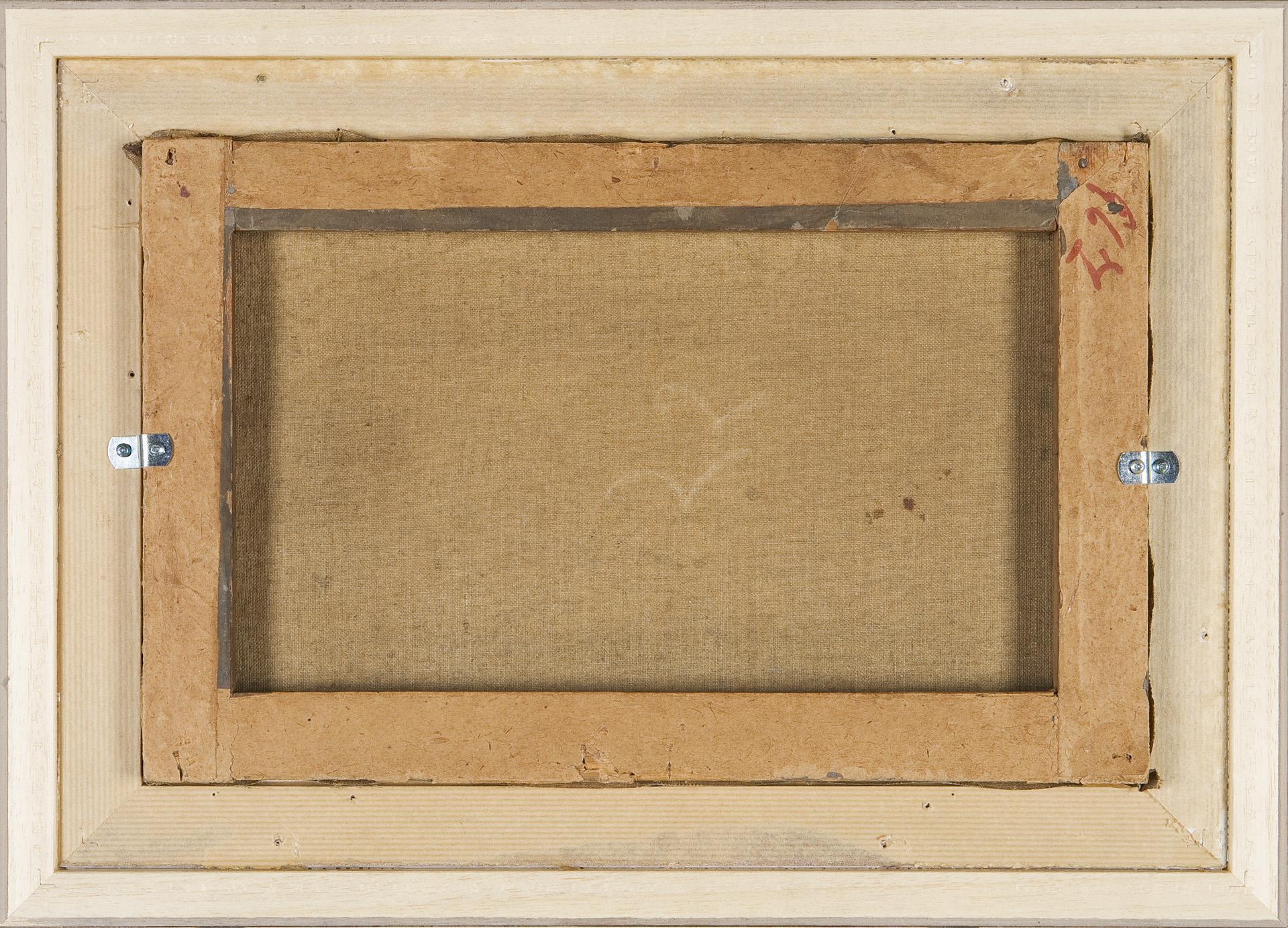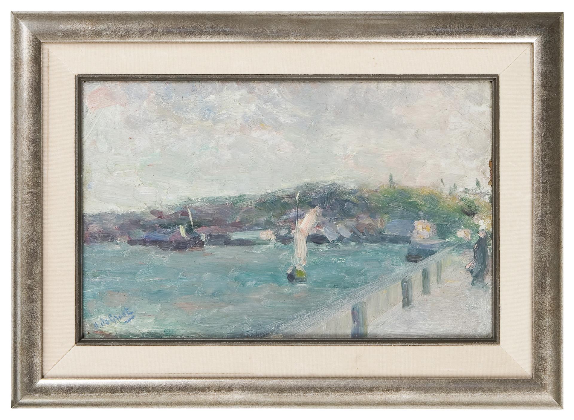 Impressionistic view with a sweeping application of color in a light color scheme. Mint silver frame with velvet passe-partout. Canvas partially damaged at one edge of the sky.