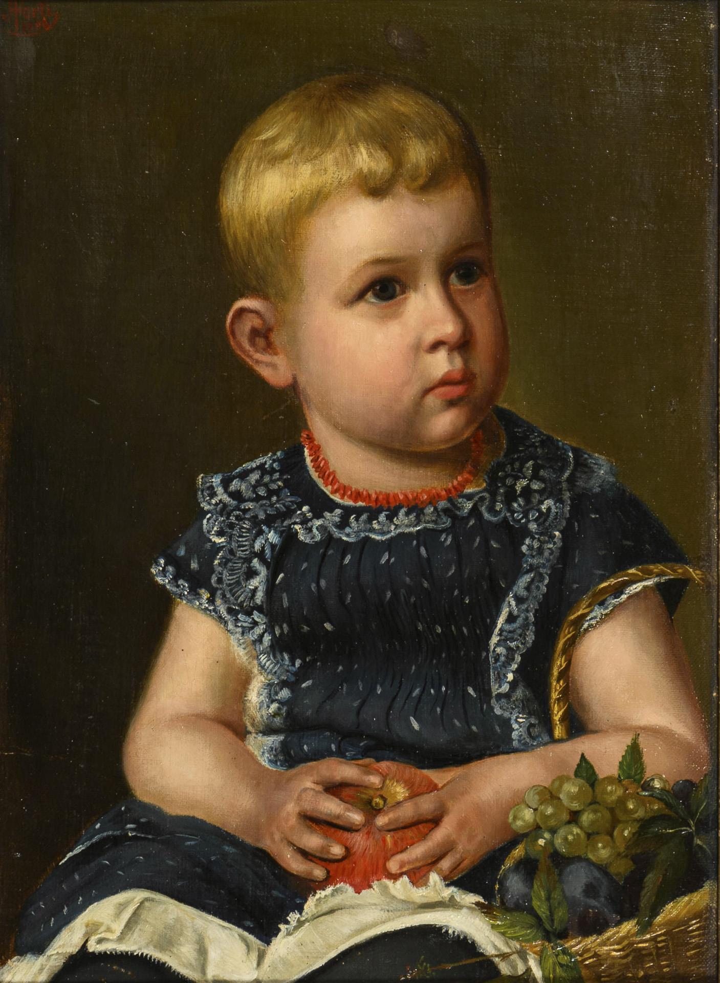 Portrait of a girl with short blonde hair, a fruit basket on her arm and an apple in her hands. Slight traces of age.