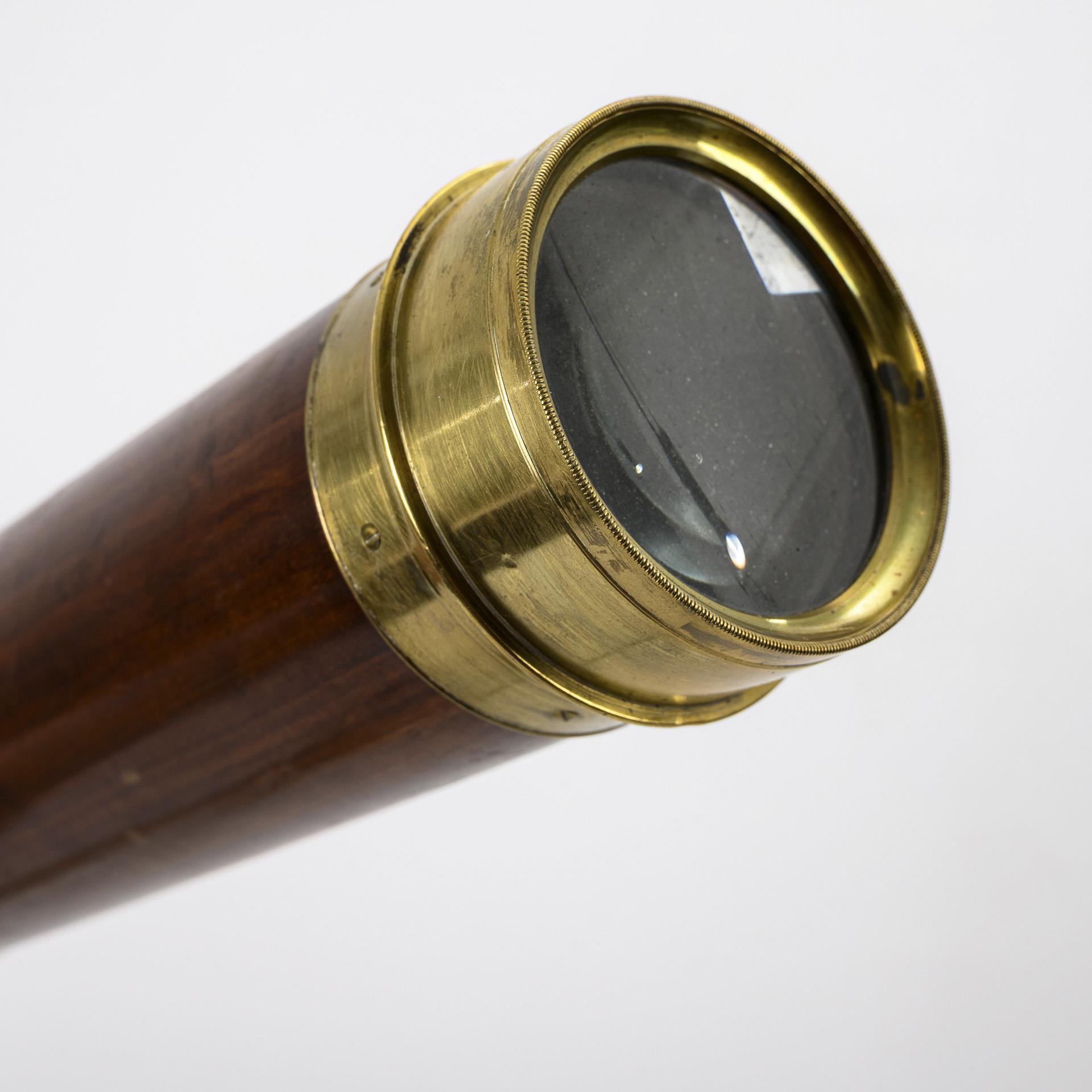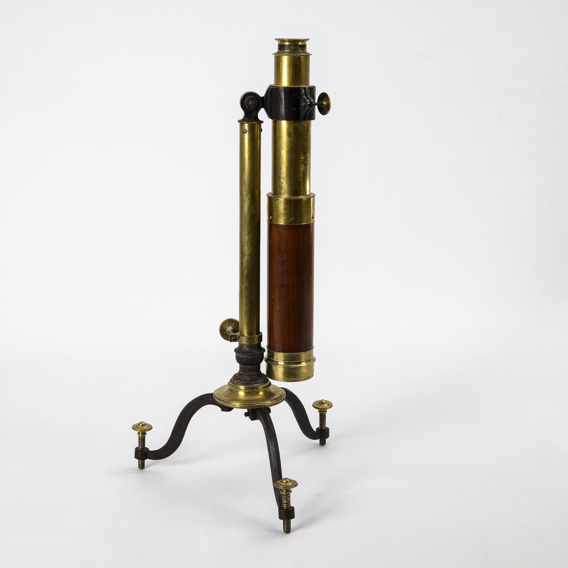 Brass partly blackened, mahogany, cast iron blackened. L telescope maximum 83 cm. H tripod 60 cm. 4.8 kg.