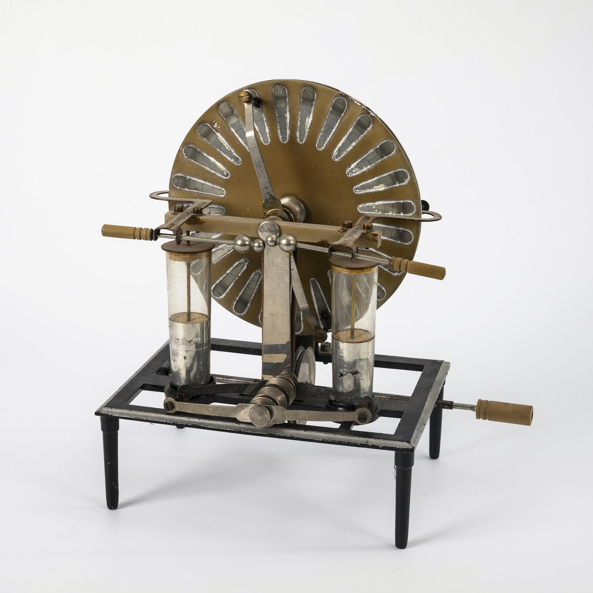 1 crank for 2 pulleys, 2 plastic pulleys with metal coatings, 2 collector brushes, 2 movable arms with charge balls, 2 Leyden jars (condensers). Includes pulley axle and brush holders. Signs of age/use, works.