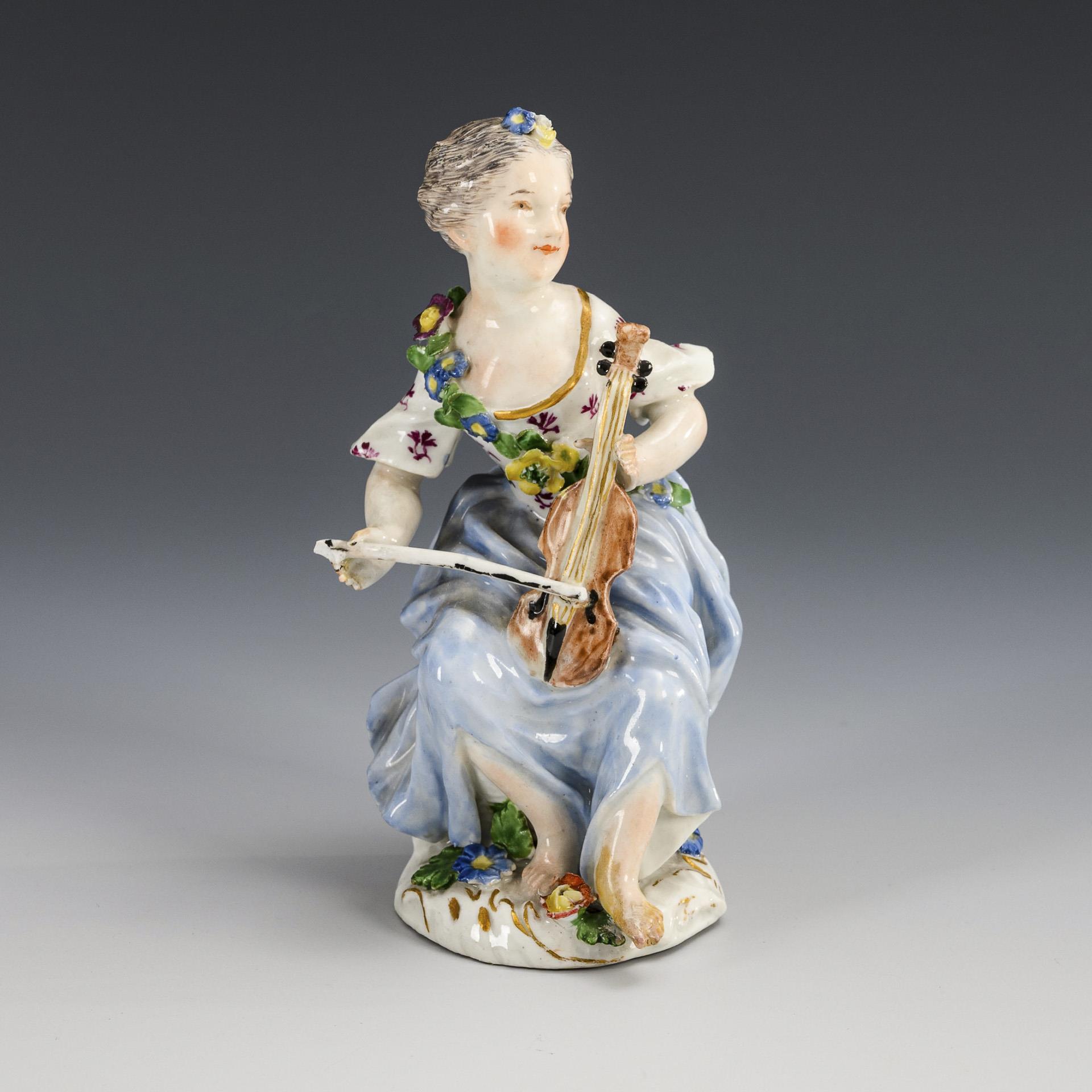Girl sitting on a rock base playing a violin. Left foot restored, bow and flowers chipped.