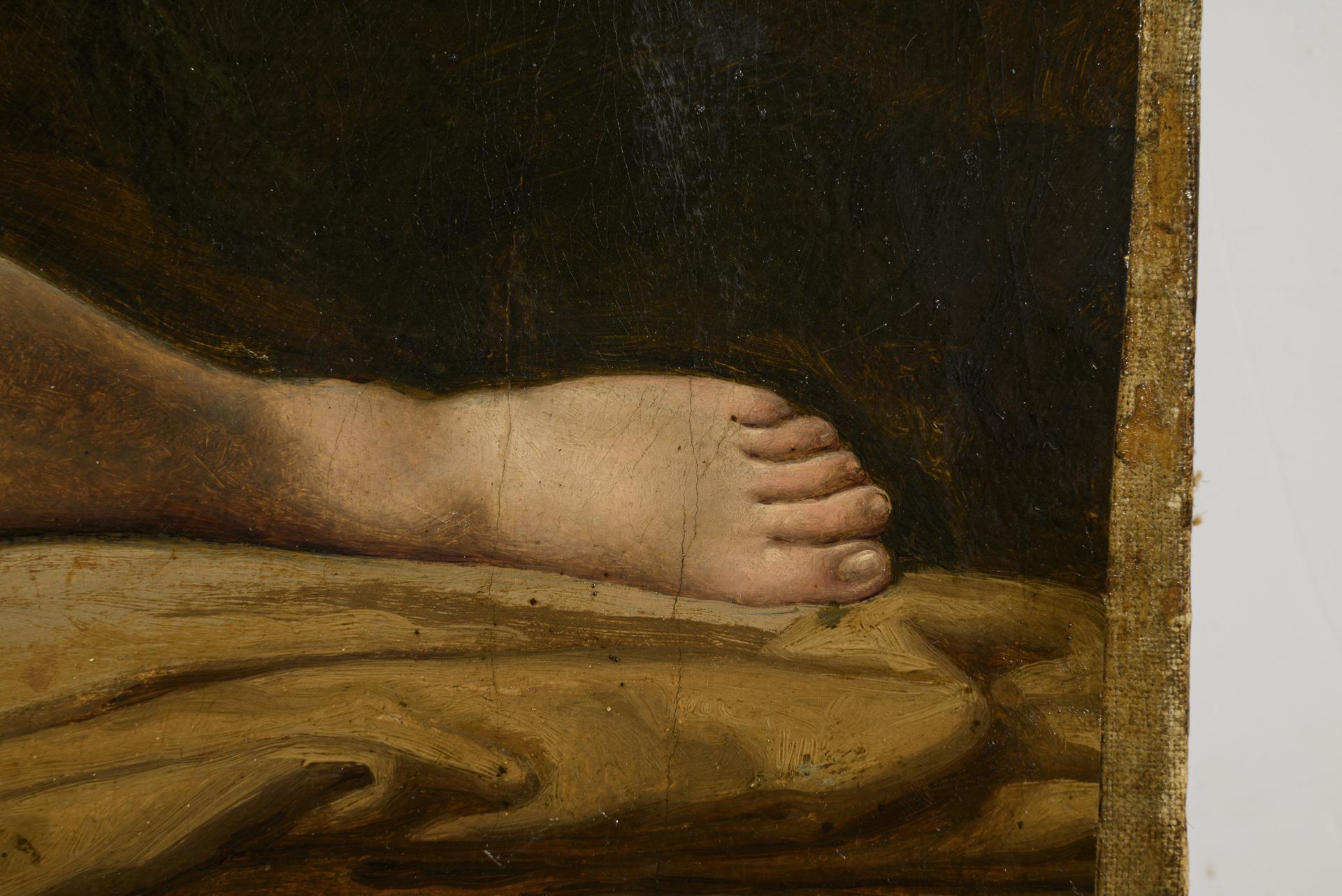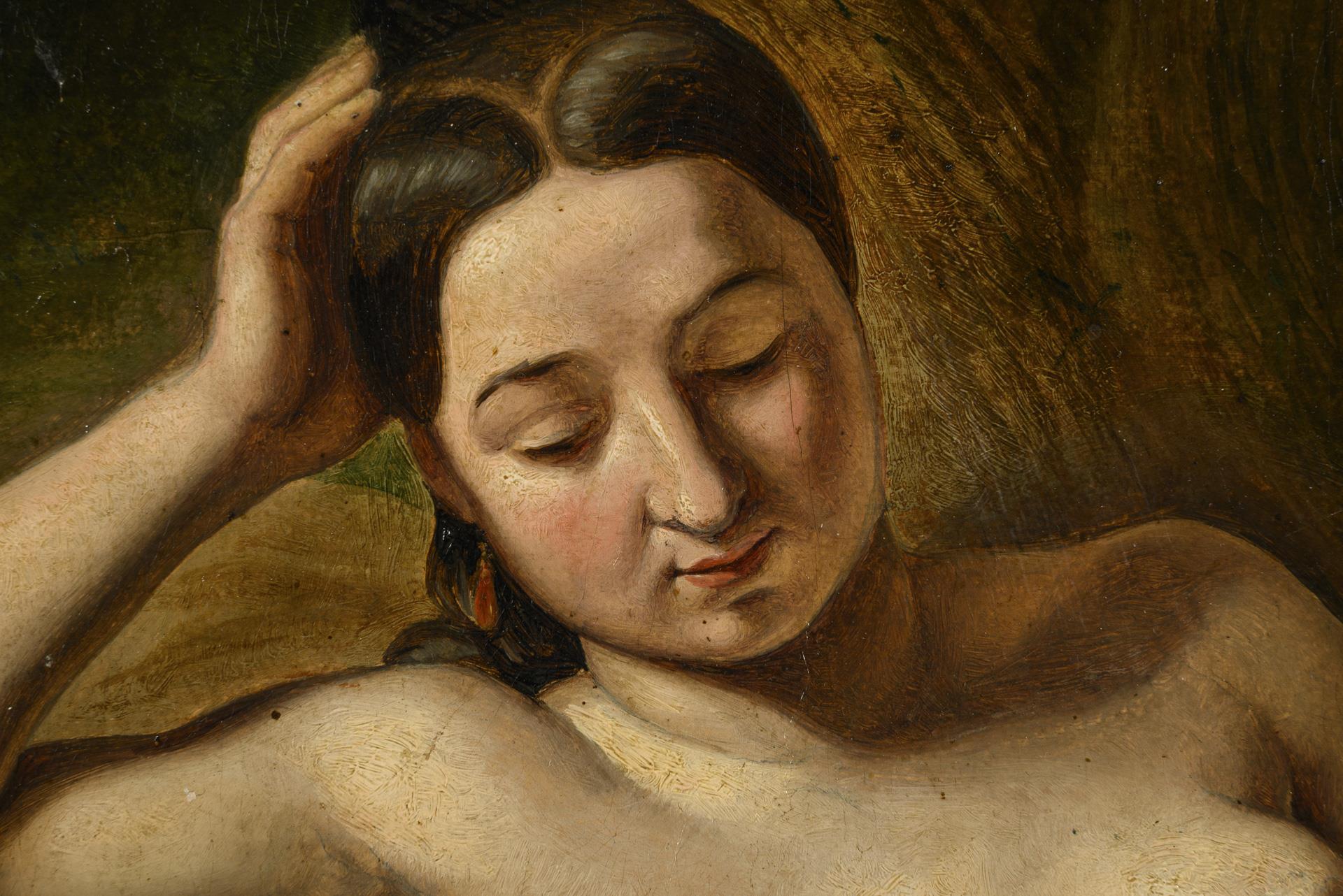 Nude young woman lying under a tree in the bright light in the old master style. Slight traces of age.