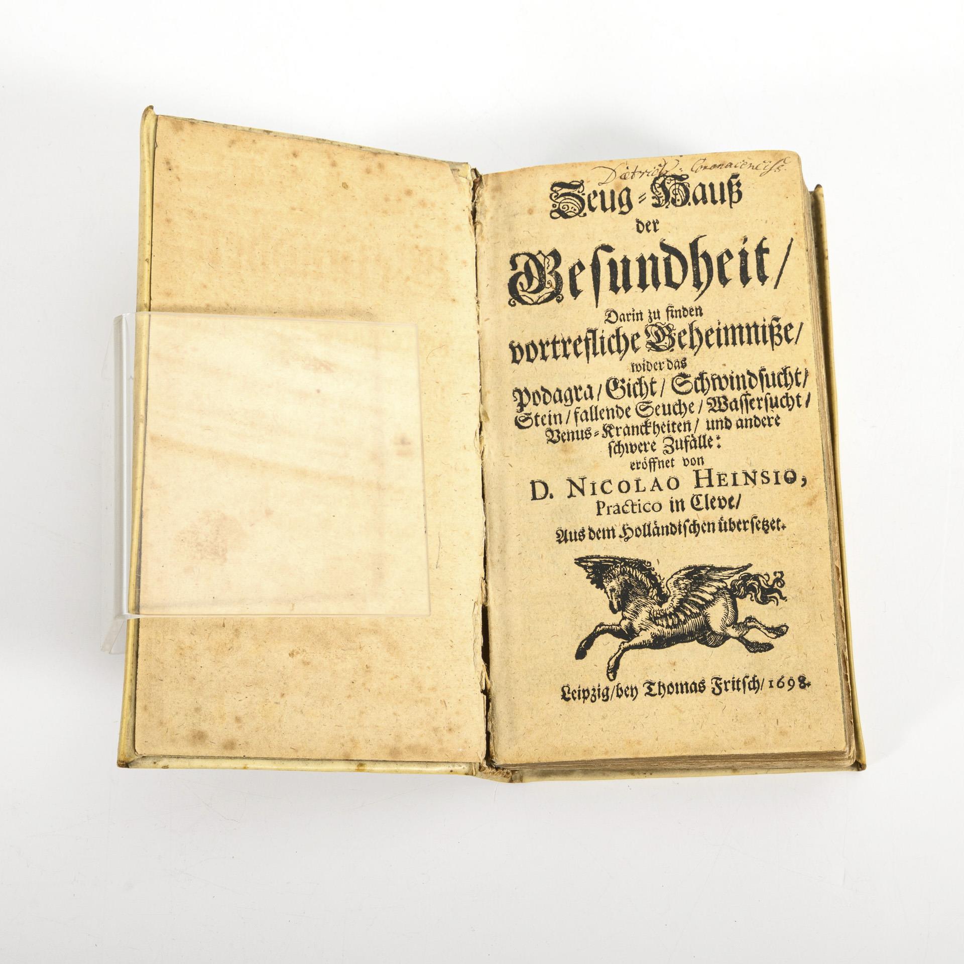 Nicolao Heinsio: "Zeug-Hauß der Gesundheit. Darin zu finden vortrefliche Geheimniße, wider das Podagra, Gicht, ...", Leipzig bey Thomas Fritsch, 1698, translated from the Dutch. Title page, (6), 135, (5) pages, partly with underlining and longer handwritten notes. Compare VD17 3:302326X / "Curieuse, Neue, seltene,leichte, wohlfeile, gewisse, bewehrte und verwunderungswürdige Hauß-Apothec ...", Franckfuth am Mayn, In Verlegung Friedrich Knochens, Druckts Peter Begereiß, 1699. Title page, (18), 316, (46) pages with underlining and handwritten annotations, also on the flyleaf. In vellum binding.