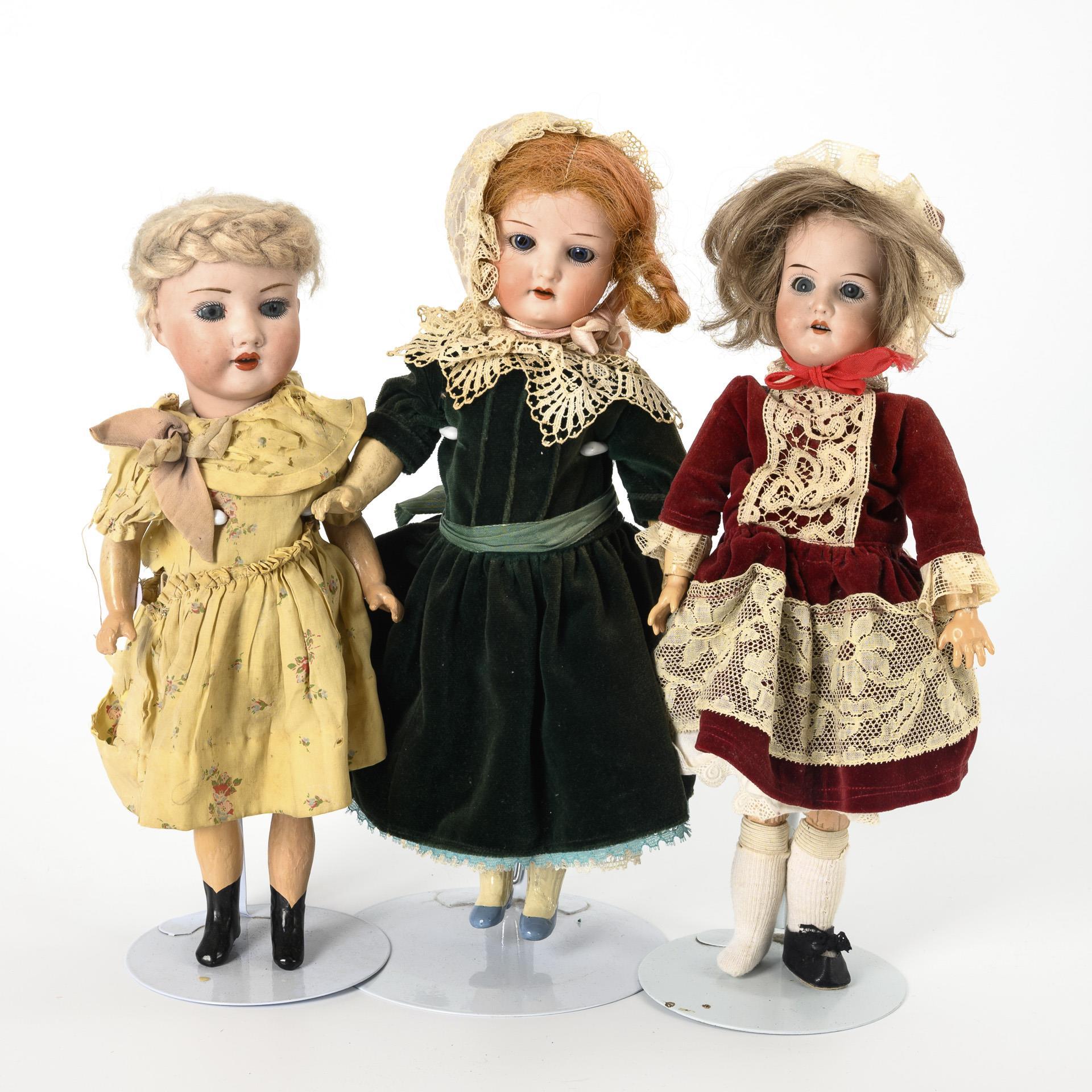 All with crank head, blue glass eyes and wig. 2x 5-part mass body with modeled and painted shoes, 1x 11-part articulated body. Dressed in green, red and cream. Worn, with signs of age and small defects.