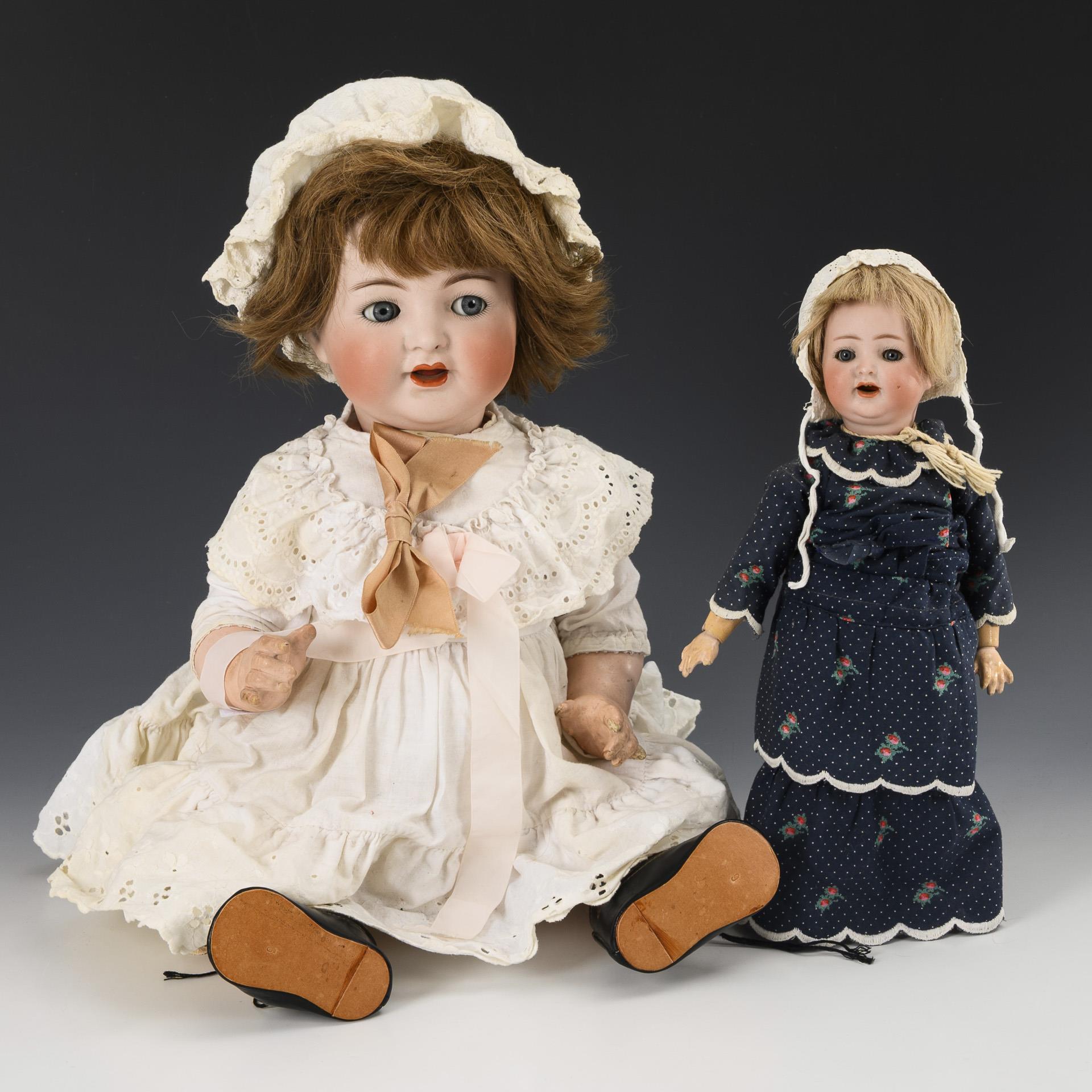 Both with crank head, blue eyes and blond human hair wig. Large baby with sleeping/sleeping eyes, 5-part sitting baby body, intact voice and white dress, L 52 cm. / Small doll with sleeping eyes, 15-part jointed body and dark blue dress, L 30 cm. Heads x-rayed: without defects. 1x body overpainted, 1x finger bumped.