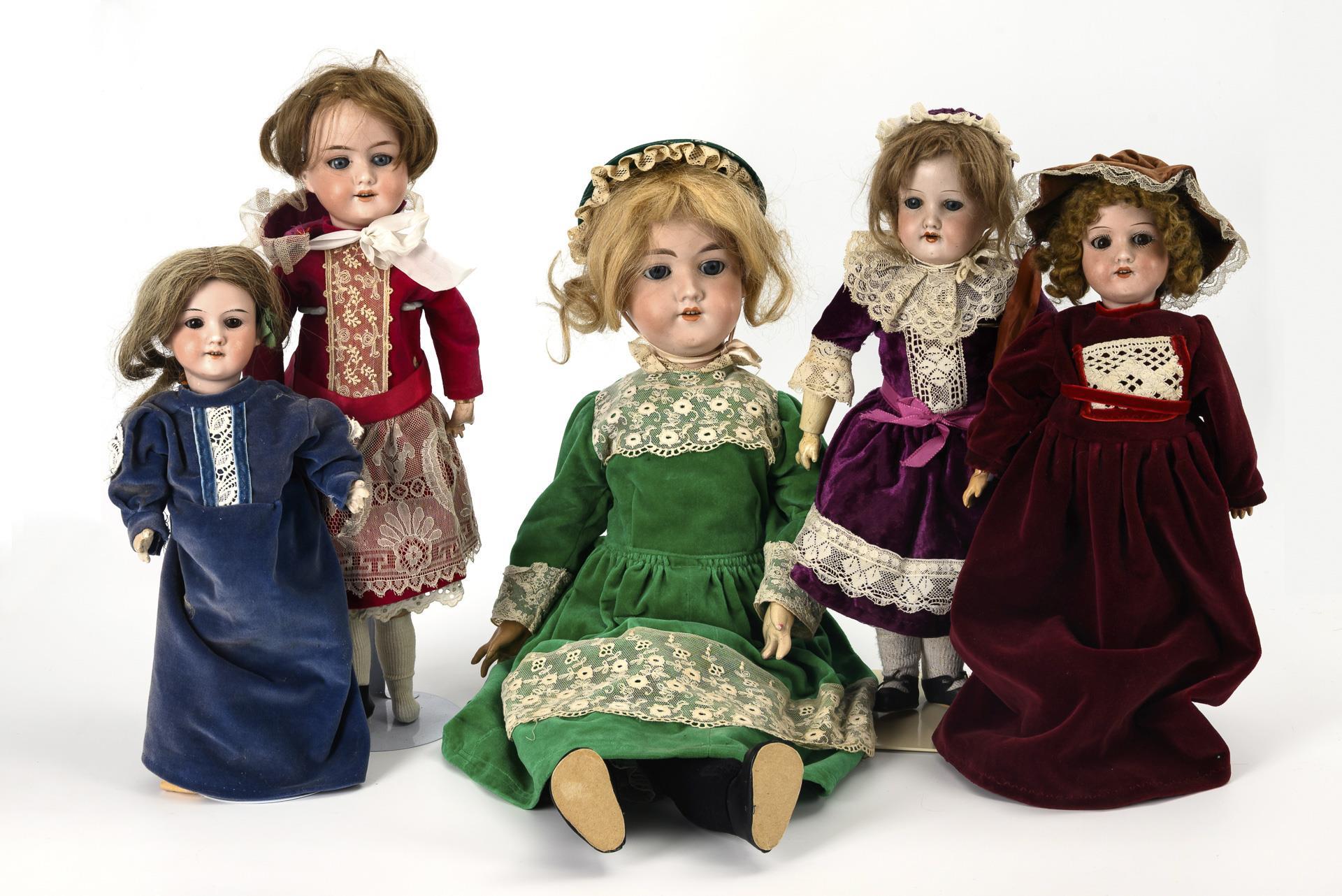 5 dolls in velvet dresses. Armand Marseille.