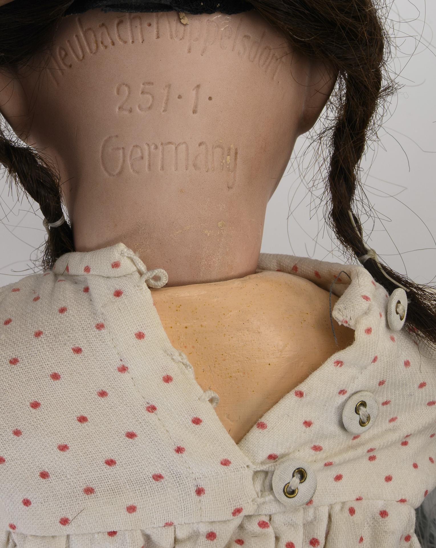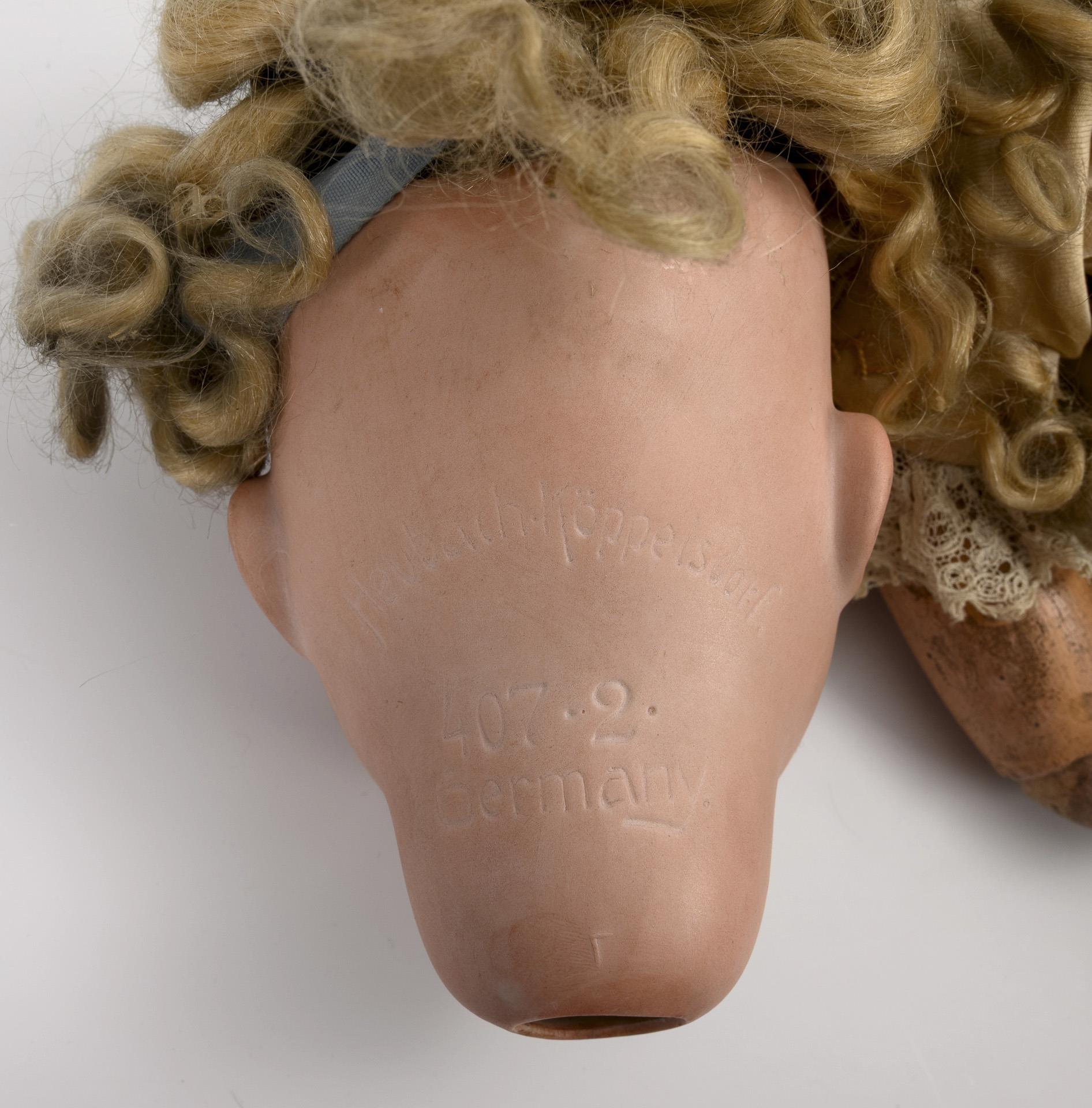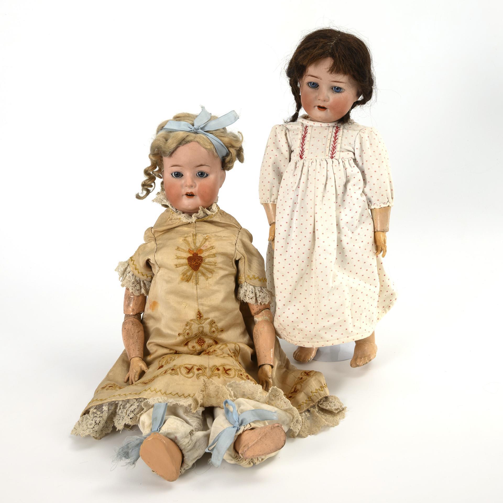 Both with crank head, blue sleeping eyes and jointed body. 1x disassembled: restored head no. 407 with blond mohair wig and cream-colored robe with embroidery. With hairline crack, severe defects and additions. L approx. 60 cm / 1x head no. 251 with brown pigtails, toddler body and white dress with pink dots. Wig solid: head not x-rayed, body with color defects, 1 finger missing. L 48 cm.