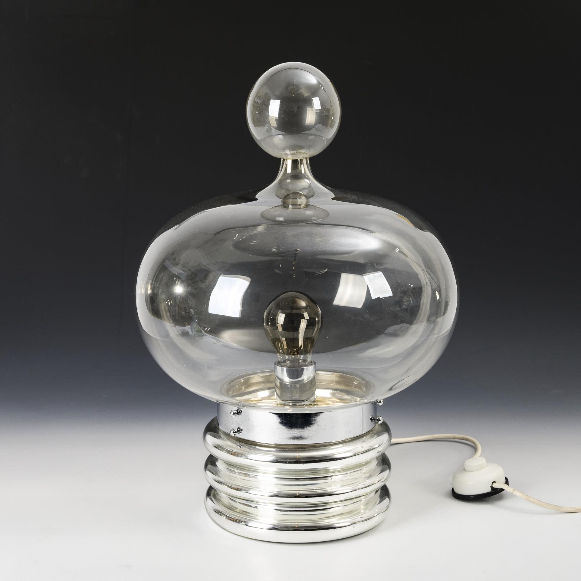 Ribbed glass base with mirror finish, chrome-plated sleeve, spherical glass body with attached spherical crown. Foot switch on white cable. Functioning.