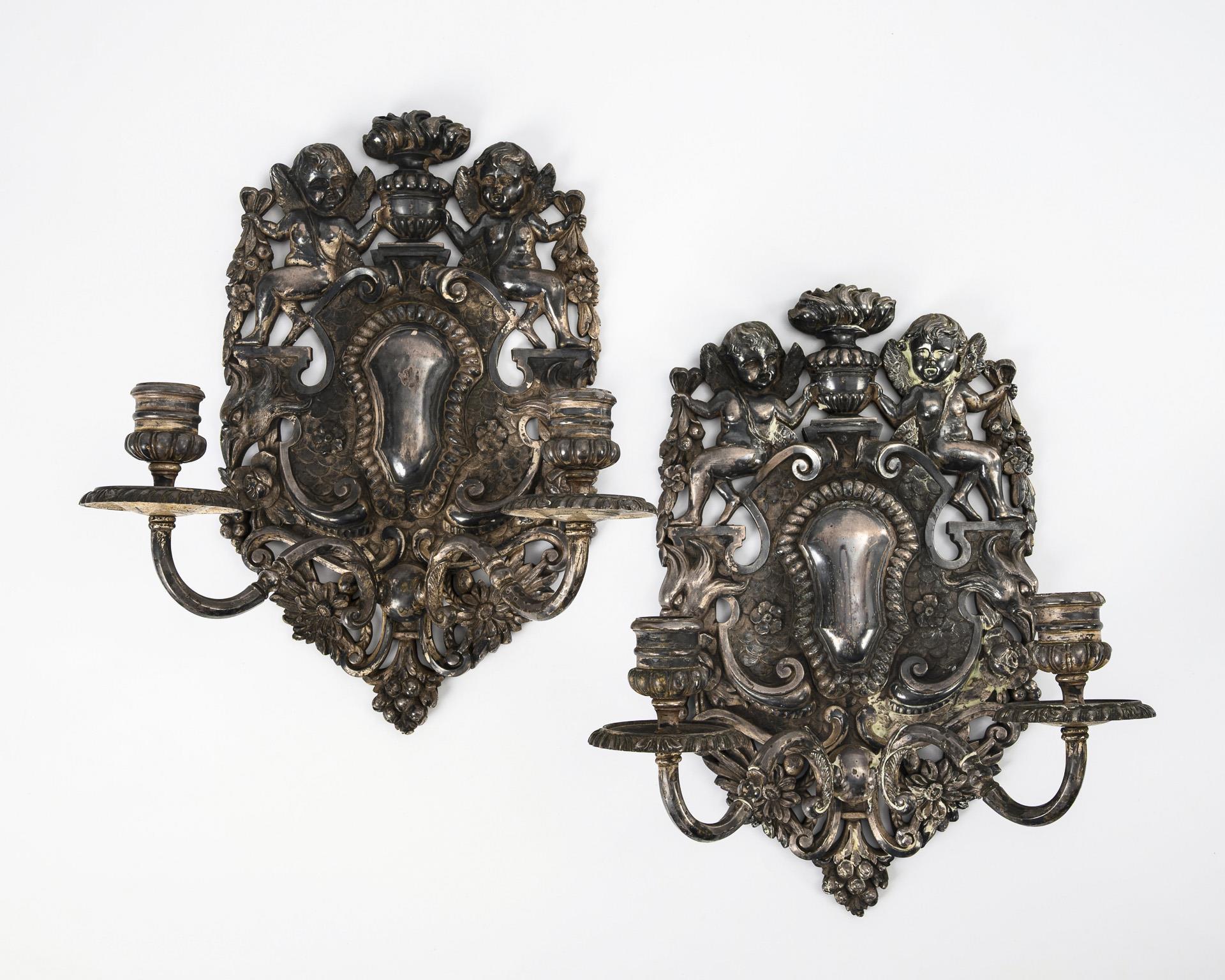 In the style of the 17th century, splendid wall plates in relief, each with an unengraved central cartouche, scrolls and floral decoration as well as eagle heads on the sides and crowning putti on the fire pot. 2 volute arms with vase nozzles over drip pans. Silver plating blackened and rubbed, some paint residue.