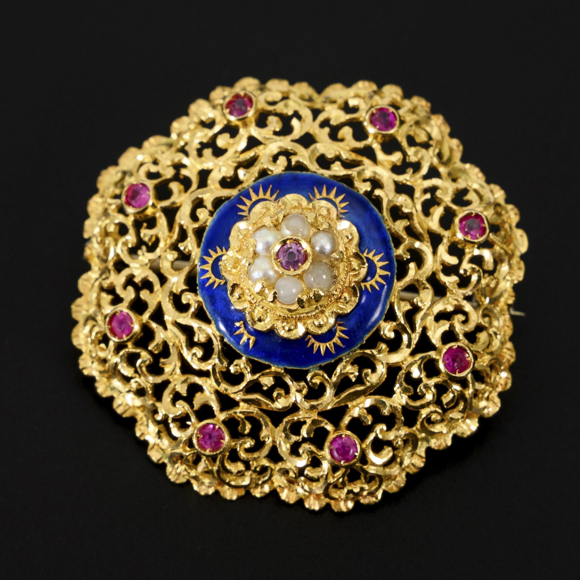 Delicately designed ornamental brooch, set with 6 pearls and small pink-colored stones, additionally decorated with blue enamelling.